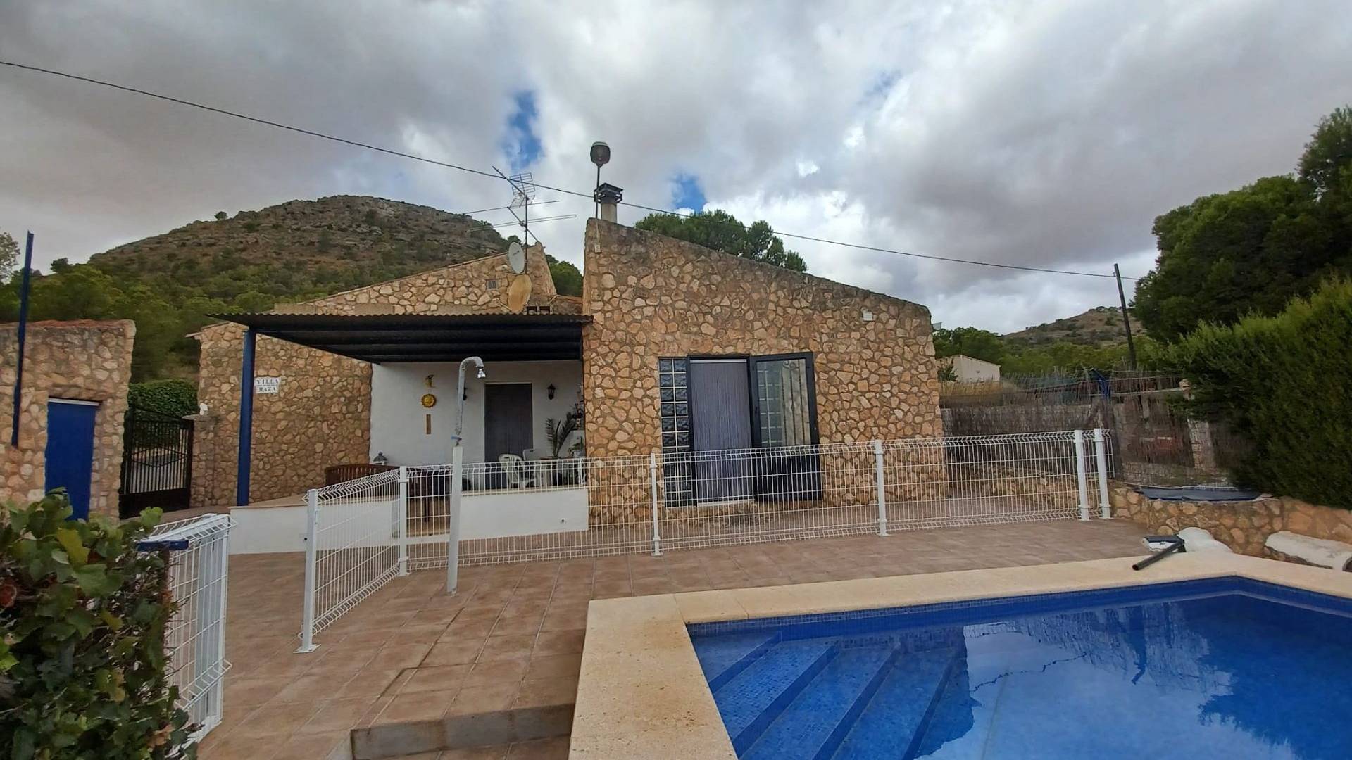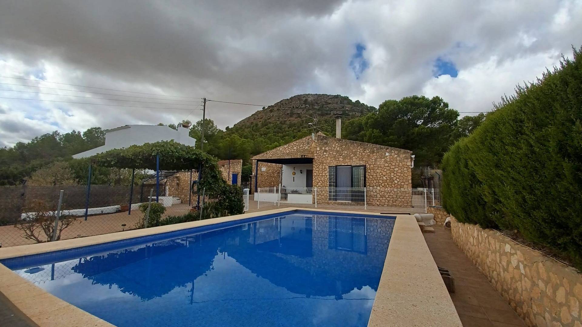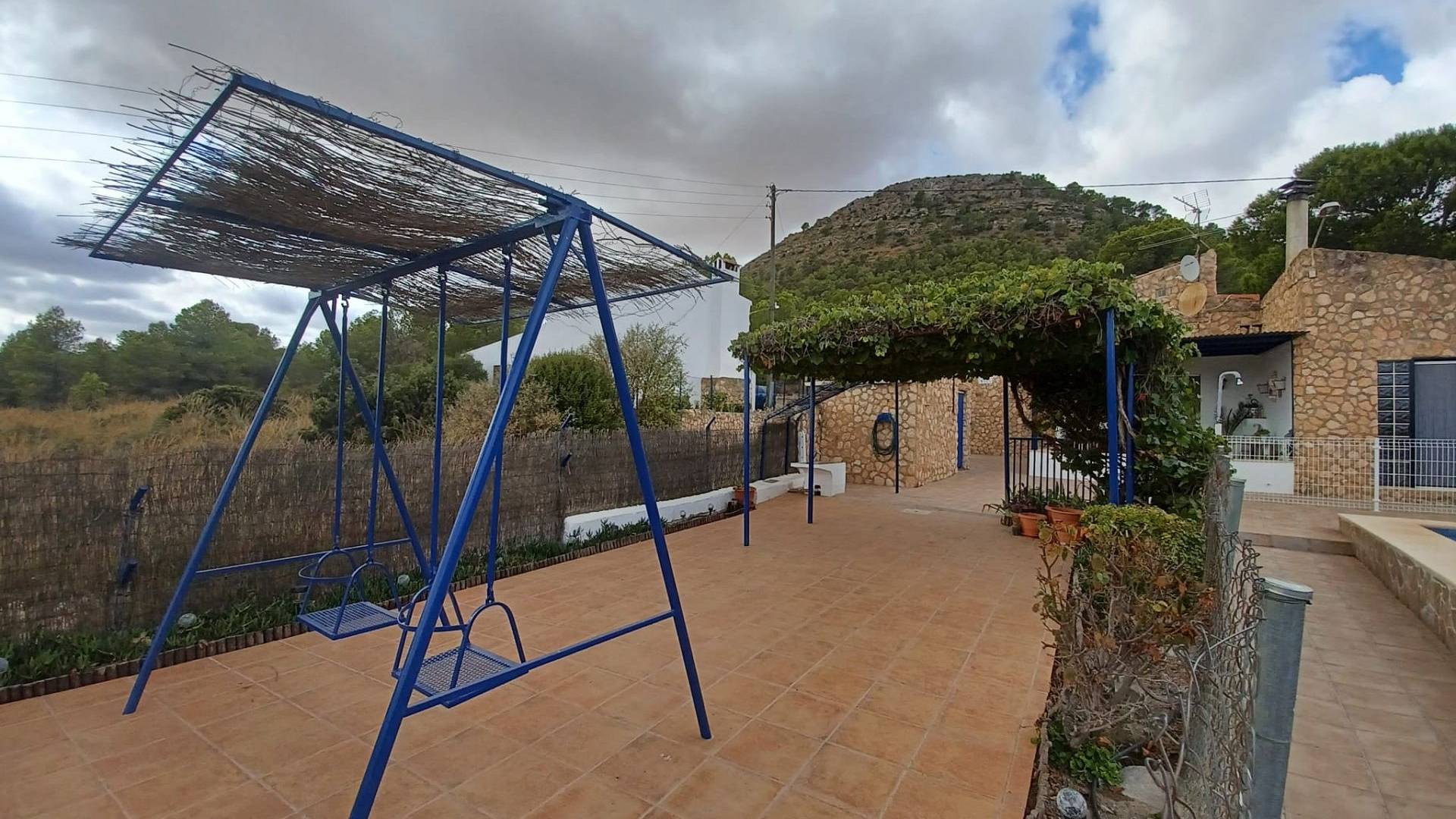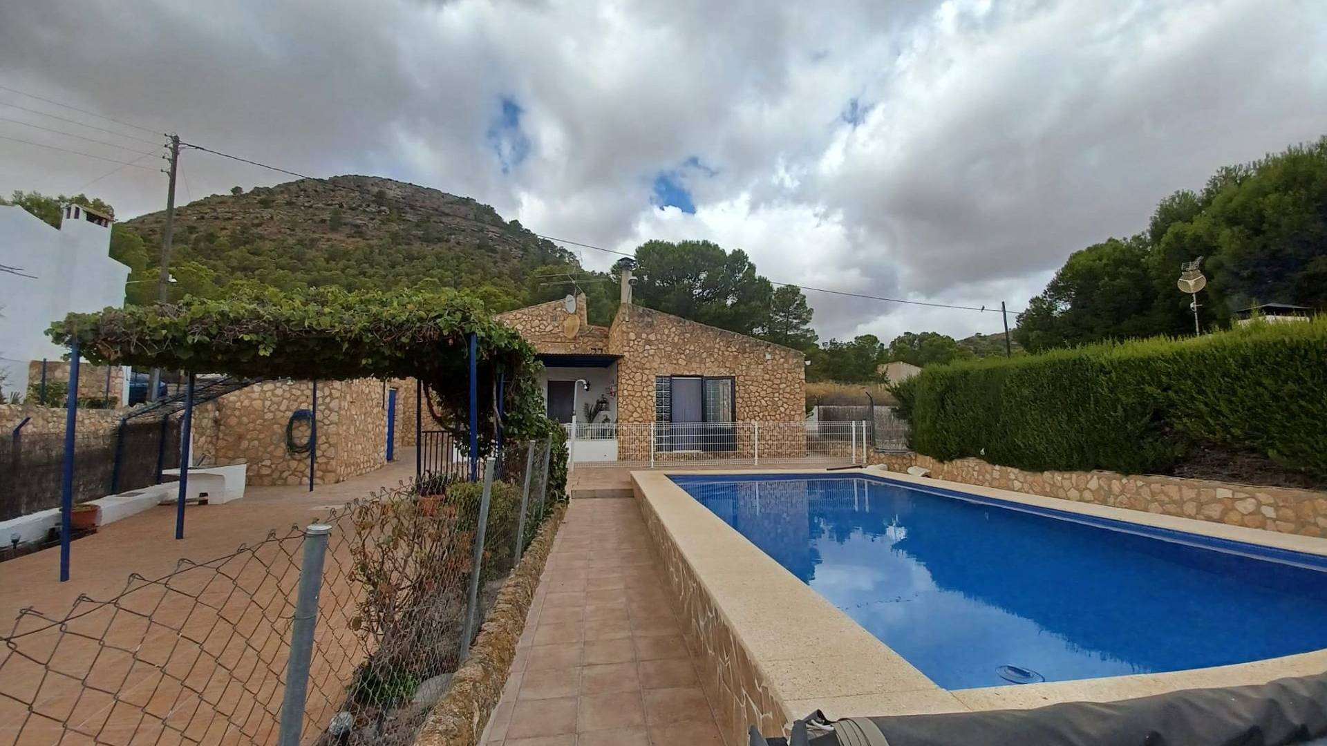 L’entrée principale se fait par un double portail. Une agréable terrasse couverte de vigne vous accueille et vous permet de profiter du soleil matinal. Une grande terrasse mène à la piscine de 9 m x 5 m, rénovée en 2023. L’ensemble de la piscine est clôturé (pour plus de sécurité) et comprend un petit local de rangement de 8 m² où vous pourrez ranger votre mobilier de jardin et où se trouve également le lave-linge. L’eau et l’électricité y sont donc disponibles.