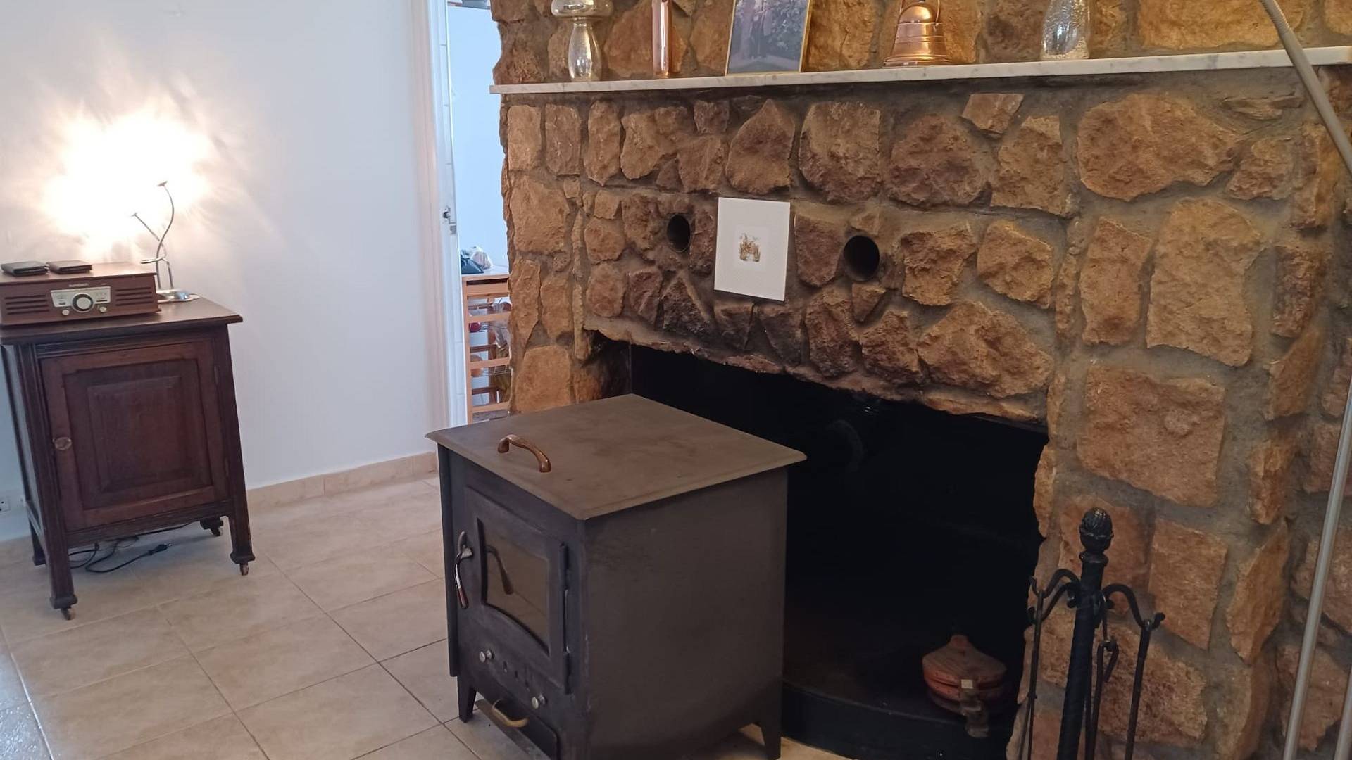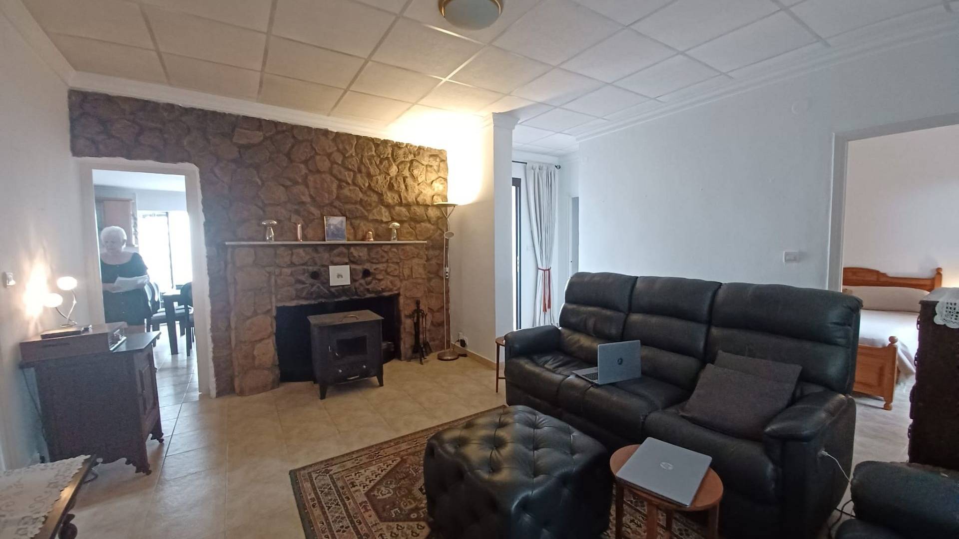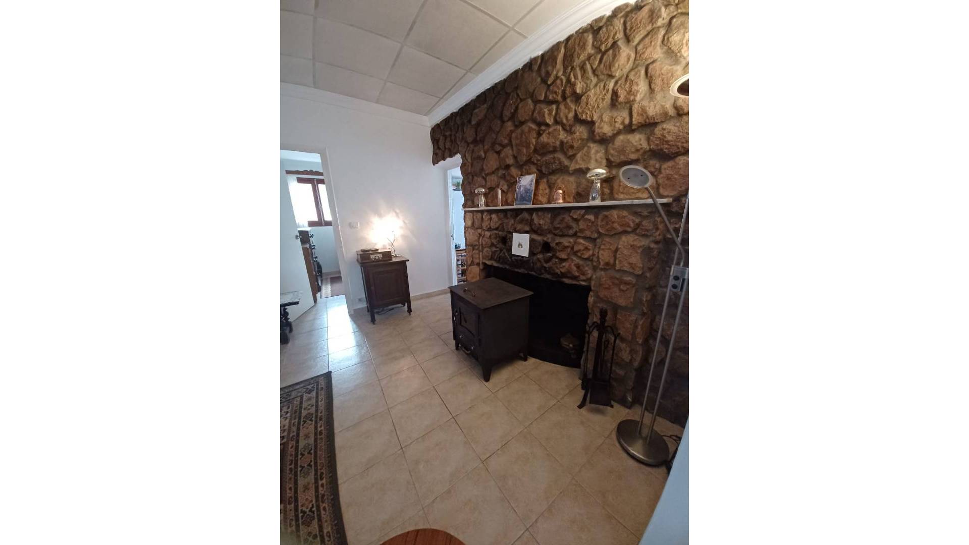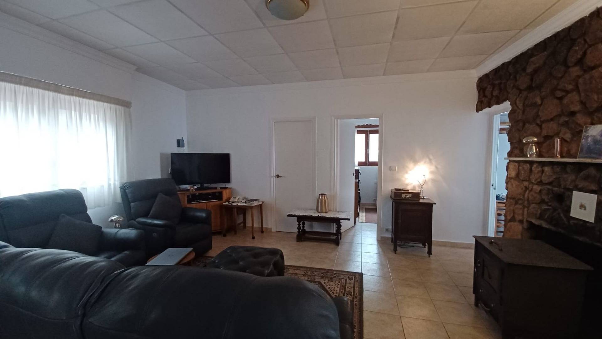 Le couloir donne sur le salon, agrémenté d'une grande cheminée et d'un poêle à bois. Une porte mène à la première chambre double. De l'autre côté du salon se trouvent deux autres portes donnant accès à la deuxième chambre double et à la troisième chambre simple.