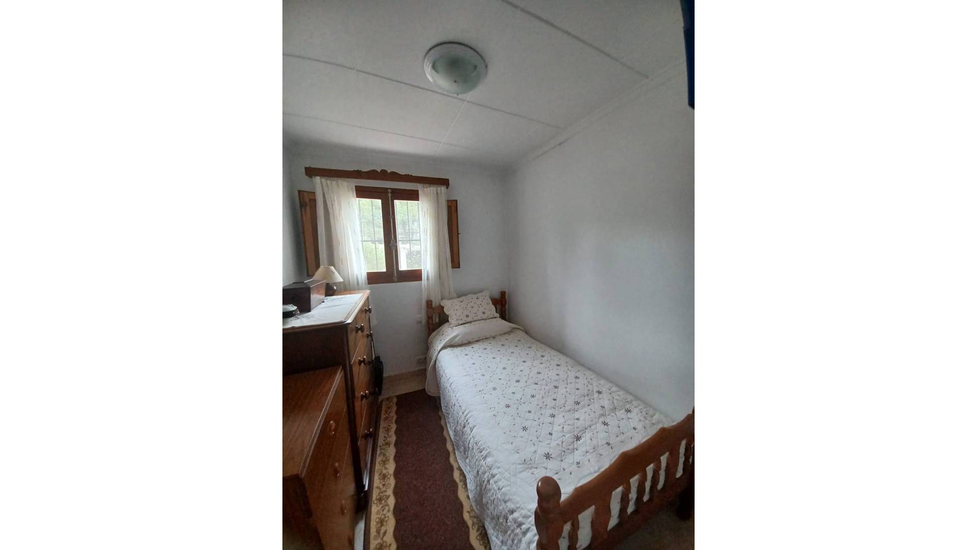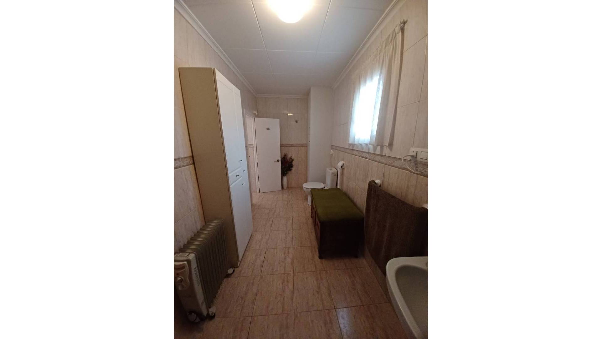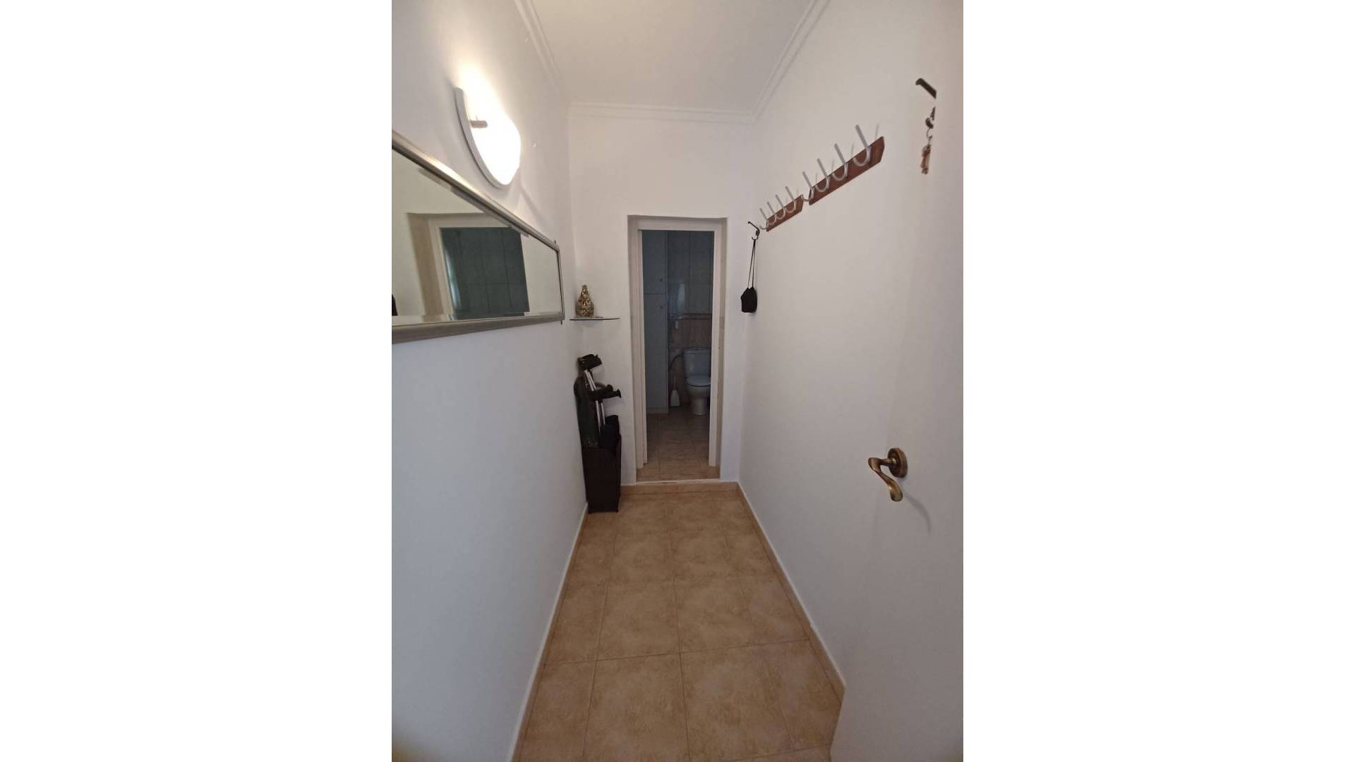 Un chemin fait le tour de la maison pour un accès facile et la toiture neuve est équipée de gouttières. L'entrée principale de la maison est abritée par un patio ombragé. On accède ensuite à un couloir avec une porte menant aux toilettes, puis à la grande salle de bains. Celle-ci est équipée d'un WC, d'un lavabo, d'une baignoire avec douche et d'un radiateur électrique. Le chauffe-eau électrique est dissimulé dans un grand placard.