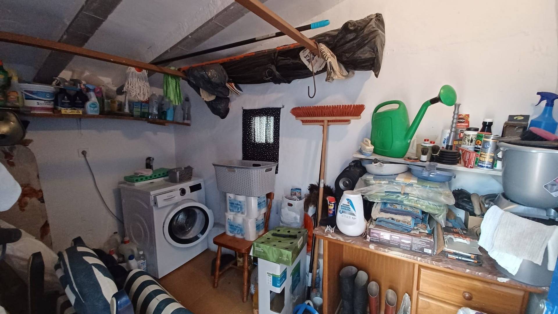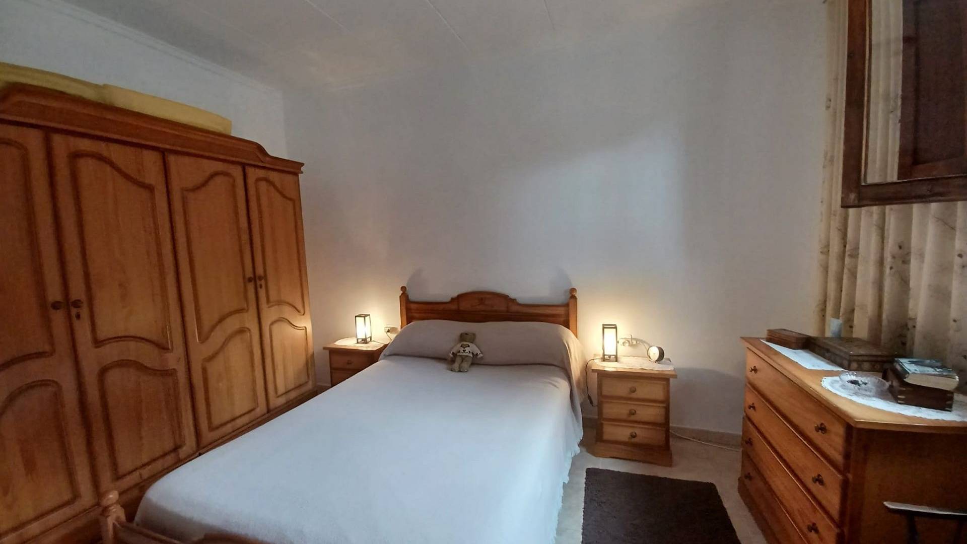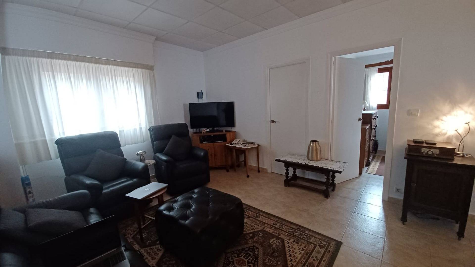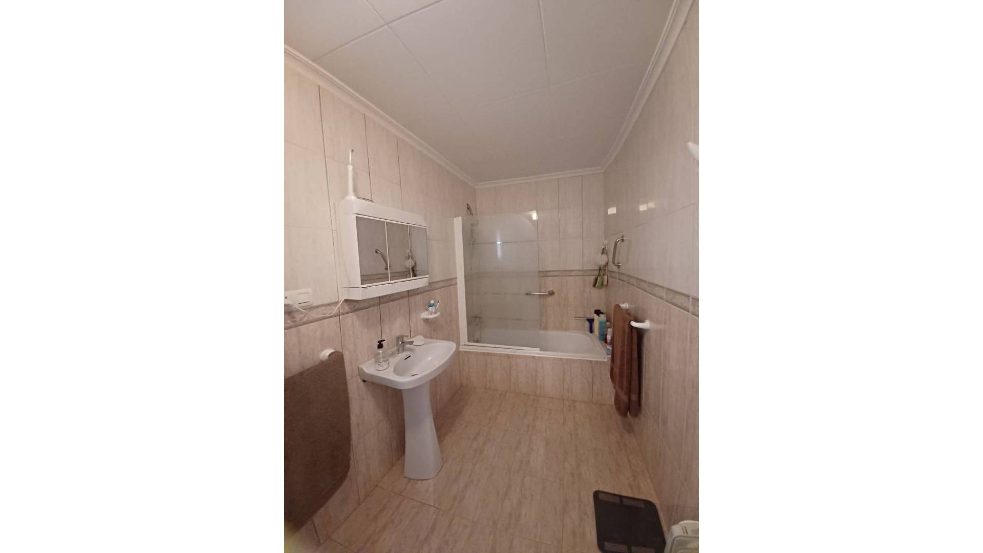 Un chemin fait le tour de la maison pour un accès facile et la toiture neuve est équipée de gouttières. L'entrée principale de la maison est abritée par un patio ombragé. On accède ensuite à un couloir avec une porte menant aux toilettes, puis à la grande salle de bains. Celle-ci est équipée d'un WC, d'un lavabo, d'une baignoire avec douche et d'un radiateur électrique. Le chauffe-eau électrique est dissimulé dans un grand placard.