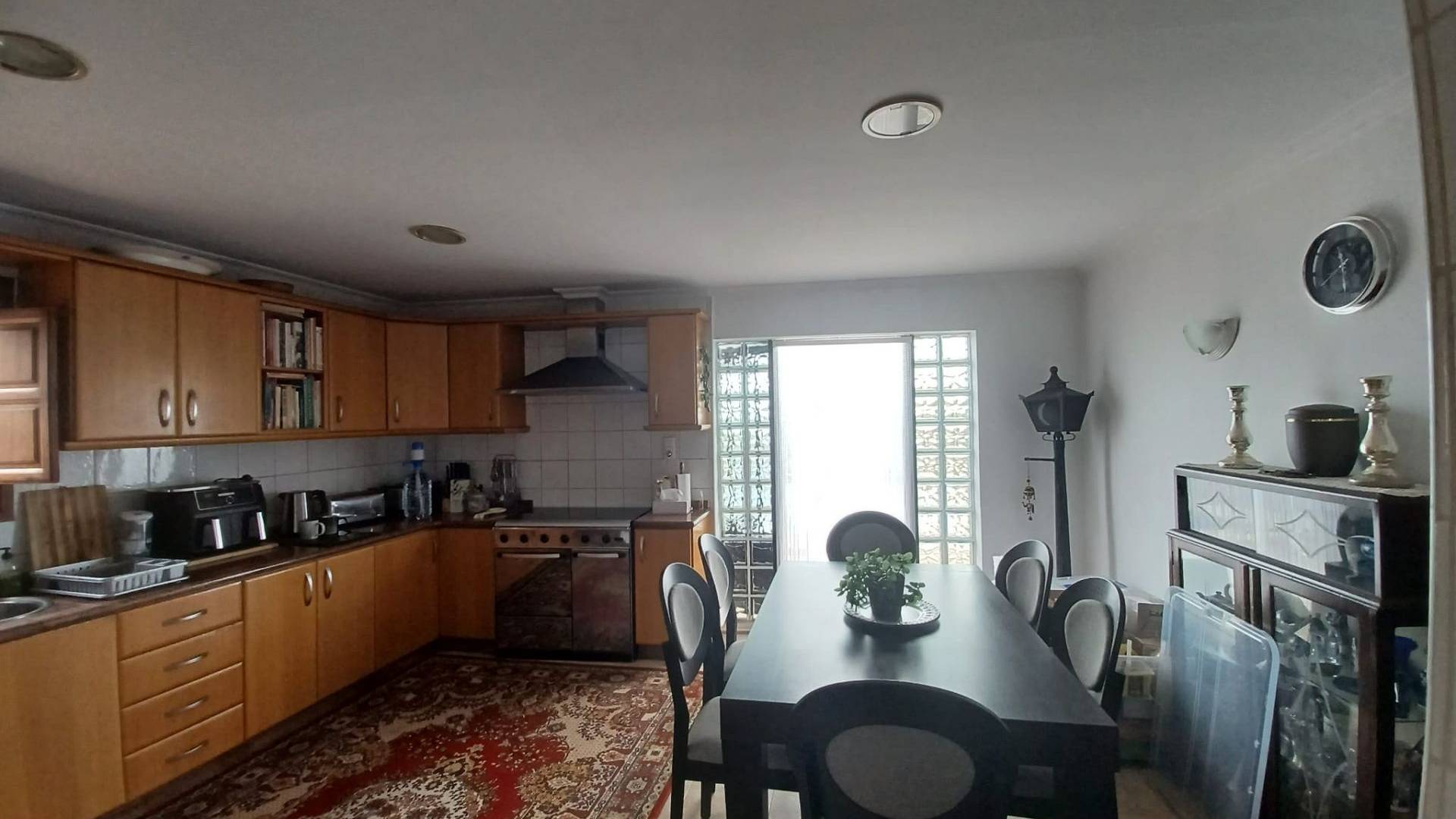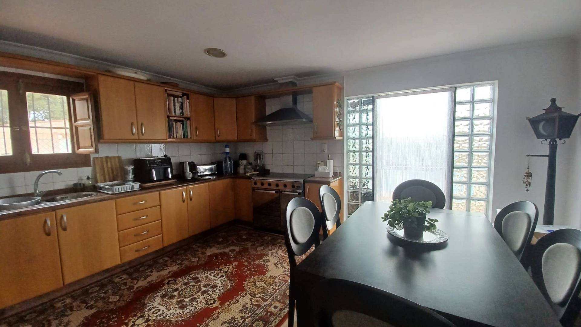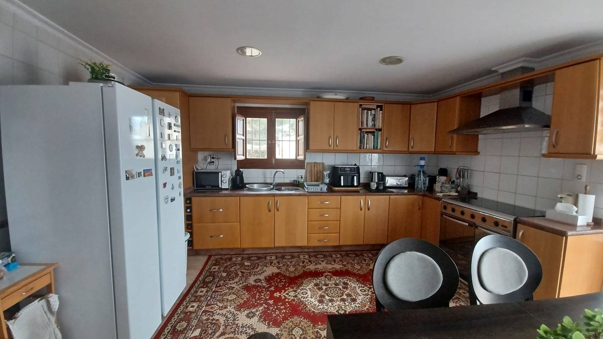 Le salon donne également sur la grande cuisine/salle à manger, entièrement équipée avec des meubles de cuisine intégrés et offrant suffisamment d'espace pour une table à manger. Tous les appareils électroménagers, dont un grand réfrigérateur-congélateur américain, sont fournis. Une porte de la cuisine permet d'accéder à la terrasse et à la piscine.