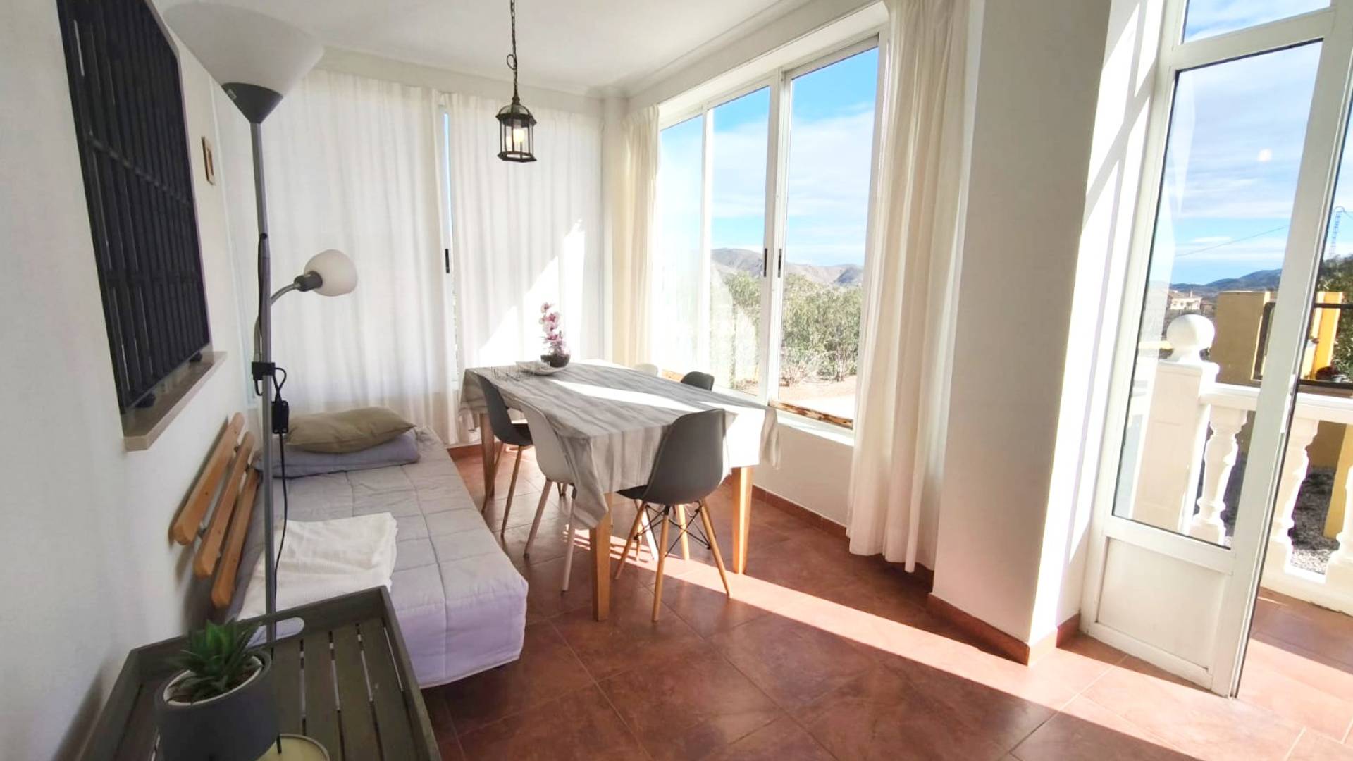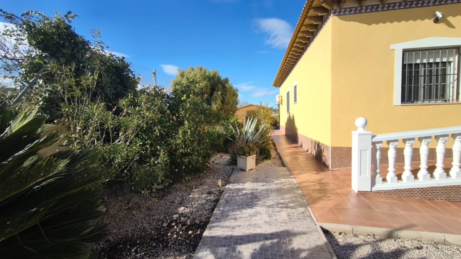 À l’extérieur, la propriété dispose d’une piscine privée, d’un porche vitré, parfait pour profiter du climat méditerranéen toute l’année, et d’une cabane en bois indépendante, actuellement utilisée comme espace de stockage. Le jardin, avec des arbres fruitiers et des palmiers, crée une ambiance verte et accueillante, idéale pour profiter de l’extérieur.