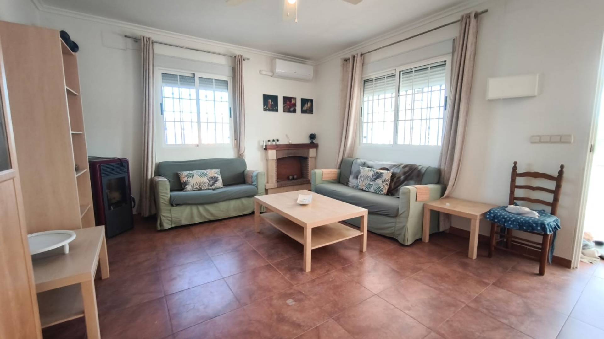 À l’intérieur, la villa offre un salon-salle à manger spacieux et lumineux avec cheminée et climatisation, créant un espace chaleureux et confortable. La cuisine entièrement équipée avec électroménagers est prête à l’emploi. La maison comprend trois chambres et deux salles de bain, soigneusement agencées pour offrir un confort optimal aux résidents et aux visiteurs.