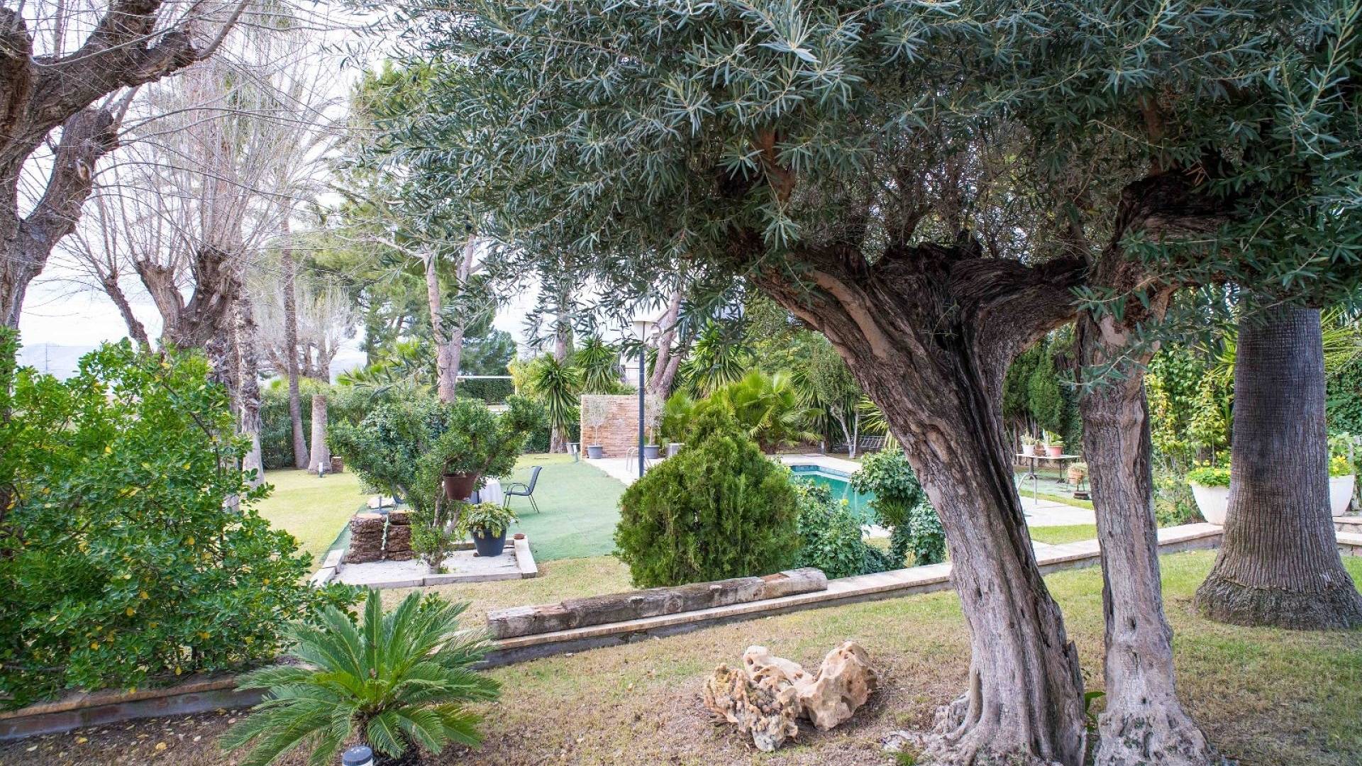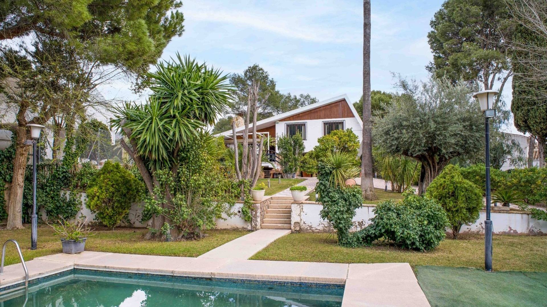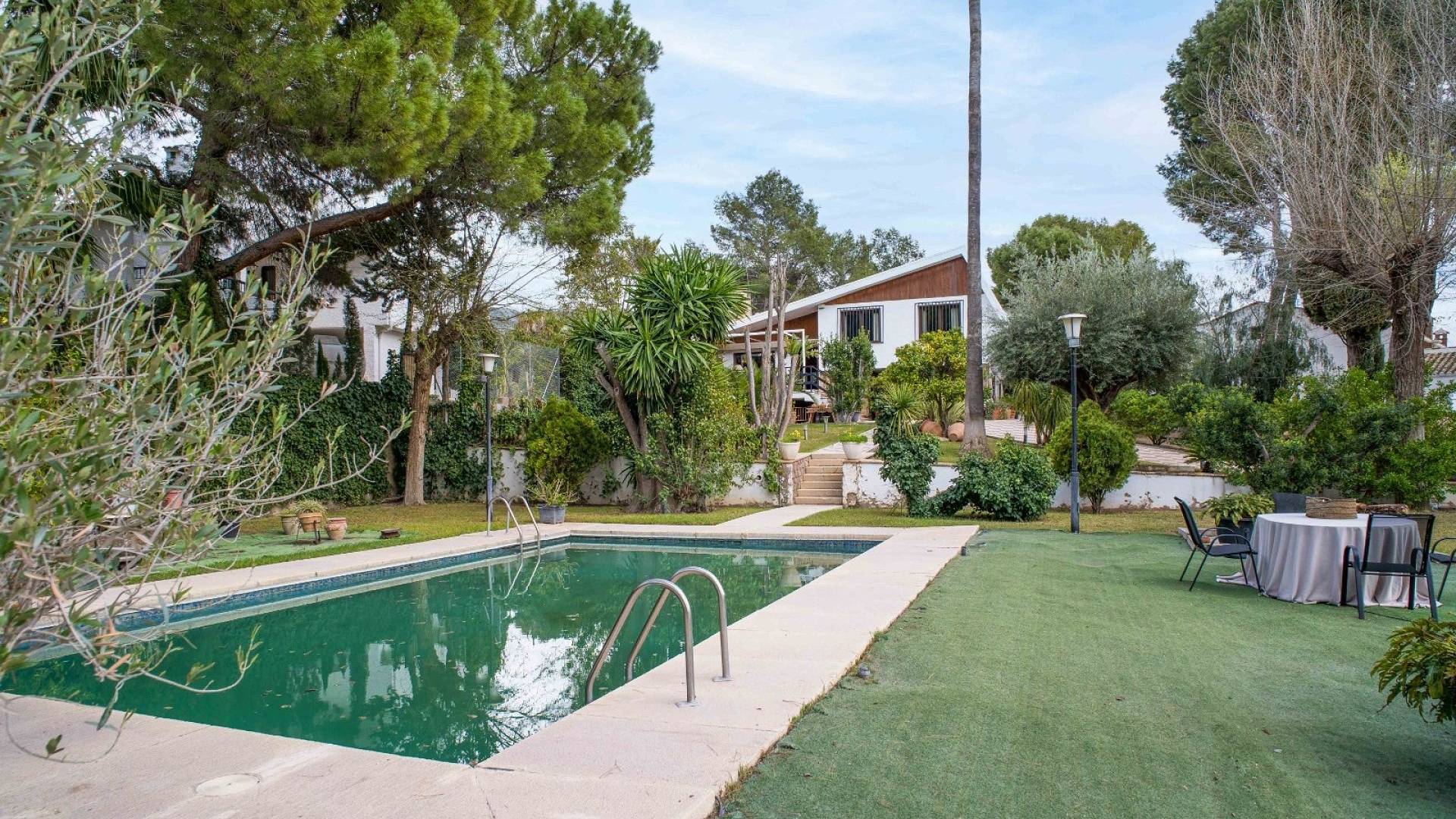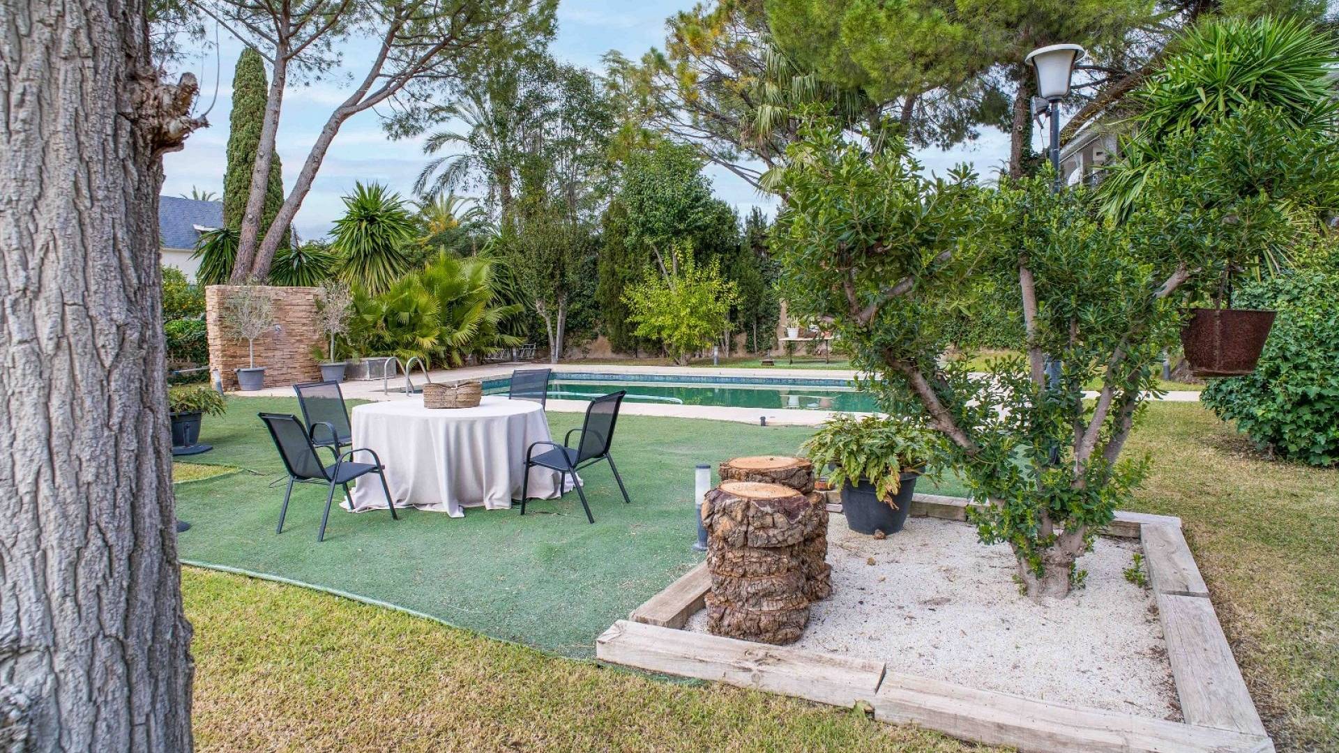 L'espace extérieur est soigneusement aménagé avec une pelouse, des palmiers matures et divers coins détente. La piscine d'environ 56 m² (enregistrée comme piscine sportive) constitue la pièce maîtresse du jardin. On y trouve un espace pour les repas en plein air, un coin barbecue et plusieurs terrasses offrant soleil et ombre.