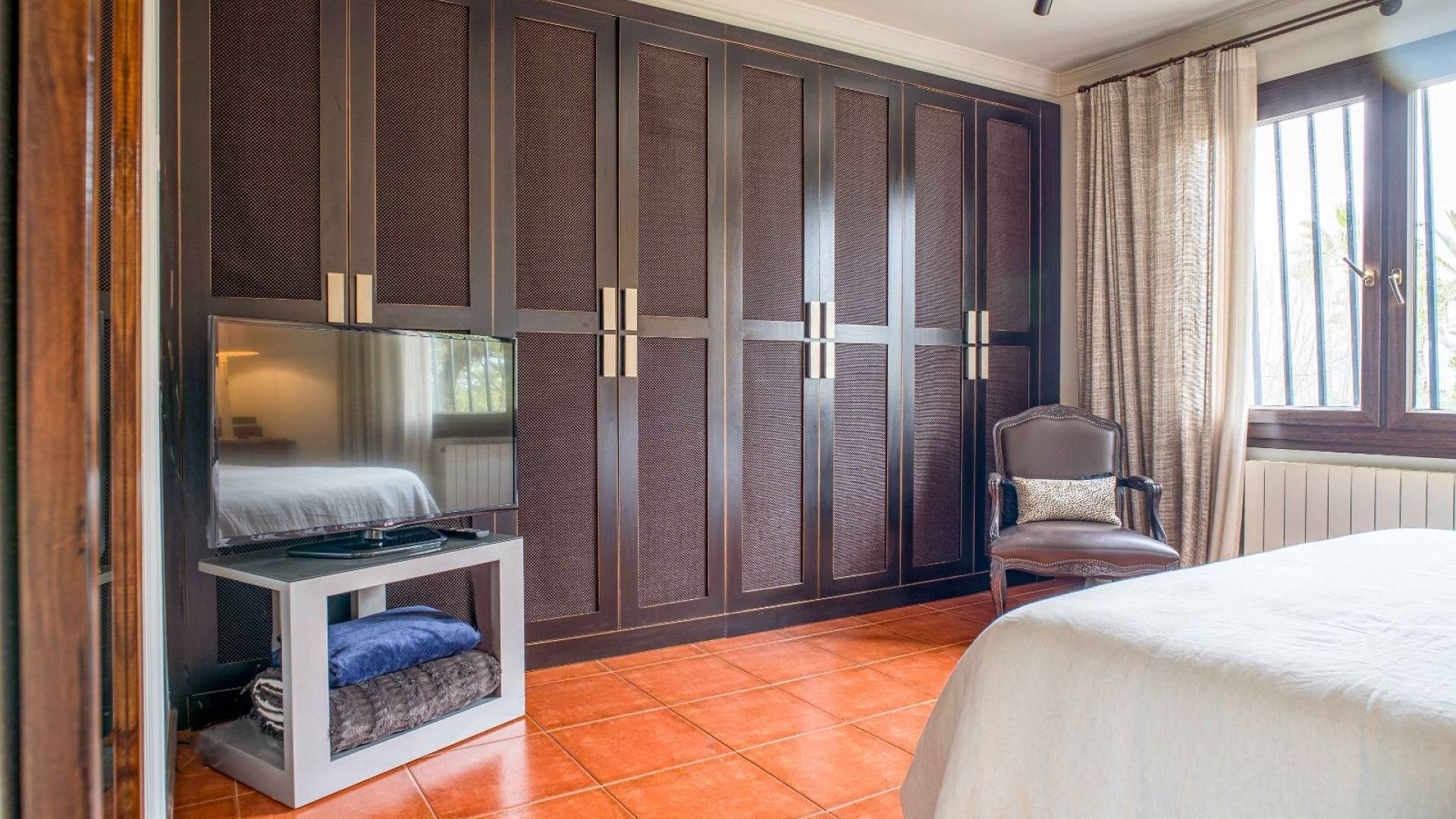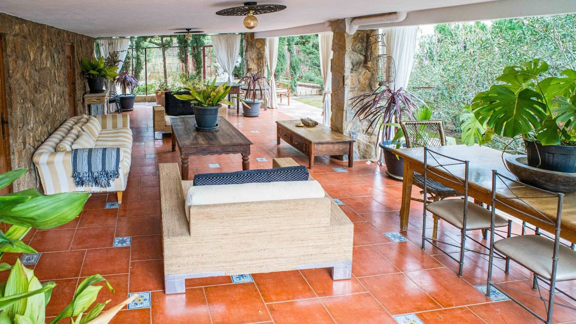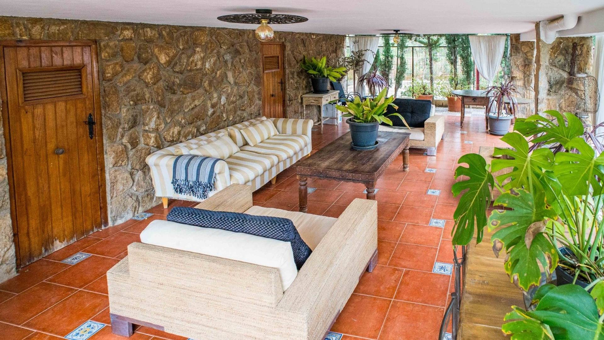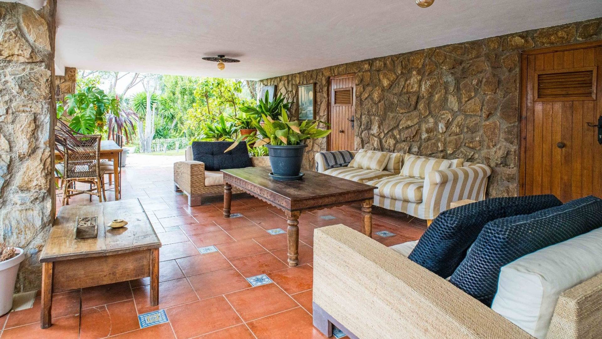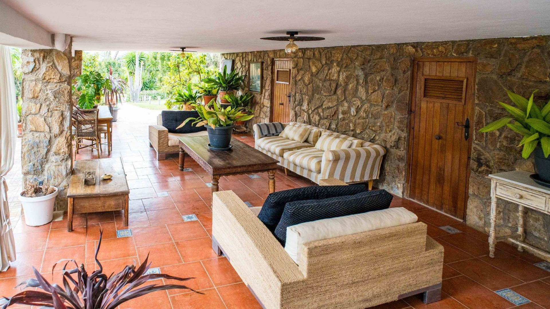 L'espace extérieur est soigneusement aménagé avec une pelouse, des palmiers matures et divers coins détente. La piscine d'environ 56 m² (enregistrée comme piscine sportive) constitue la pièce maîtresse du jardin. On y trouve un espace pour les repas en plein air, un coin barbecue et plusieurs terrasses offrant soleil et ombre.