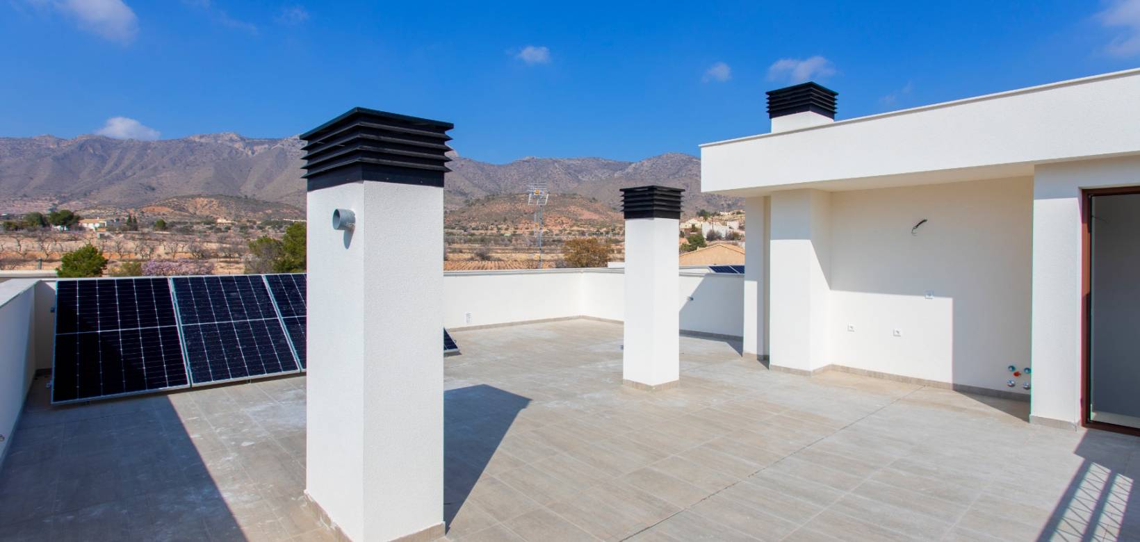 Les propriétés sont disponibles au rez-de-chaussée avec terrasse/jardin avant et arrière et au premier étage avec terrasse et solarium privé. Les immeubles du premier étage sont équipés de panneaux photovoltaïques sur le toit pour économiser de l'énergie. Les cuisines sont entièrement équipées et dotées de plans de travail en granit ou en aggloméré synthétique (silestone ou similaire). Les salles de bains sont équipées d'appareils sanitaires et de robinets de haute qualité avec réservoir de chasse intégré. Ces maisons sont pré-installées pour la climatisation avec pompe à chaleur, la ventilation forcée avec récupération de chaleur, le système aérothermique pour l'eau chaude sanitaire, l'isolation thermique et acoustique la plus moderne, la menuiserie extérieure en aluminium avec rupture de pont thermique et les volets.