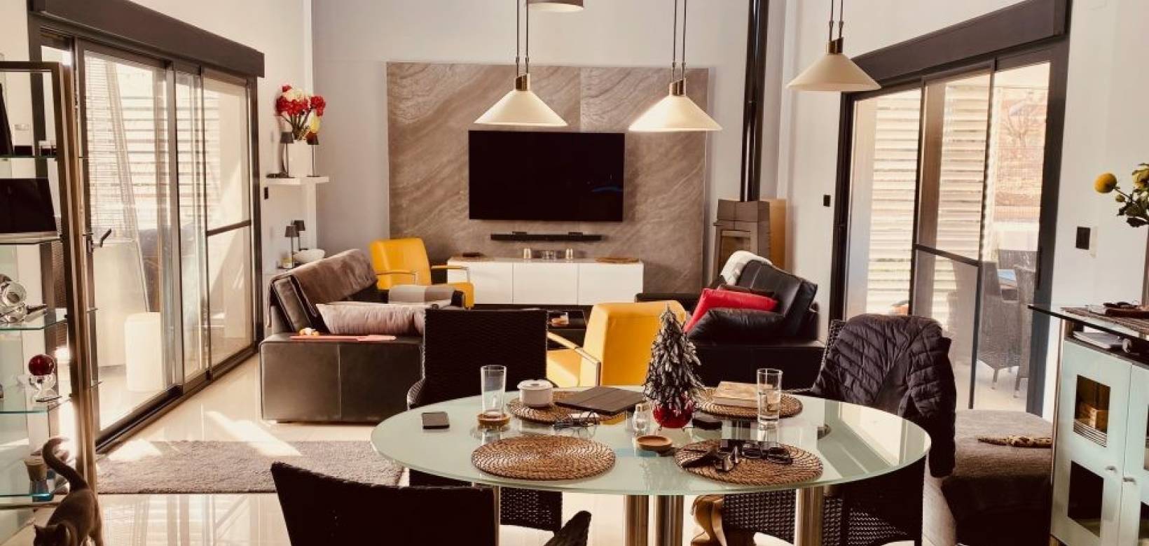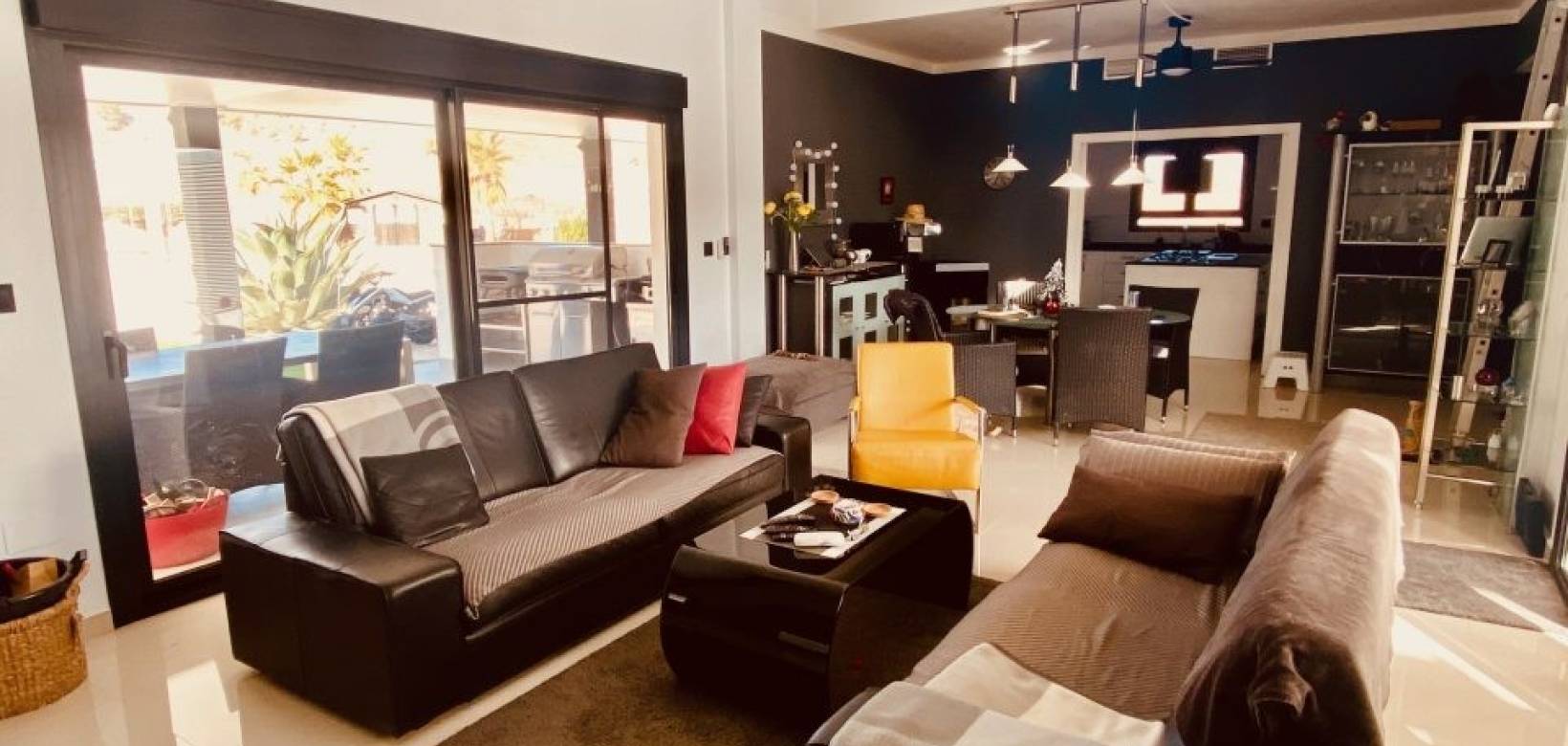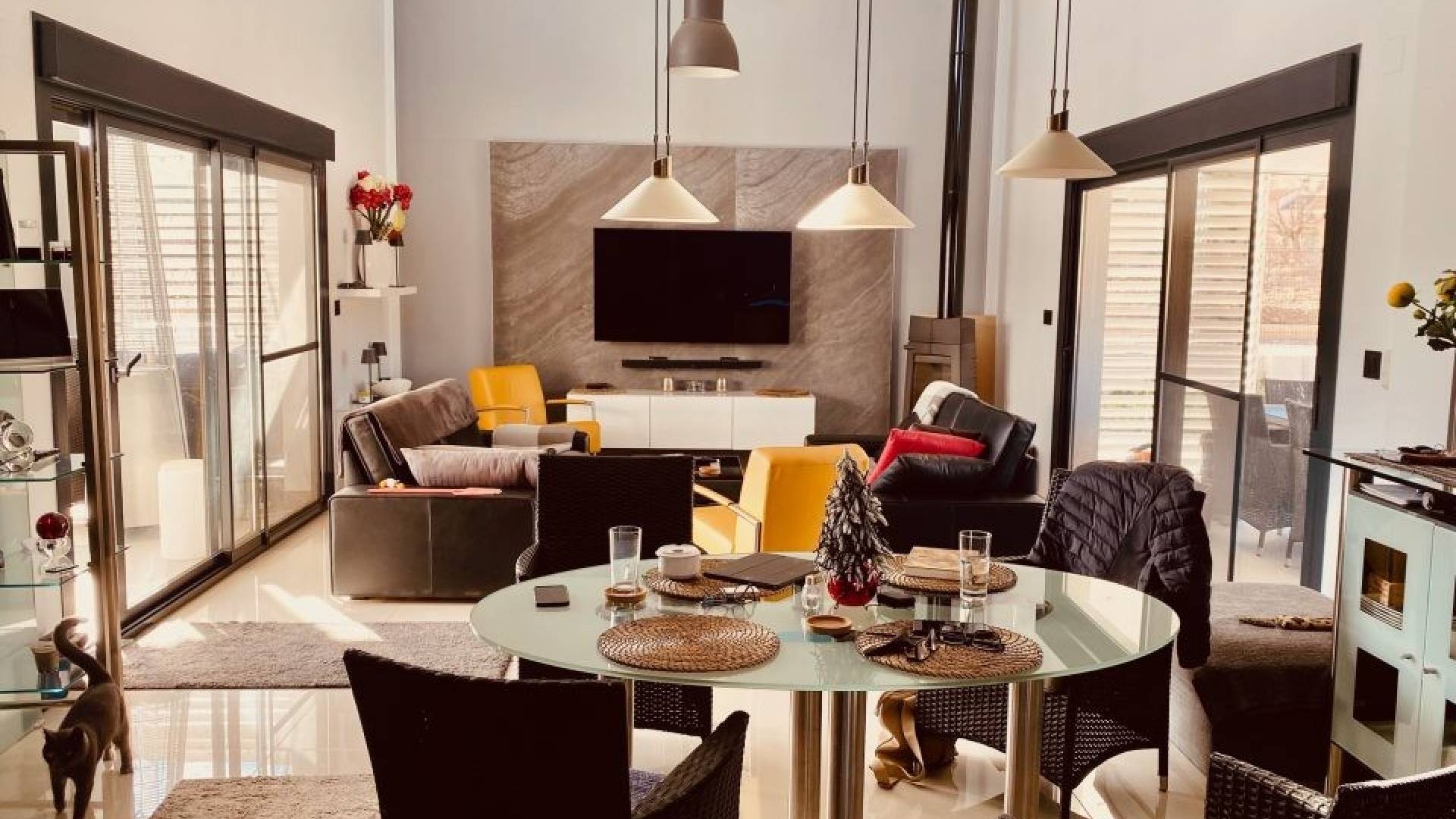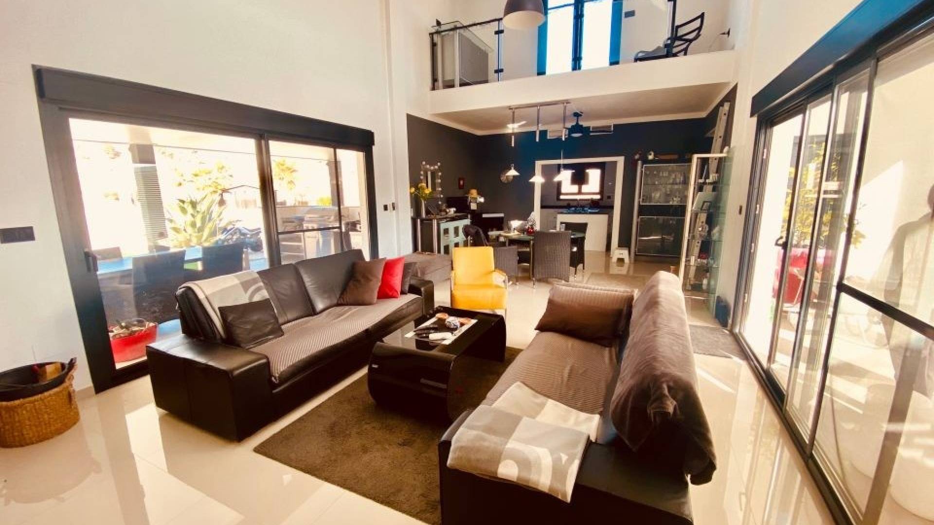 De villa van 162m² heeft een woon/eetkamer met plafonds tot 6m, wat het een onvergelijkbare charme geeft. In de woonkamer is er een mezzanine die gebruikt kan worden als kantoor of bibliotheek. De prachtige volledig uitgeruste keuken met kookeiland geeft direct uit op de eetkamer, en de bijkeuken heeft een deur die uitkomt op de tuin. Een kleine hal leidt naar de 3 slaapkamers en twee badkamers, waarvan een en-suite. De hoofdslaapkamer heeft een grote kleedkamer. Twee van de slaapkamers kijken uit op het moderne zwembad van 10x5m.