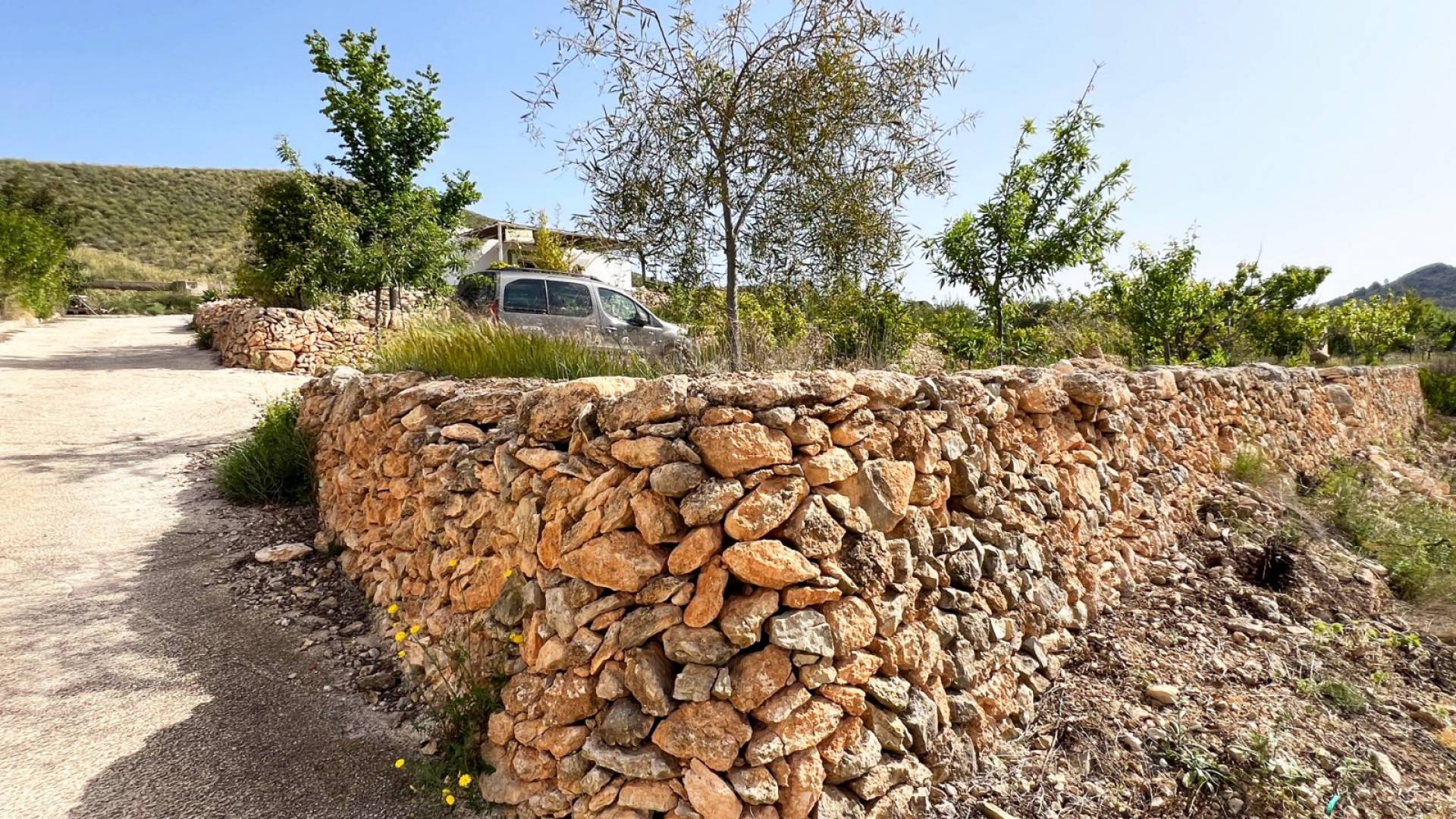 De drooggestapelde stenen muurtjes die het terrein omzomen zijn een traditionele bouwwijze van grote erfgoedwaarde, een symbool van lokale plattelandsarchitectuur.