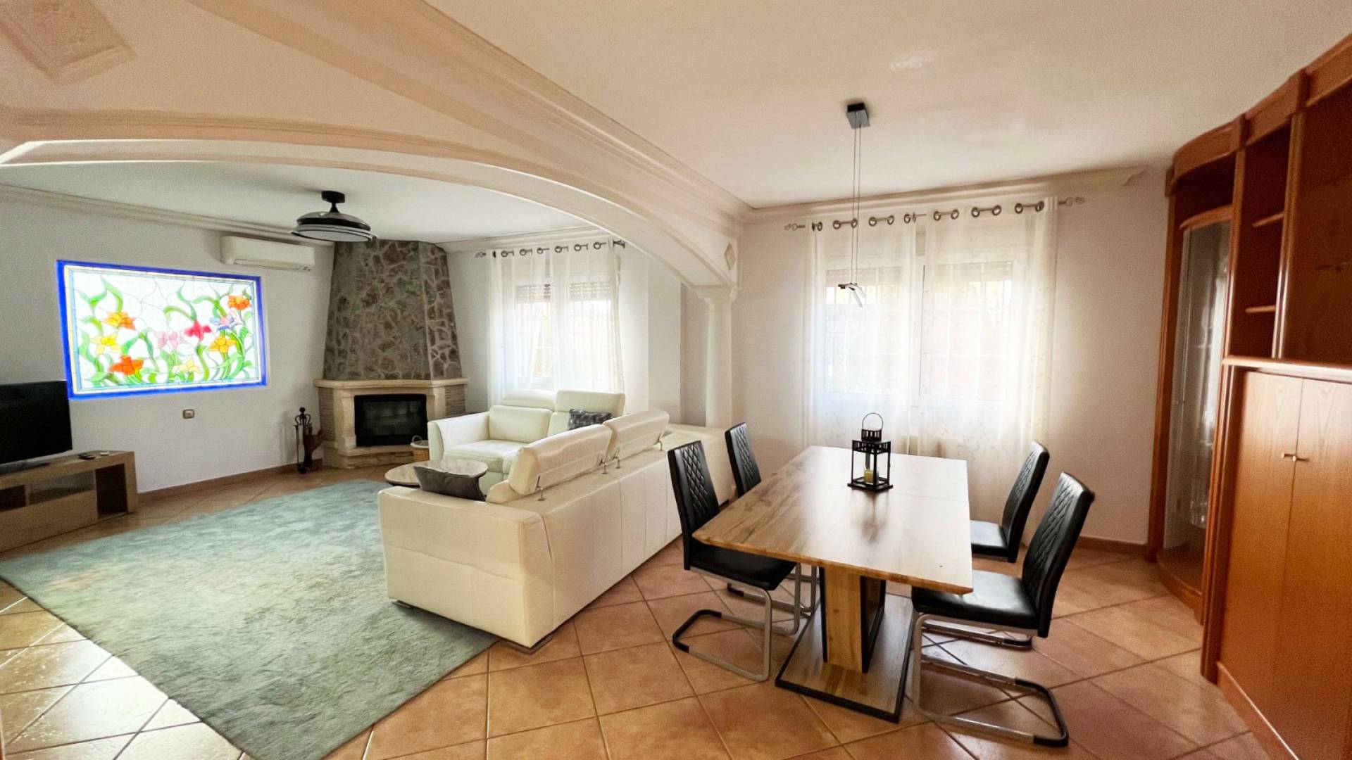 Eetkamer met airconditioning en geventileerde houtkachel.