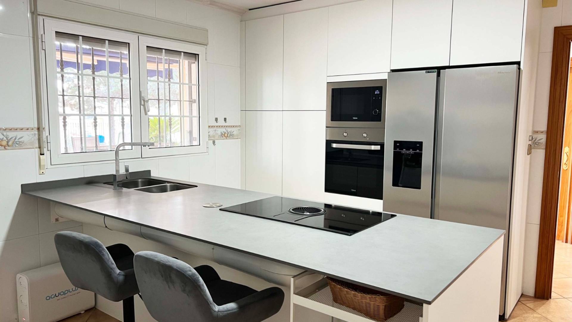 Volledig gerenoveerde keuken 2023 met inductiekookplaat, Amerikaanse koelkast, vaatwasser, oven, magnetron, centrale stofzuiger en voorraadkast.