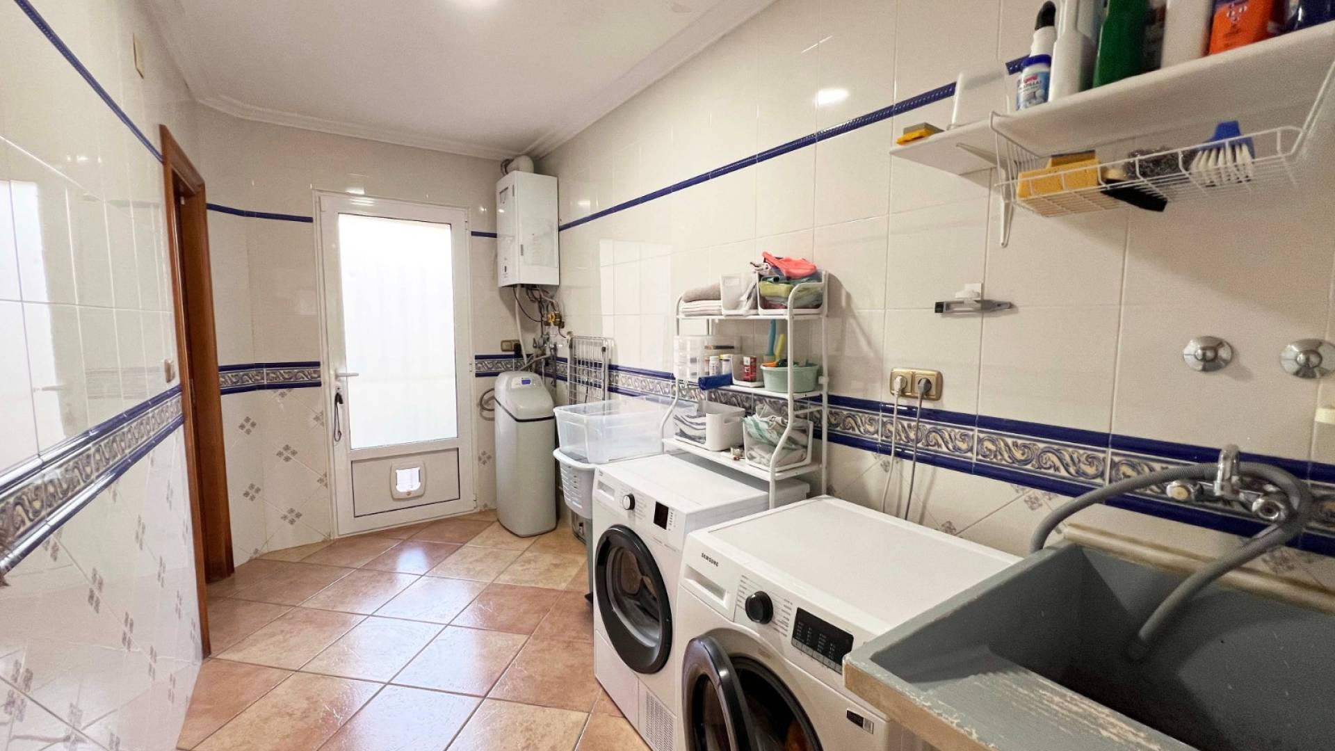 Bijkeuken met nieuwe boiler, waterontharder, wasmachine en droger (2023).
