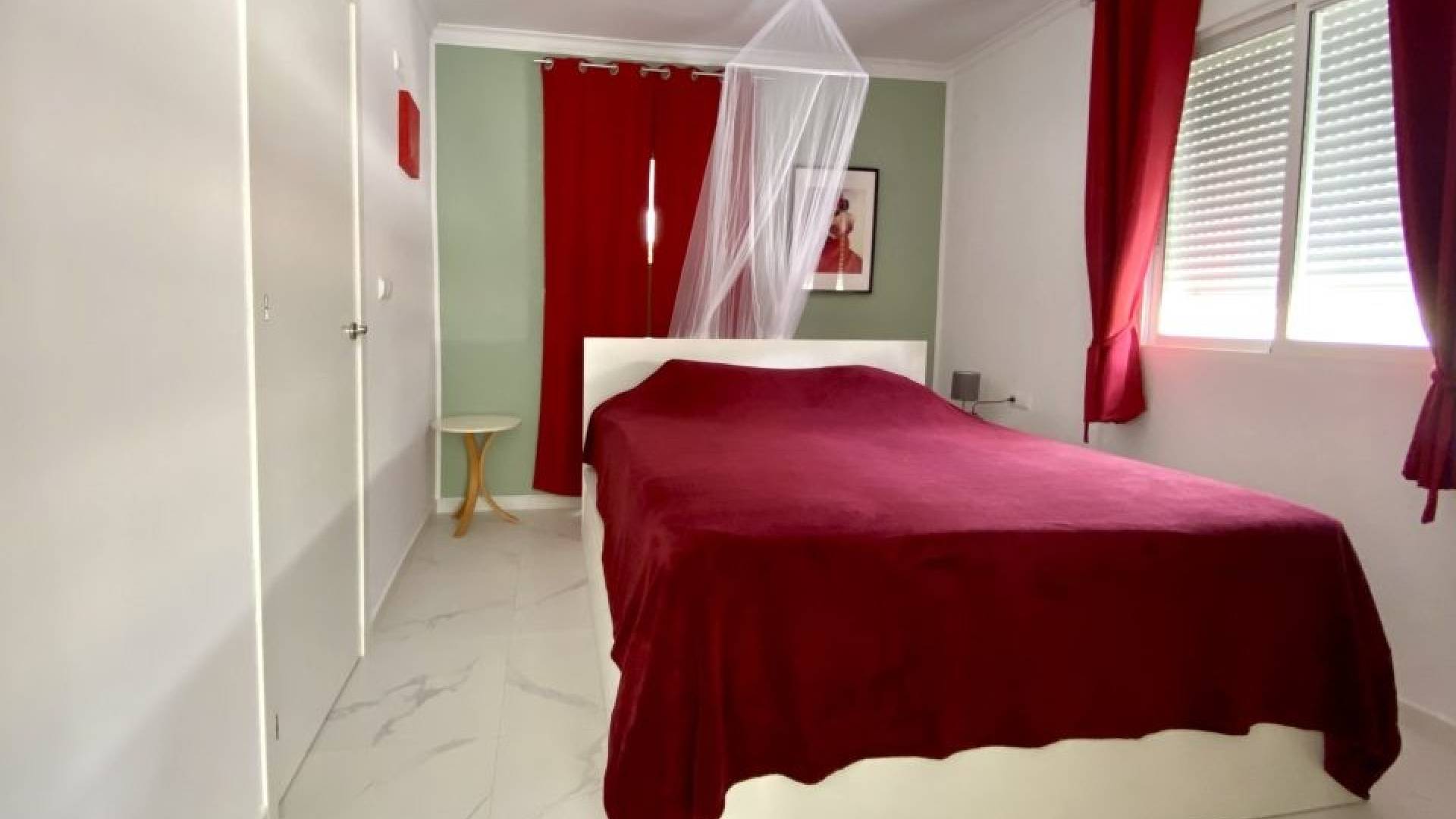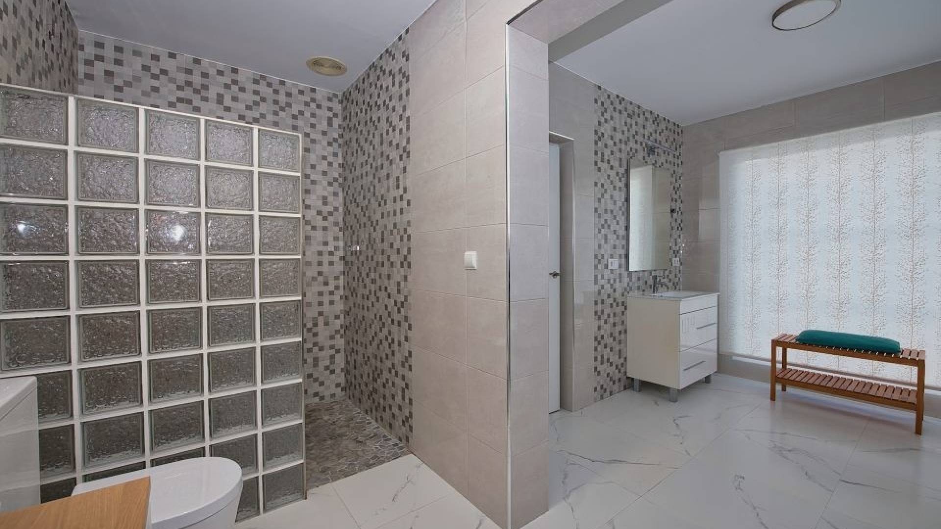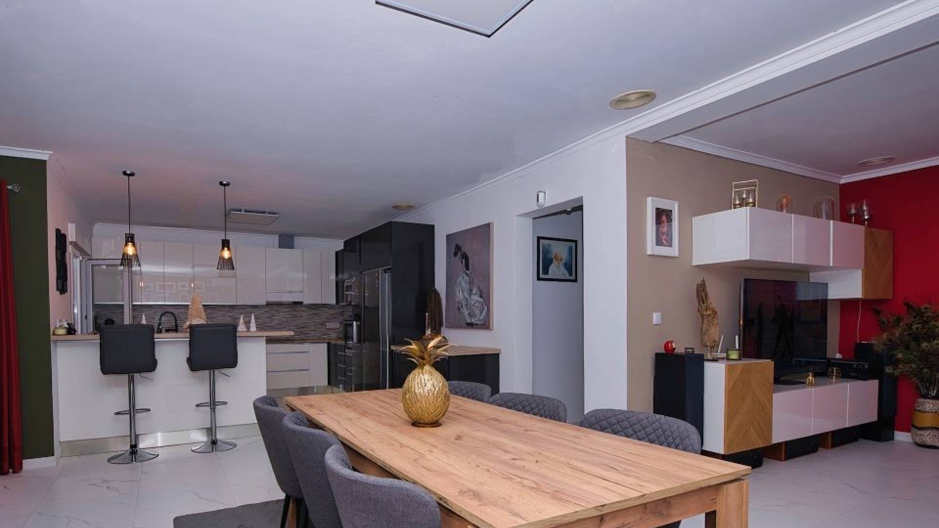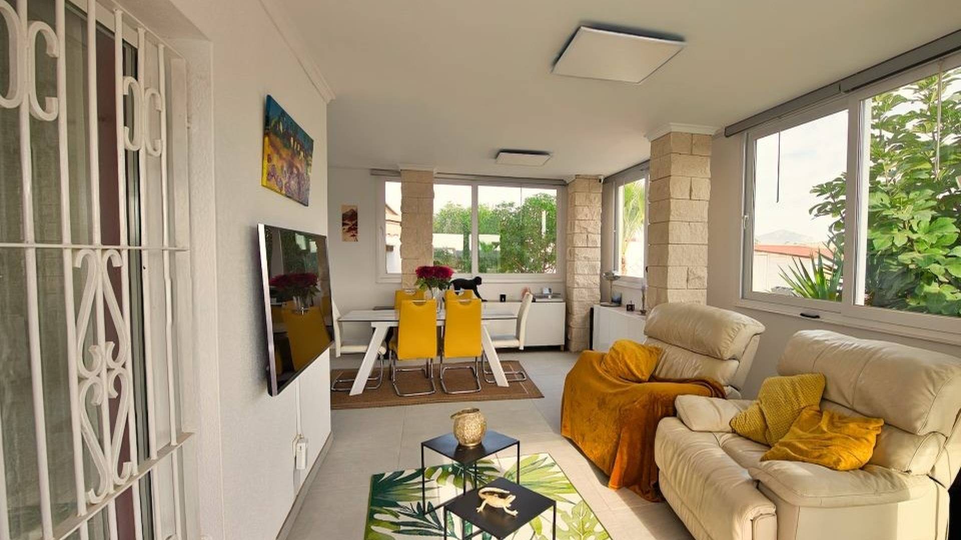De villa beschikt momenteel over twee ruime slaapkamers, waarbij de derde is geopend om de woonkamer te vergroten. De oorspronkelijke indeling met drie slaapkamers is eenvoudig te herstellen.