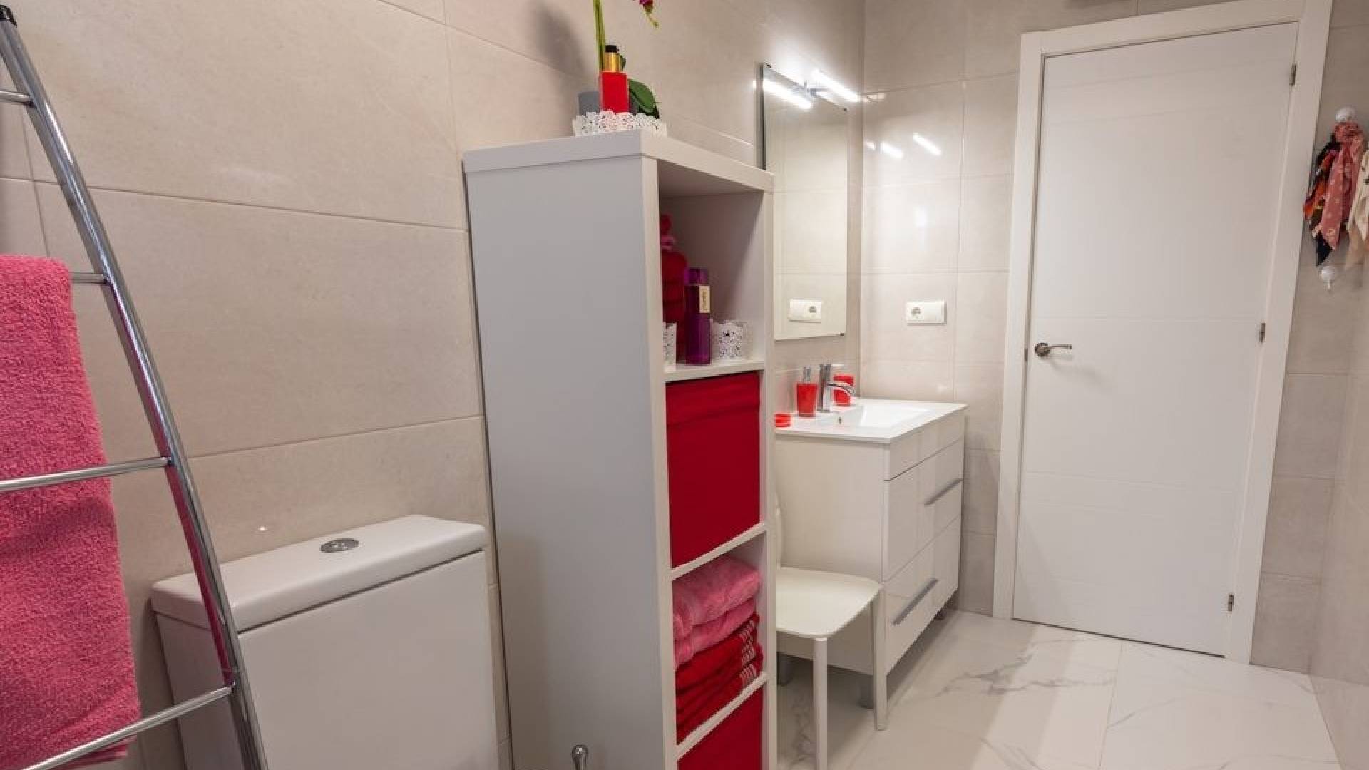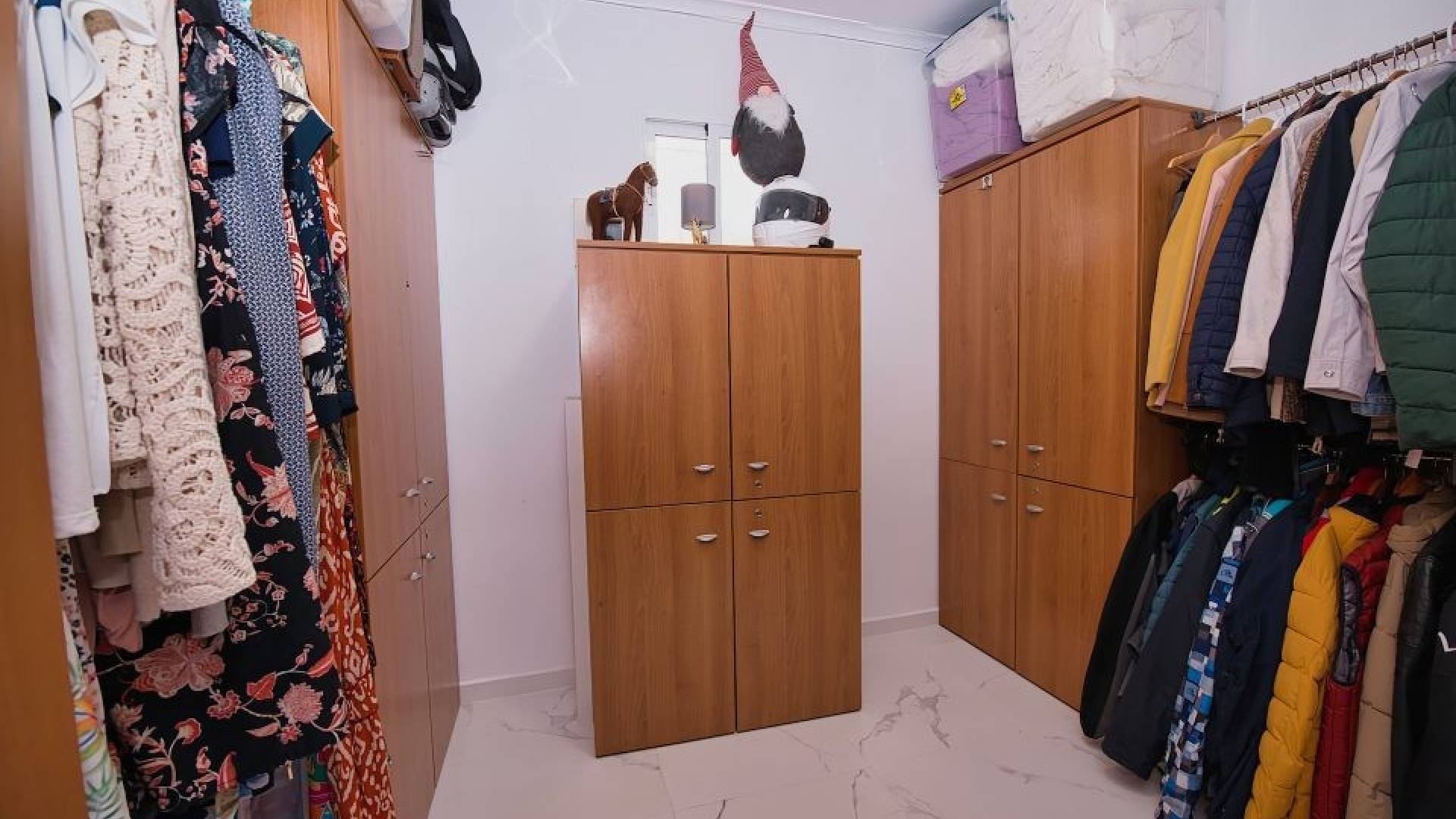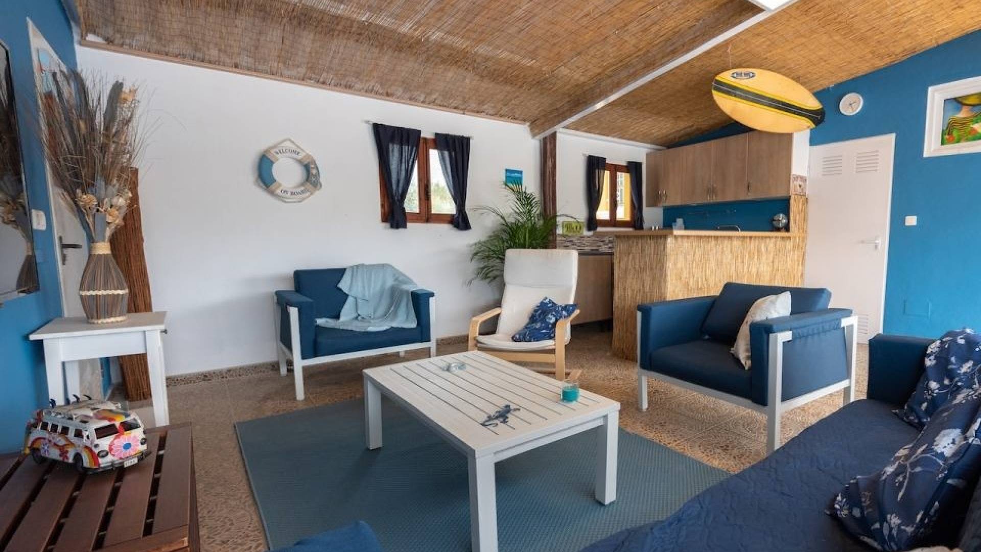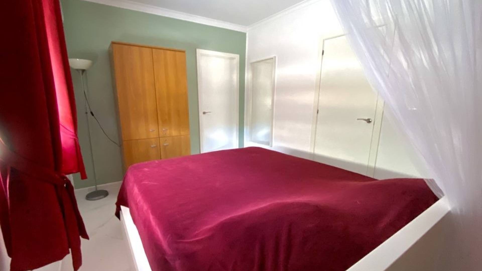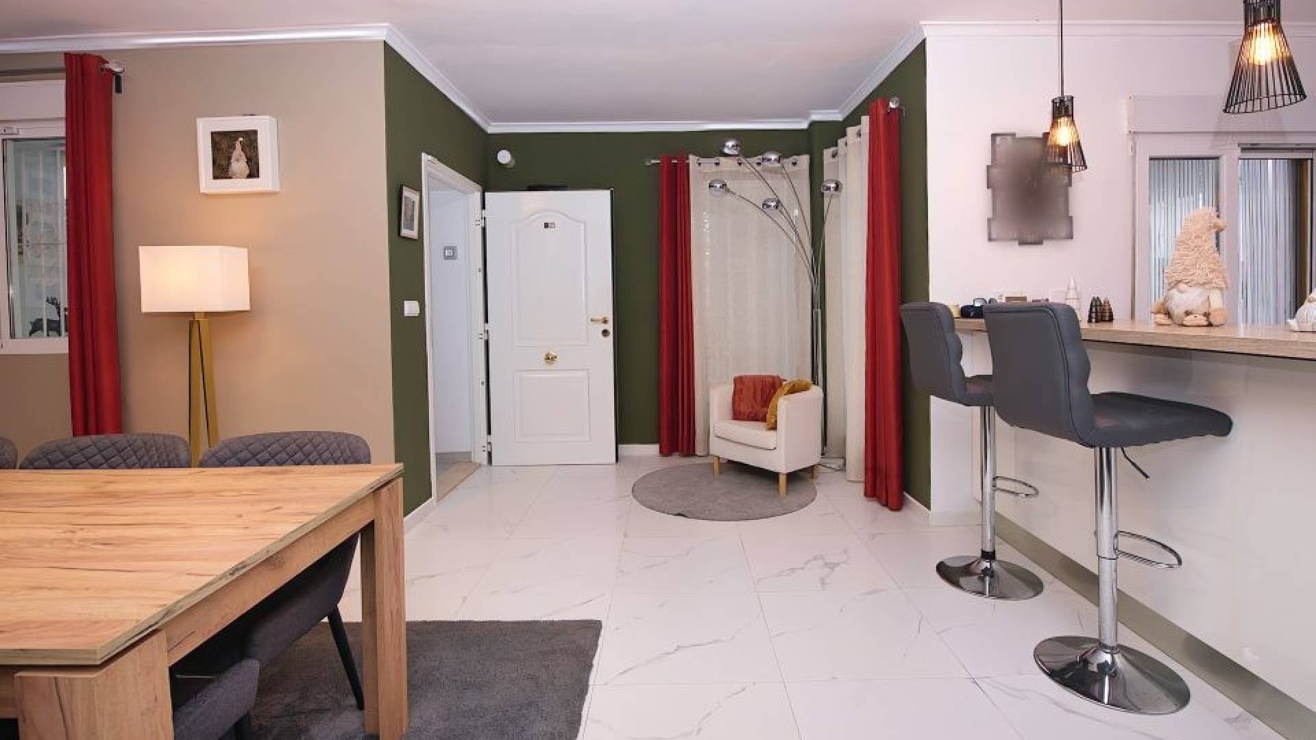 De villa beschikt momenteel over twee ruime slaapkamers, waarbij de derde is geopend om de woonkamer te vergroten. De oorspronkelijke indeling met drie slaapkamers is eenvoudig te herstellen.