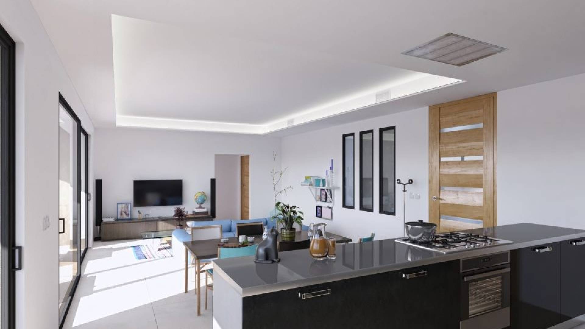 Te midden van dit unieke landschap ligt het huis van 160 m², een architectonisch kunstwerk dat elegantie en functionaliteit combineert.