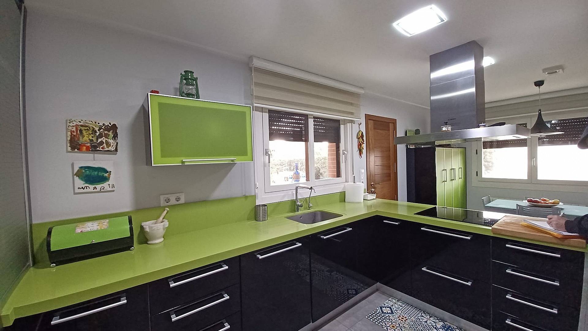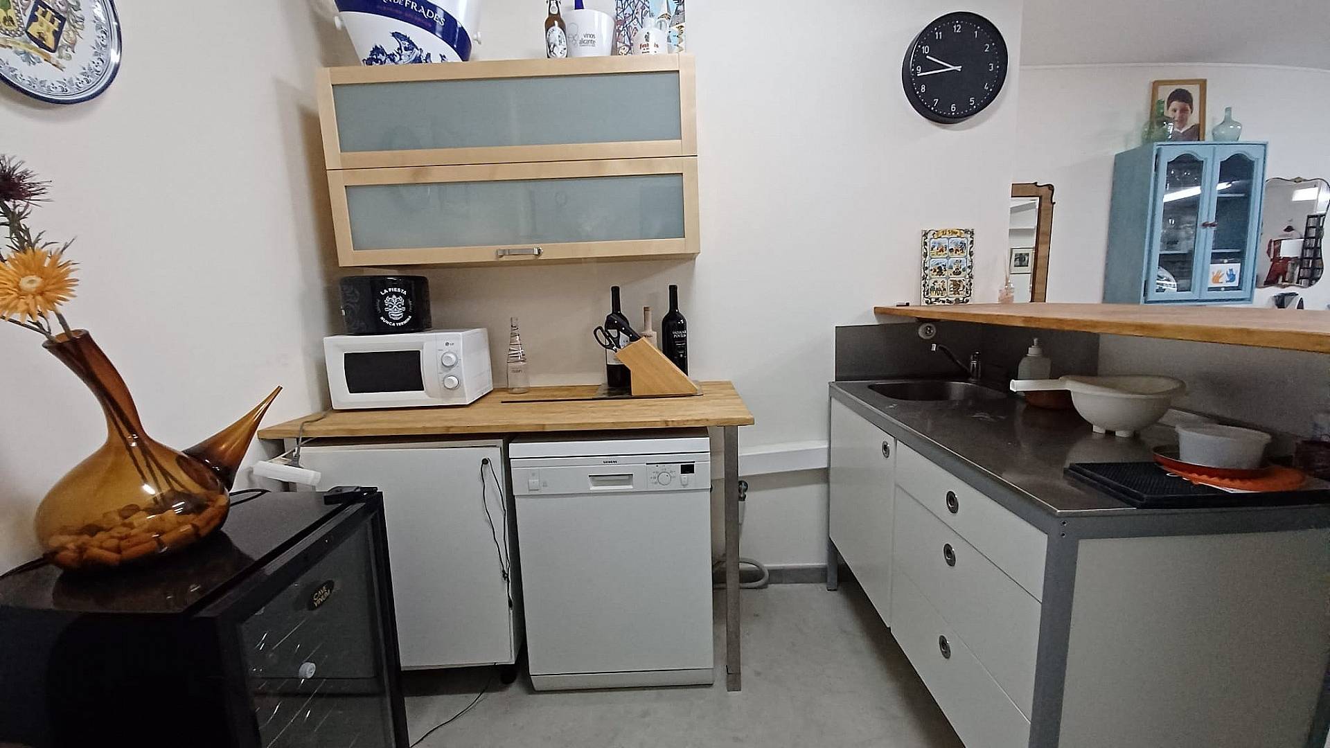 Langs de hal is de keuken/eetkamer met een volledig ingerichte moderne keuken inclusief alle inbouwapparatuur (inductiekookplaat, afzuigkap, oven, magnetron, vaatwasser, koelkast etc.). Hier is een deur naar het grote overdekte terras en de tuin. Tegenover is een bijkeuken met de gasboiler / cv-ketel en wasmachine etc. plus gootsteen en veel extra opbergruimte plus een deur naar de achtertuin waar een oprit is naar de afgesloten parkeerplaats, perfect om de boodschappen uit te laden. Het huis kan hier op het gasnet worden aangesloten, maar de huidige eigenaren gebruiken flessen.