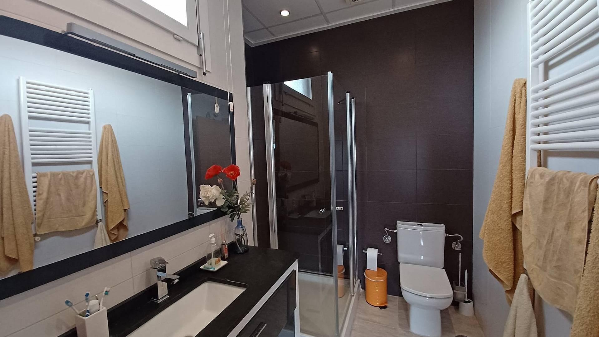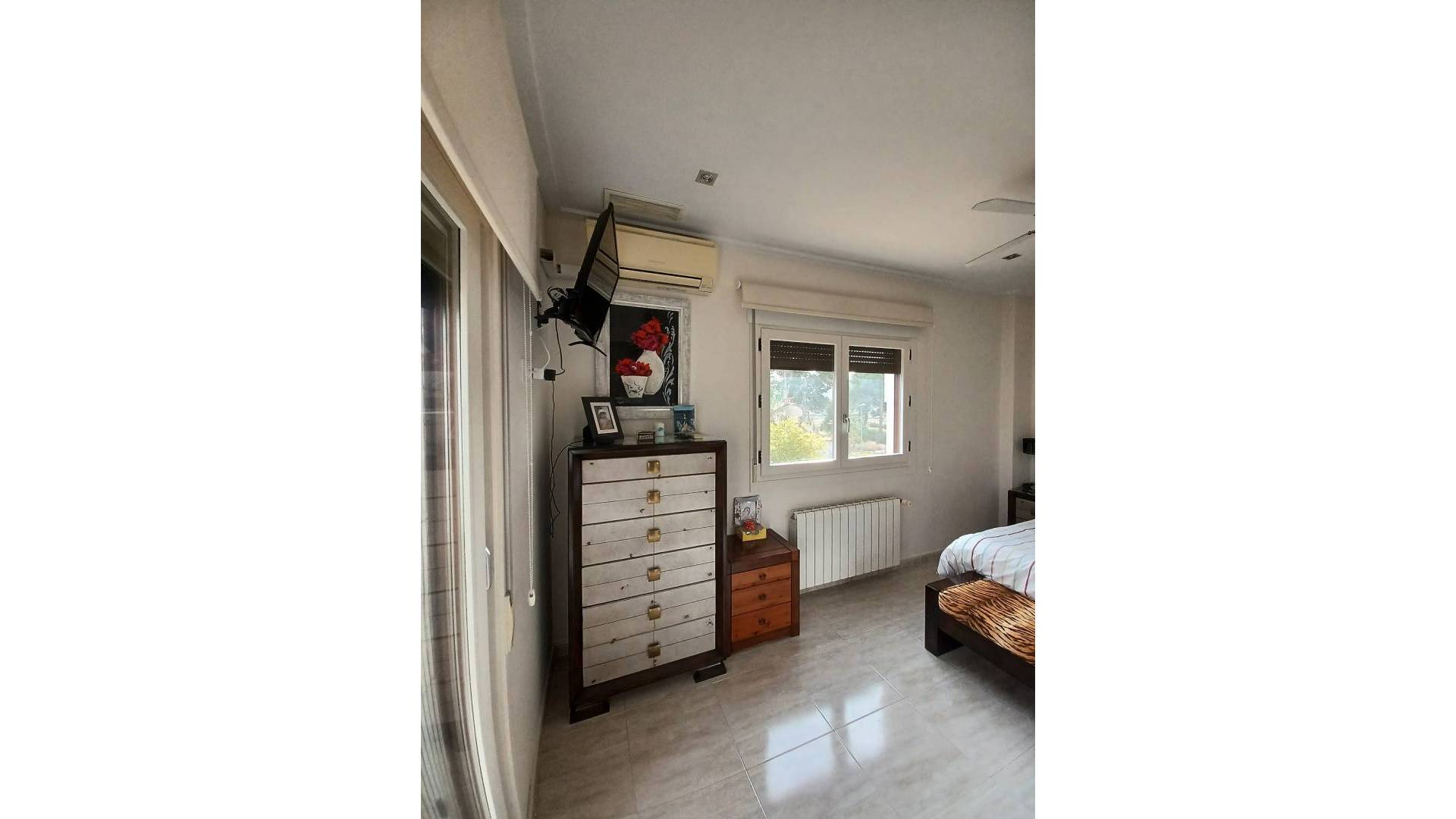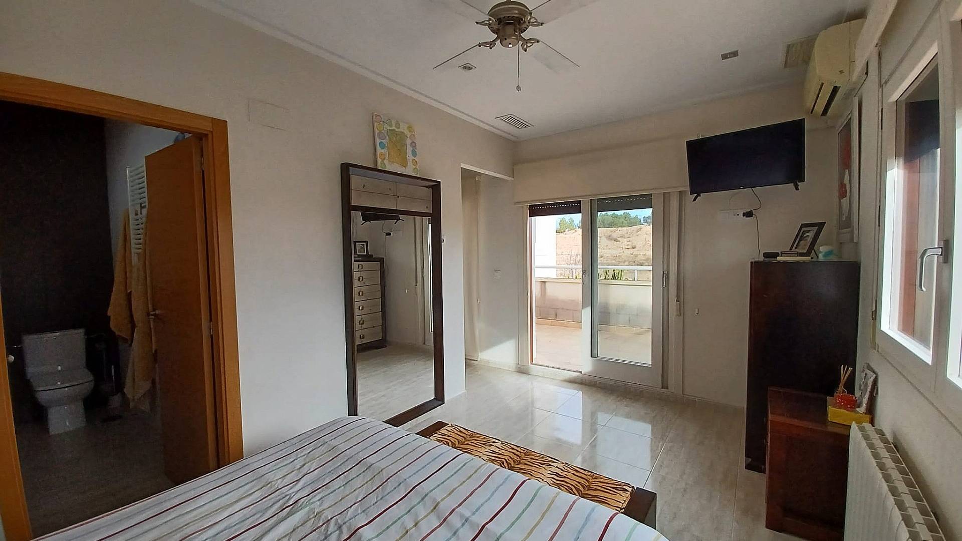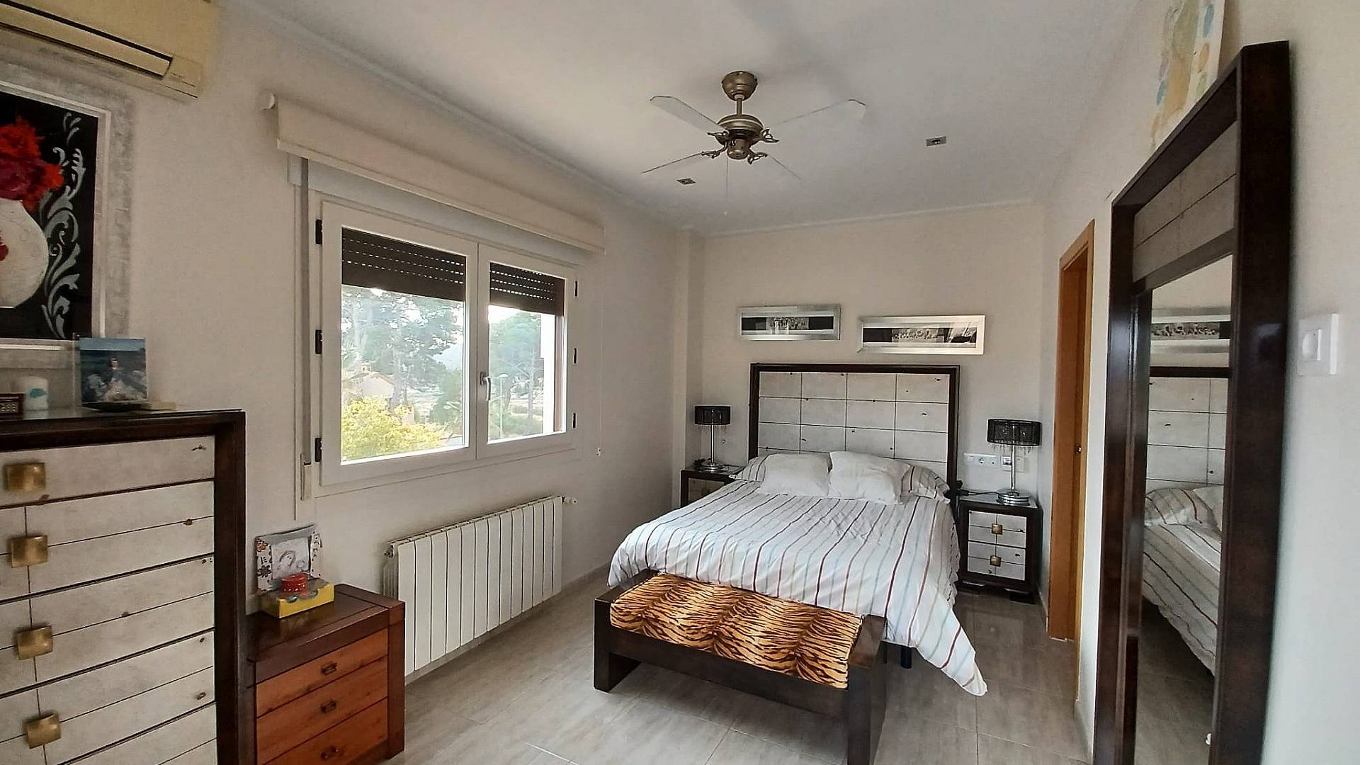 De volgende slaapkamer is slaapkamer drie, ook inbouwkasten en dubbele deuren naar het grote terras. Hier bevindt zich de toegang tot de zonneboiler en de airconditioningunit voor de begane grond, ook aansluitingen klaar voor de unit op de eerste verdieping (alle leidingen zijn vooraf geïnstalleerd, maar de machine moet worden toegevoegd). De laatste deur leidt naar de master suite, hier is een grote inloopkast met schuifdeuren, volledig voorzien van planken en met ledverlichting. Vanuit de slaapkamer zijn er dubbele deuren naar het terras aan de voorkant van het huis, en ook een schuifdeur naar de grote ensuite met een grote inloopdouche, grote wastafel en toilet plus een verwarmde handdoekhouder.