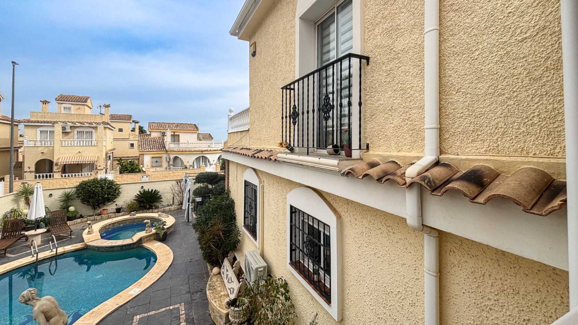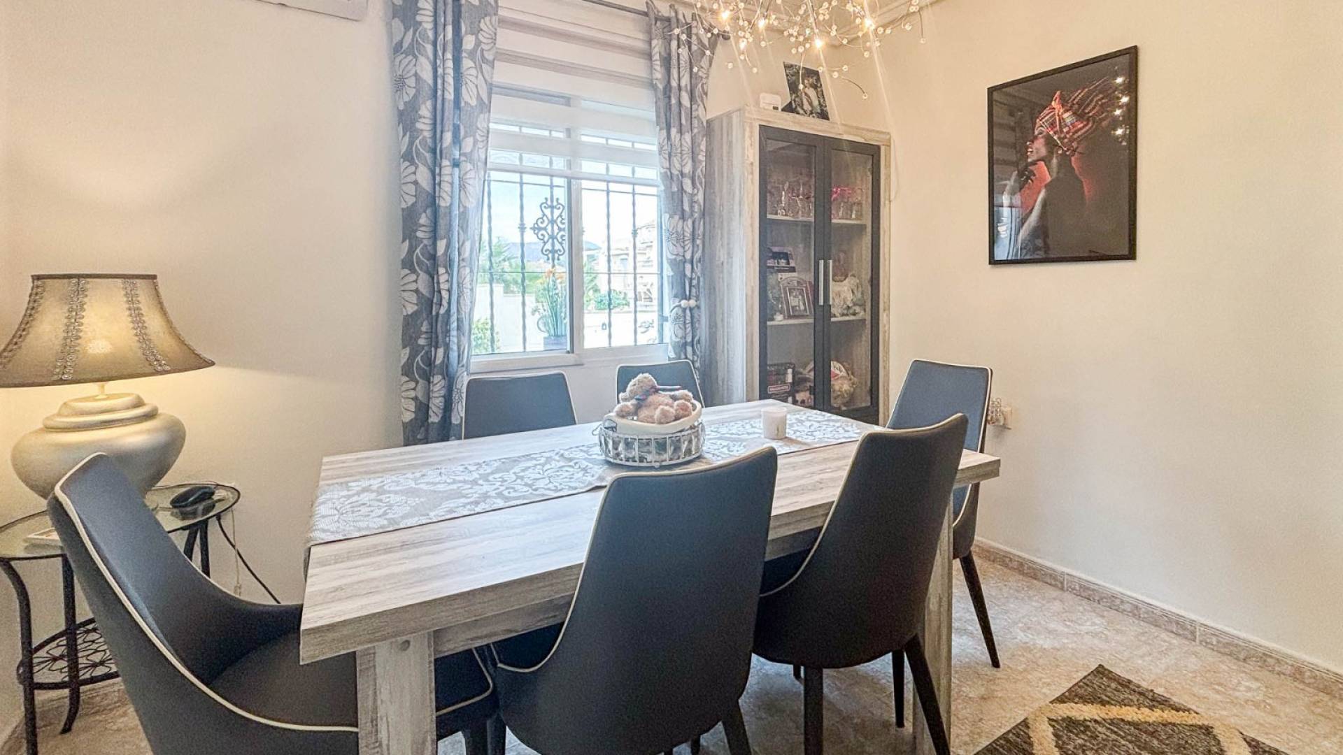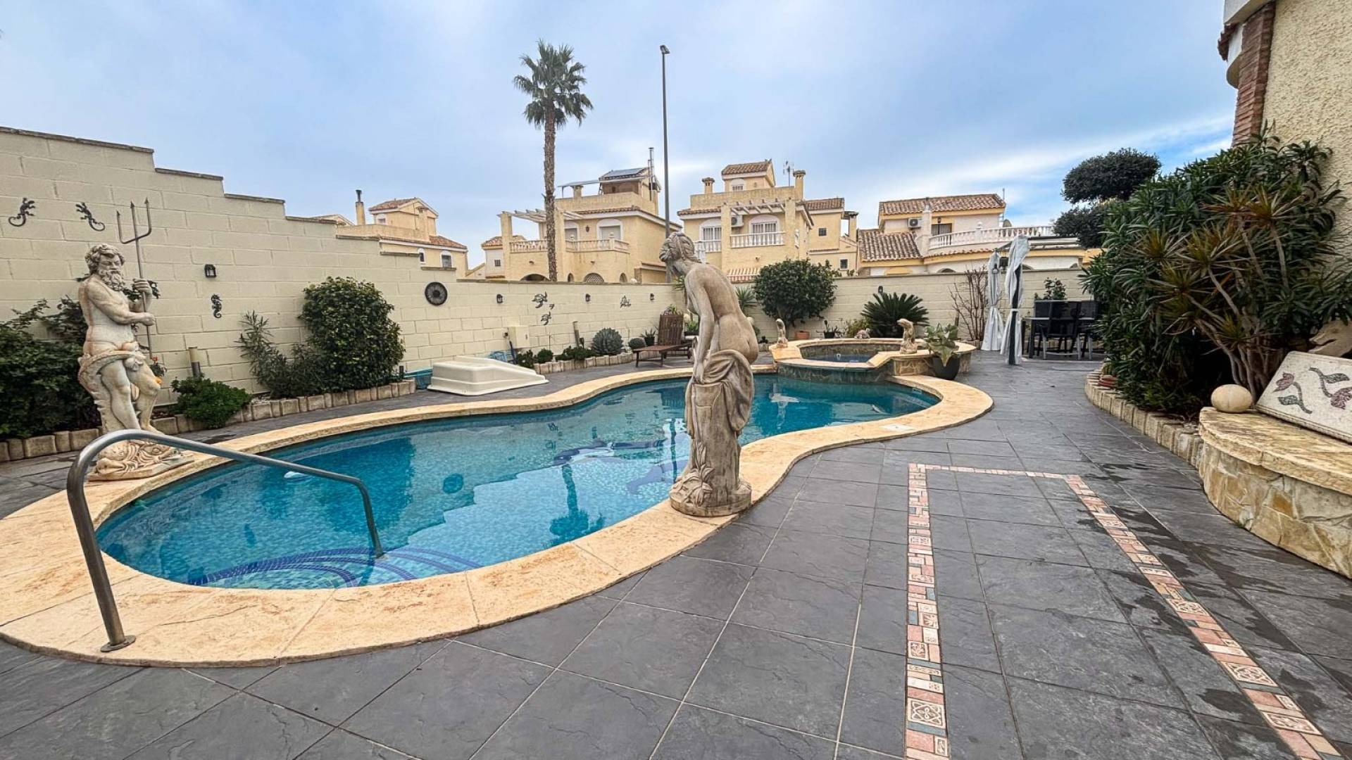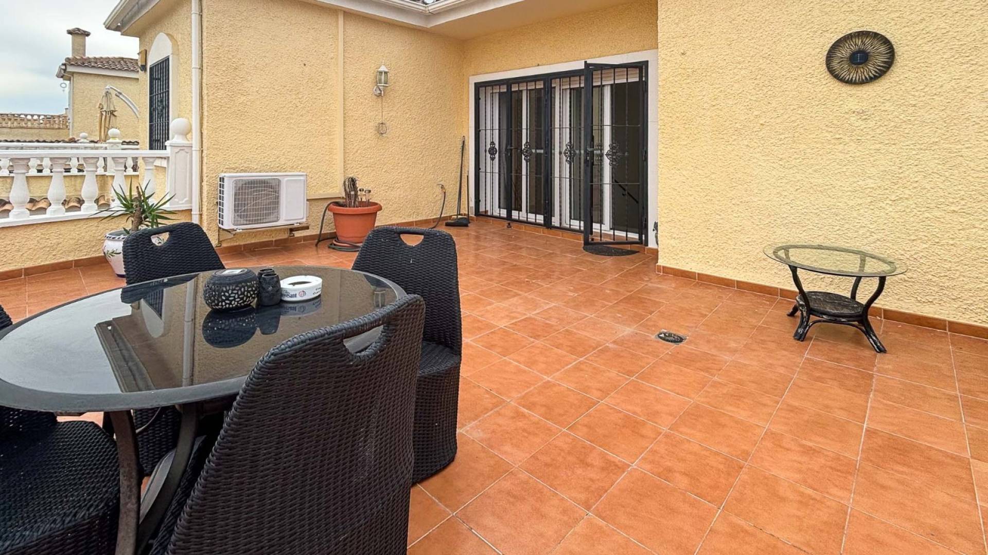 Deze indrukwekkende villa is verdeeld over twee verdiepingen. Op de begane grond bevinden zich een ruime woon-eetkamer, een goed ingedeelde aparte keuken, bijkeuken, twee slaapkamers, een en-suite badkamer en een gastentoilet. Aan de voorzijde van de woning bevindt zich een glazen entree-terras, terwijl u aan de achterzijde een groot gedeeltelijk overdekt terras vindt dat momenteel wordt gebruikt als ontspannings- en entertainmentruimte met pooltafel en bar, met uitzicht op het zwembad.