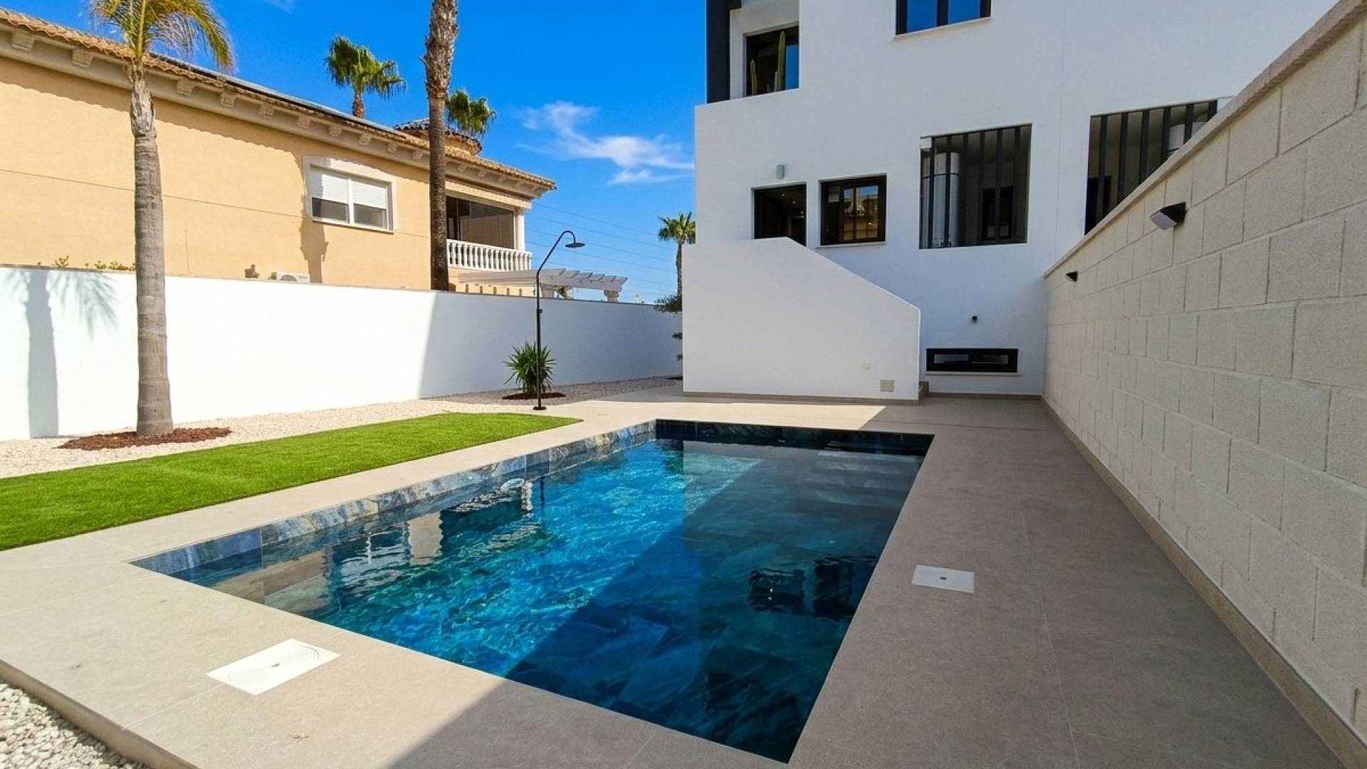 Elke woning beschikt over 3 slaapkamers en een spectaculair privézwembad van 5x3 meter inbegrepen in de prijs, gelegen aan de achterzijde met een tuinzone die naar wens kan worden aangelegd.