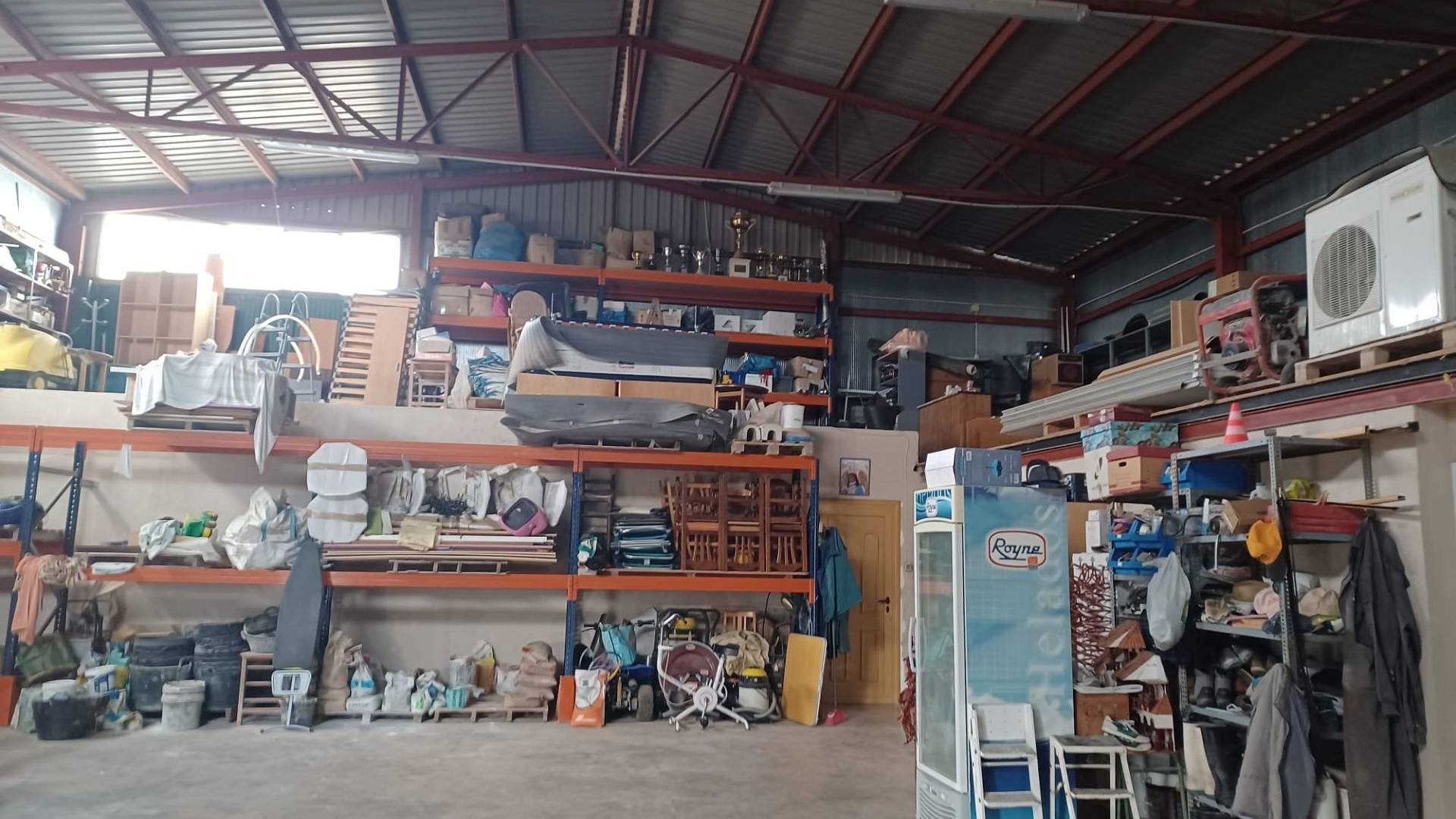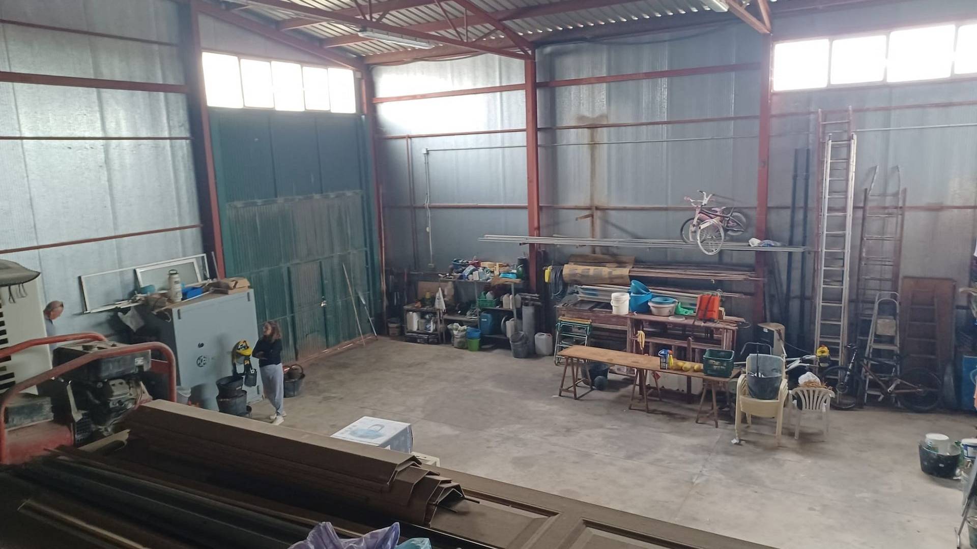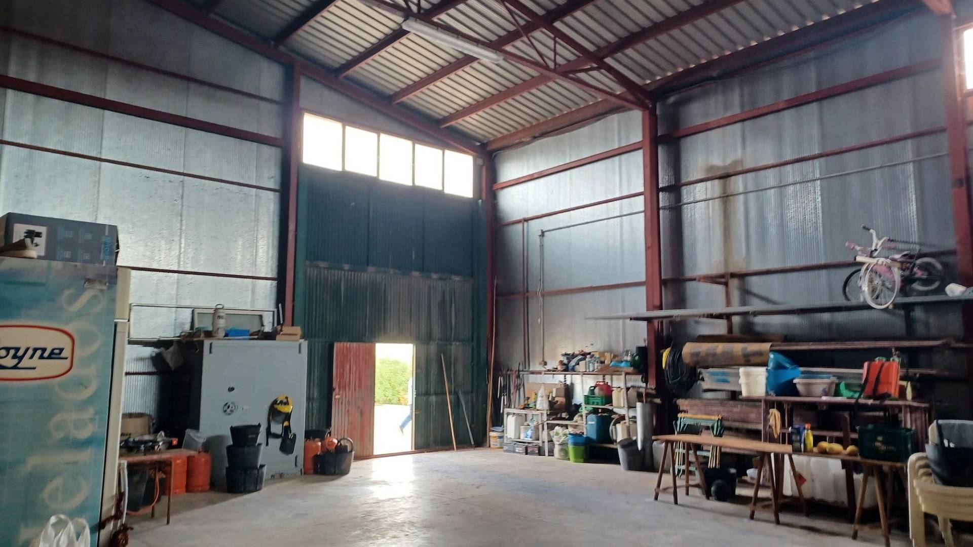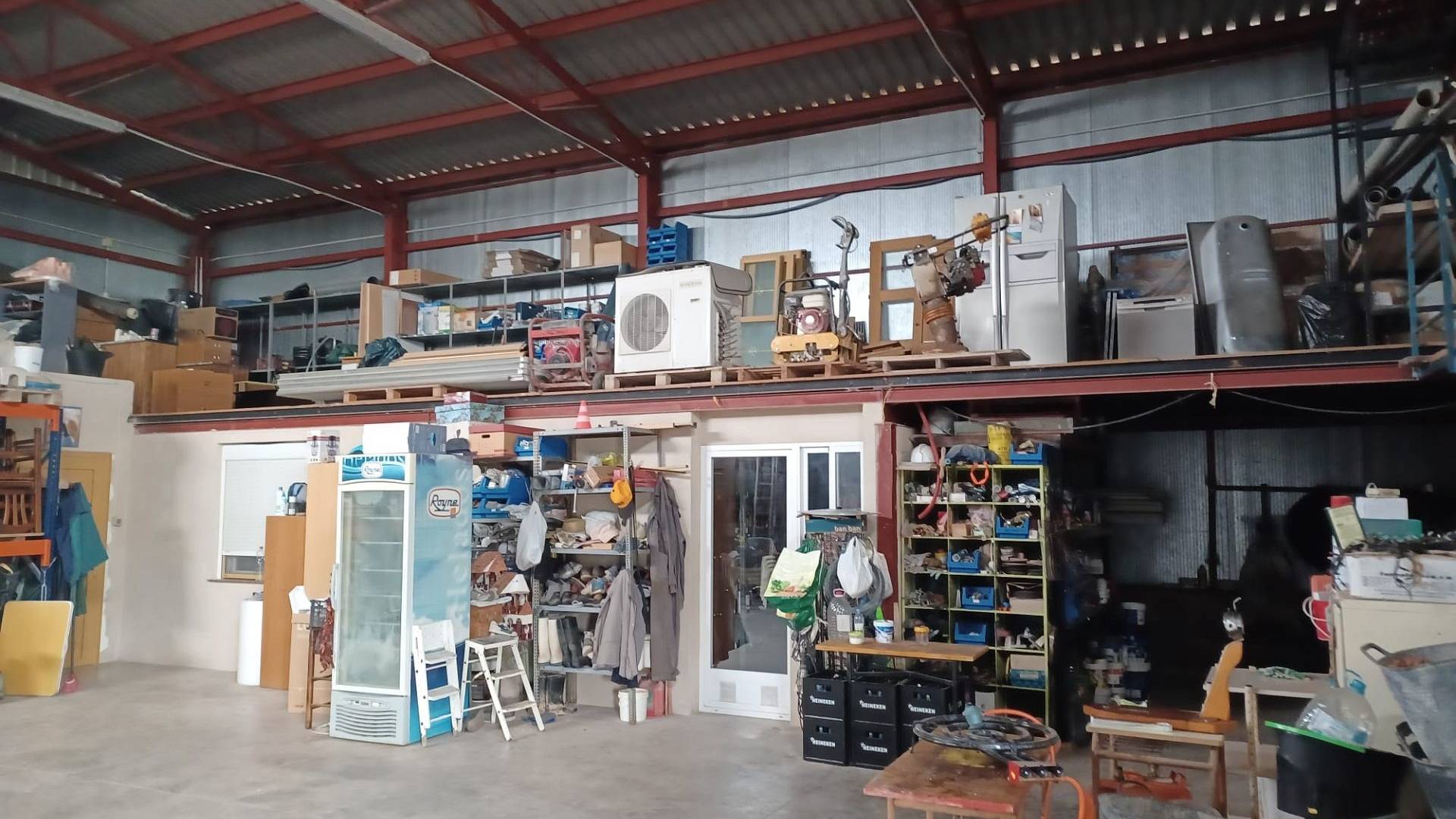 Het huis heeft een tussendeur die toegang geeft tot de enorme werkplaats/opslagruimte. Er is ook een mezzanine met een trap die extra opslagruimte biedt. Een grote deur biedt toegang voor grote voertuigen.