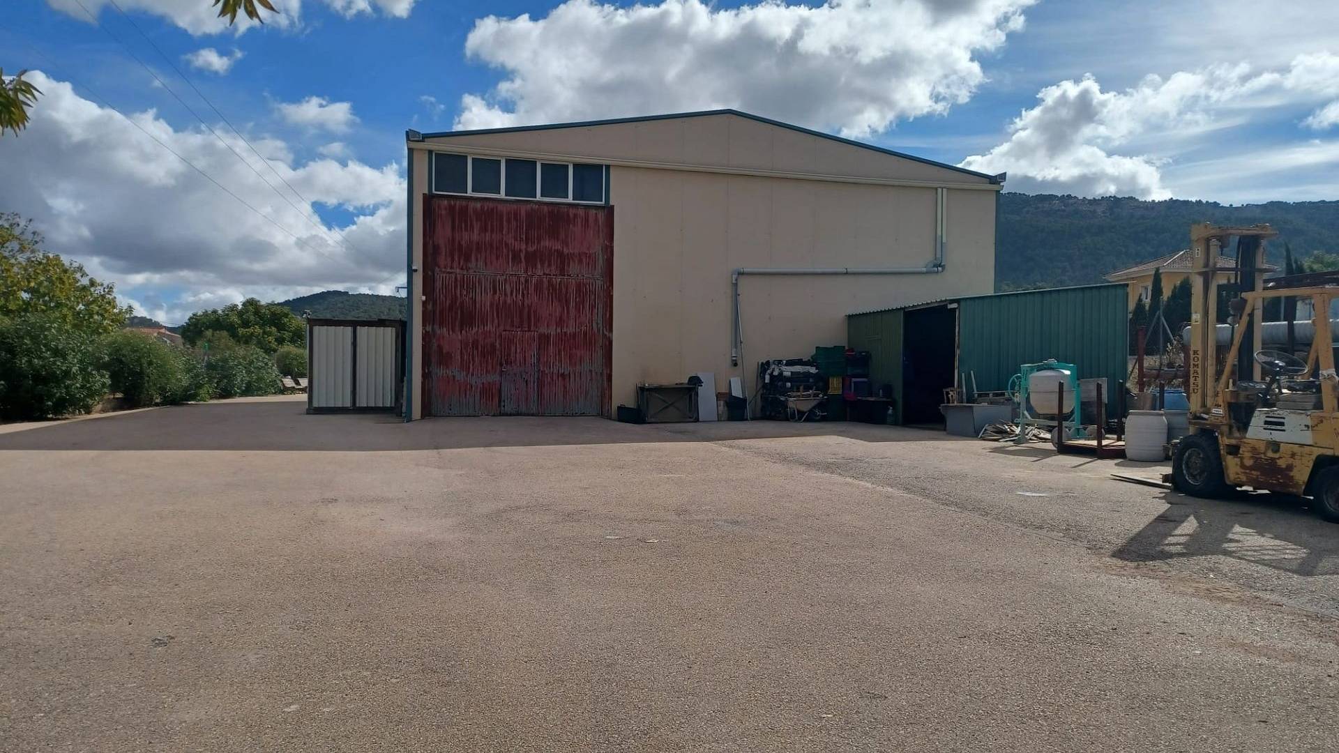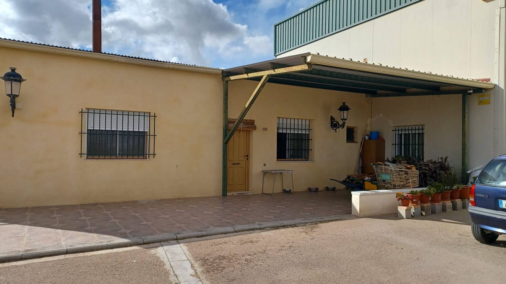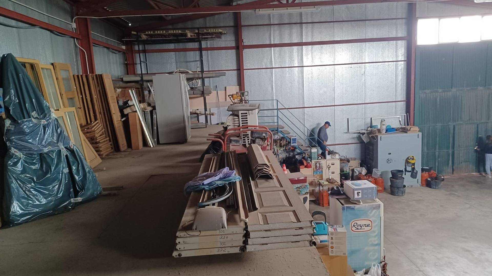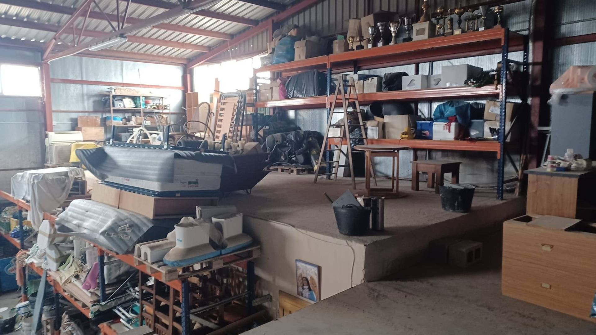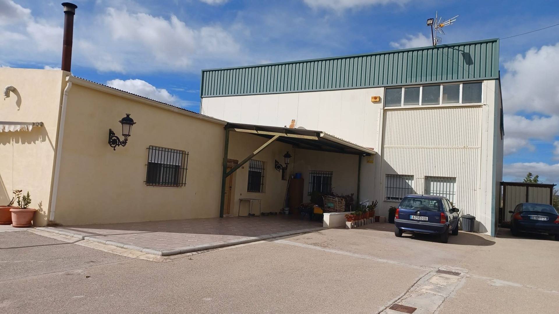 Het huis heeft een tussendeur die toegang geeft tot de enorme werkplaats/opslagruimte. Er is ook een mezzanine met een trap die extra opslagruimte biedt. Een grote deur biedt toegang voor grote voertuigen.