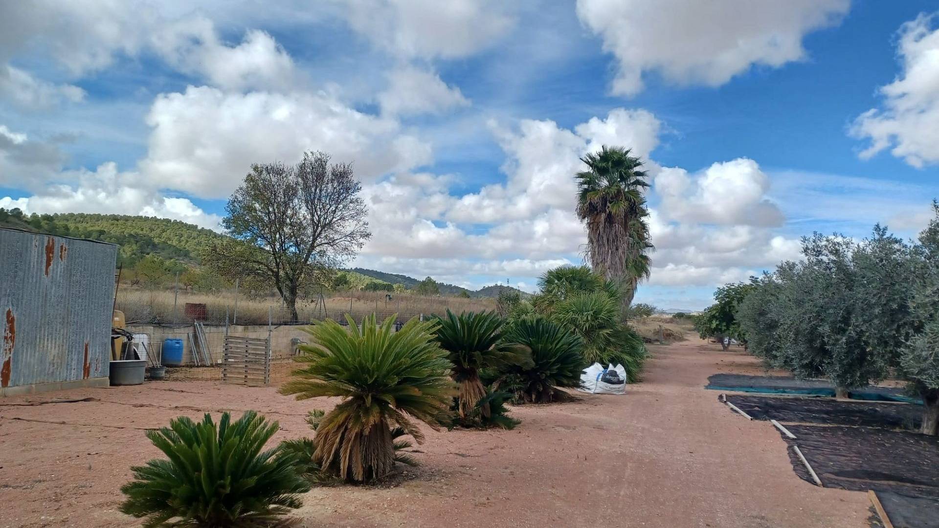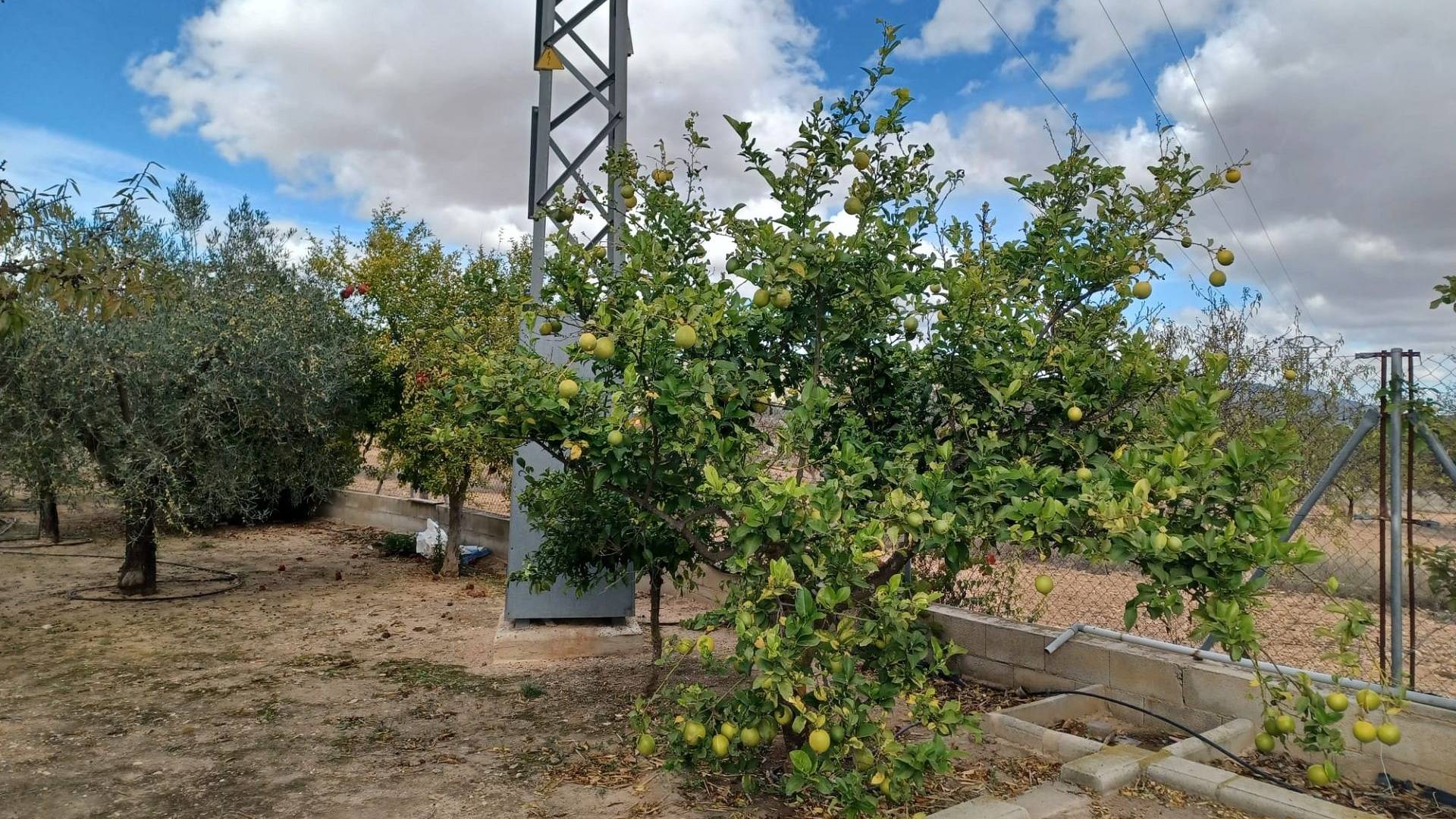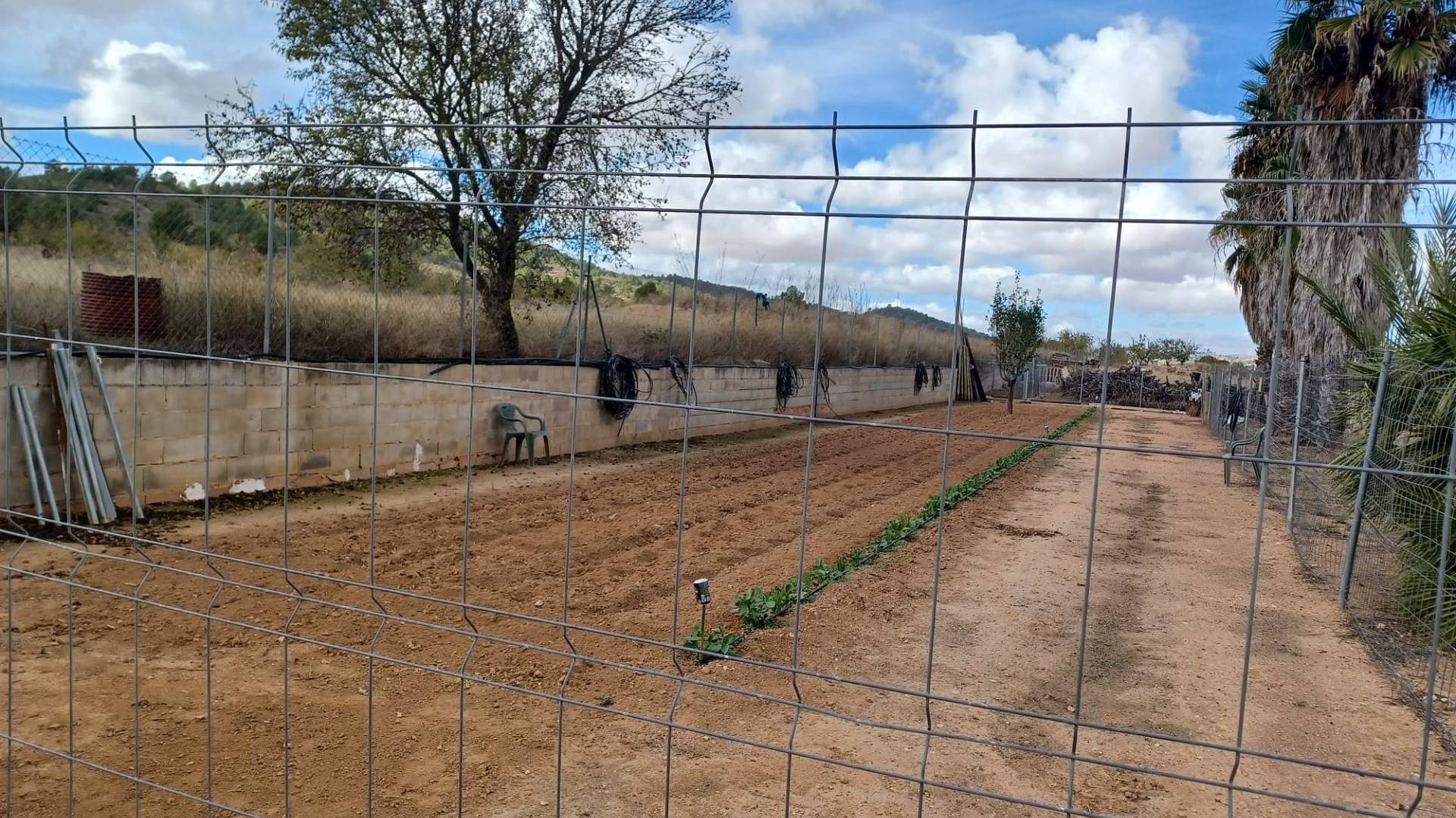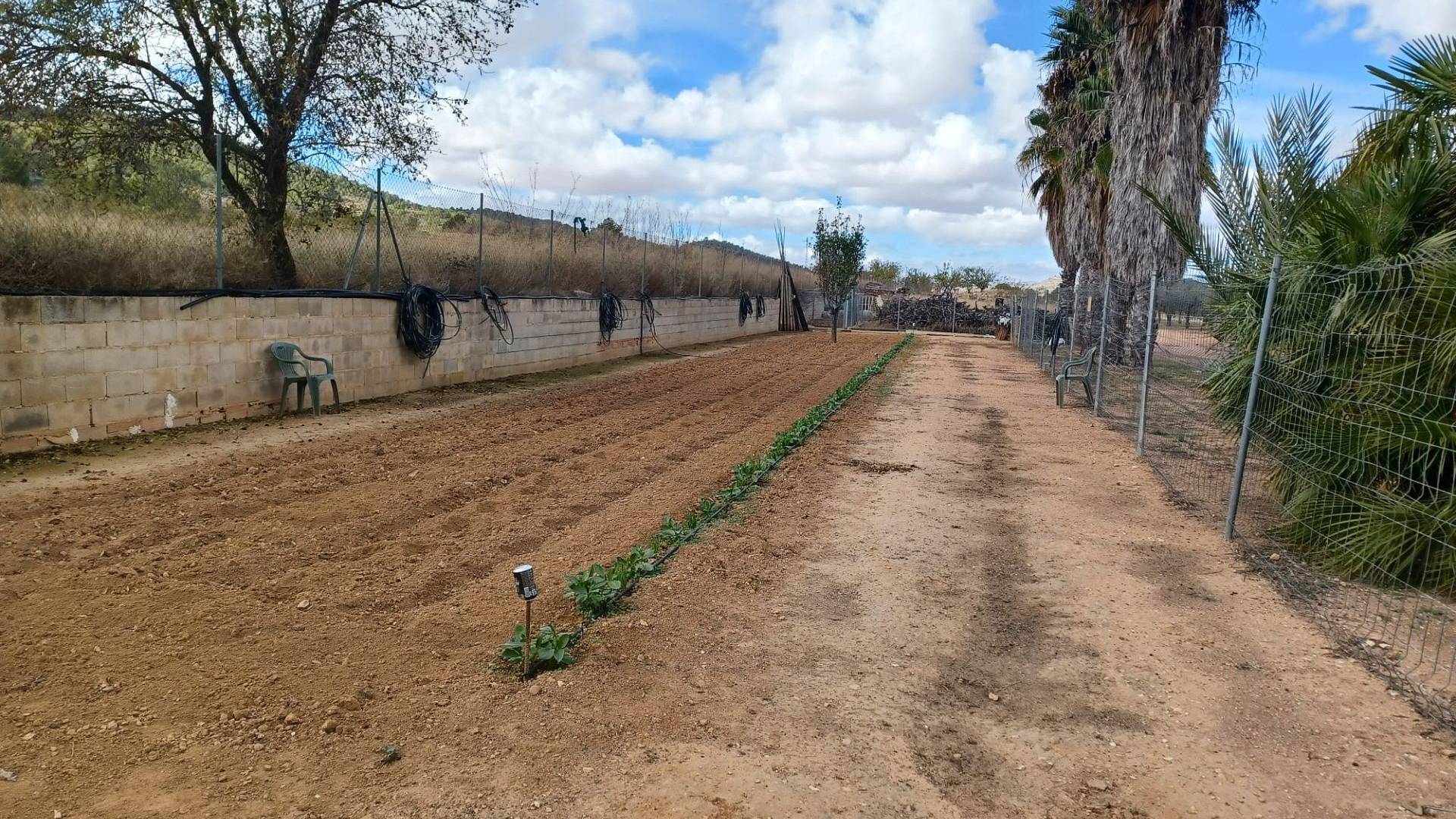 Aan de voor- en achterzijde van het pand bevinden zich verharde terrassen, evenals een poort die toegang geeft tot een moestuin en dierenverblijven. Er staan ook 30 volwassen olijfbomen, samen met een assortiment fruitbomen en palmen. Aan het einde van het perceel bevindt zich een poort die toegang geeft vanaf de andere onverharde weg.