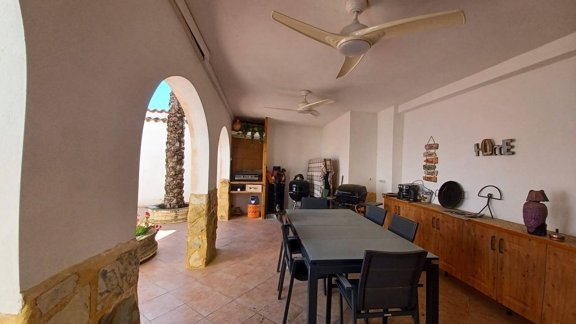 Hier is nog een toegangsdeur naar de voorzijde van het gebouw, een toilet en een wasruimte, plus een overdekte zithoek onder de bogen met een zomerkeuken en barbecue.