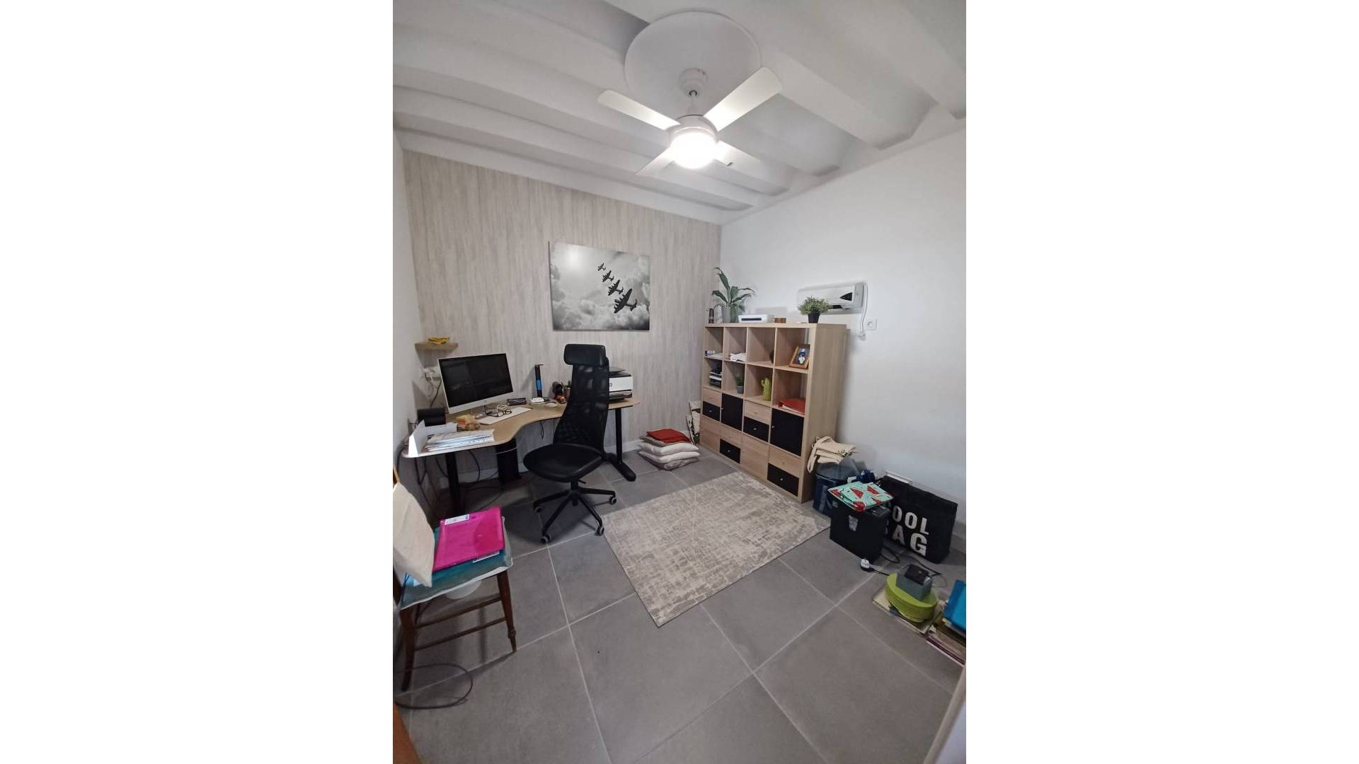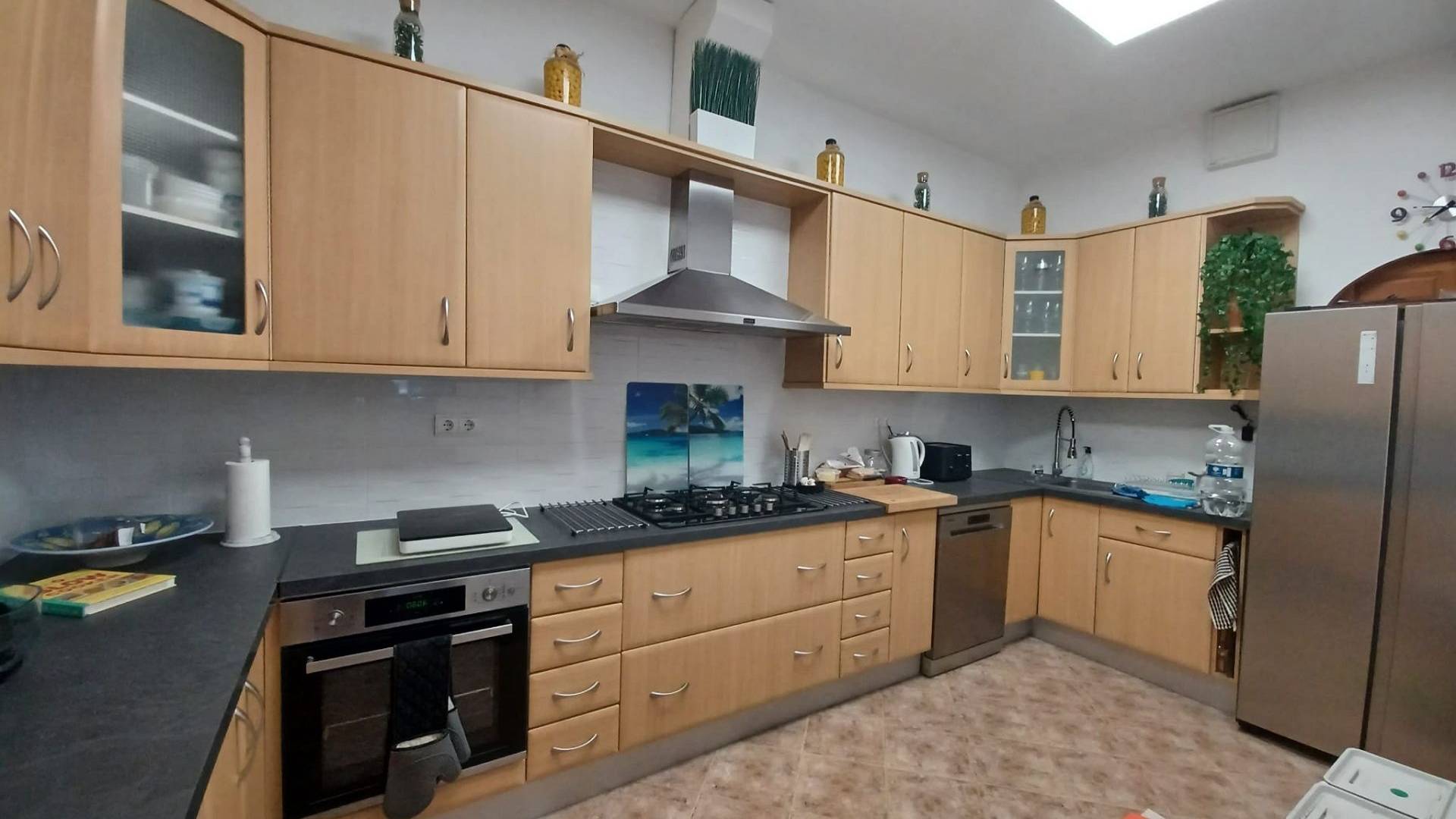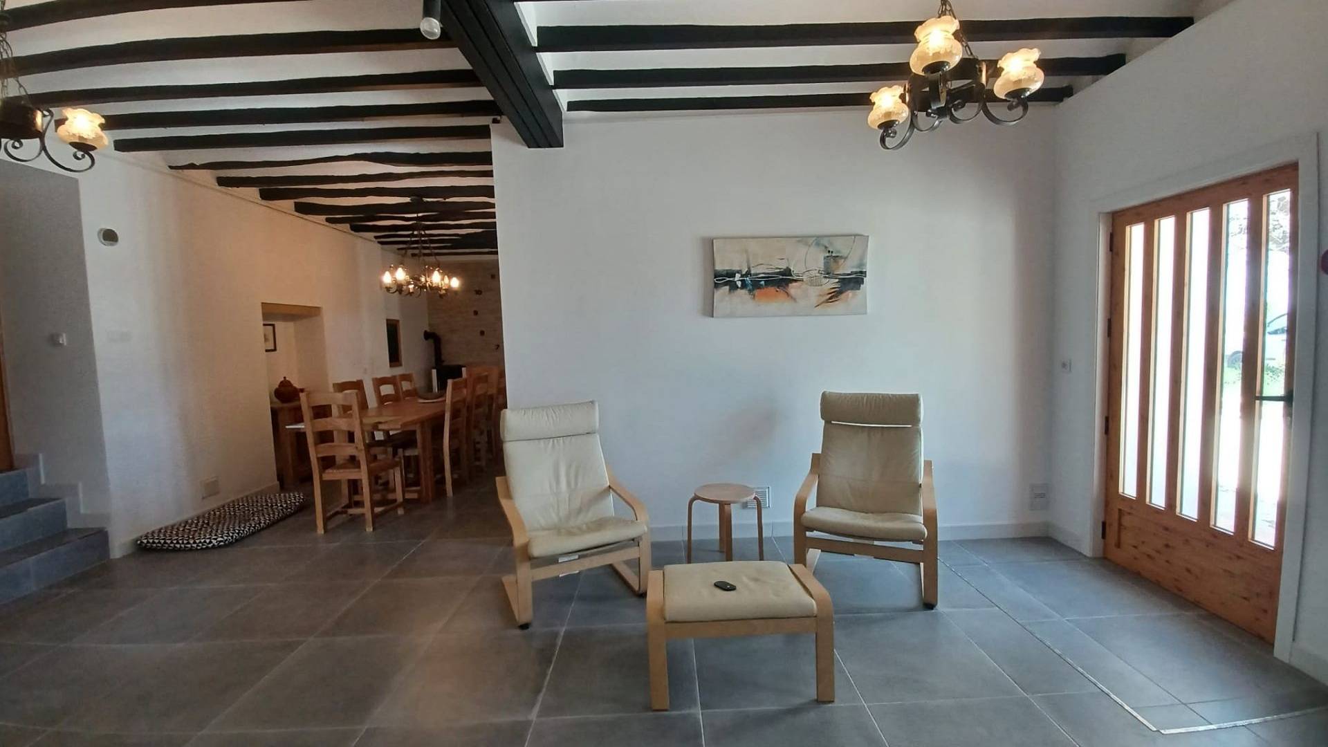 U betreedt het huis via de hoofdingang in een ruime hal. Links bevindt zich een deur naar een kantoor/slaapkamer, rechts een boogdoorgang naar de grote woonkamer met balkenplafond, open haard, plafondventilator en airconditioning. Vanuit deze kamer leidt een boogdoorgang naar de volledig vernieuwde en van alle gemakken voorziene keuken met ruimte voor een kleine eettafel en stoelen.