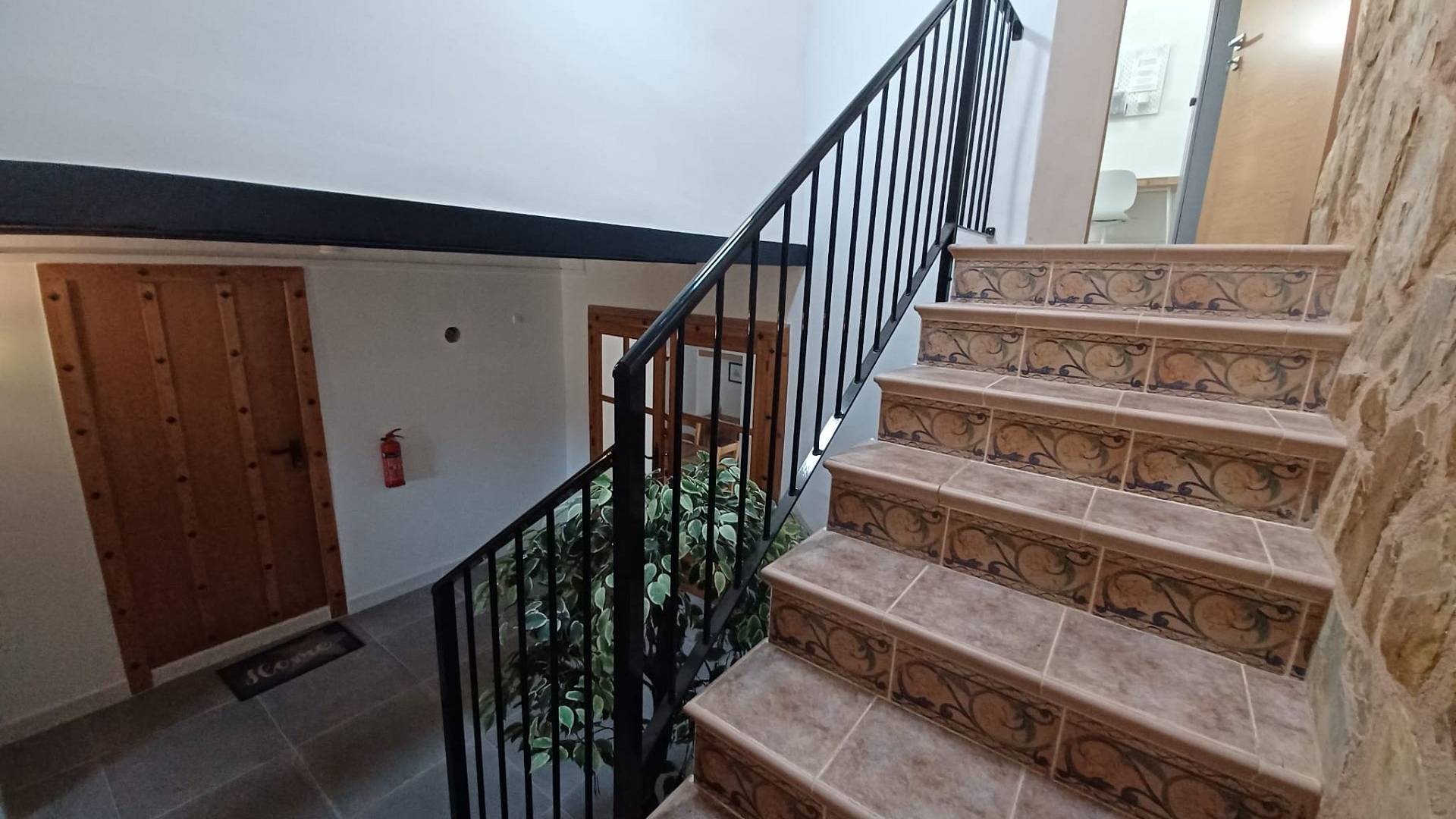Terug op de binnenplaats is er een buitentrap naar het bovenappartement met een groot terras en een overdekte zithoek onder de bogen, met directe toegang tot het bovenappartement en uitzicht over de binnenplaats, het zwembad en de heuvels en het omliggende landschap.