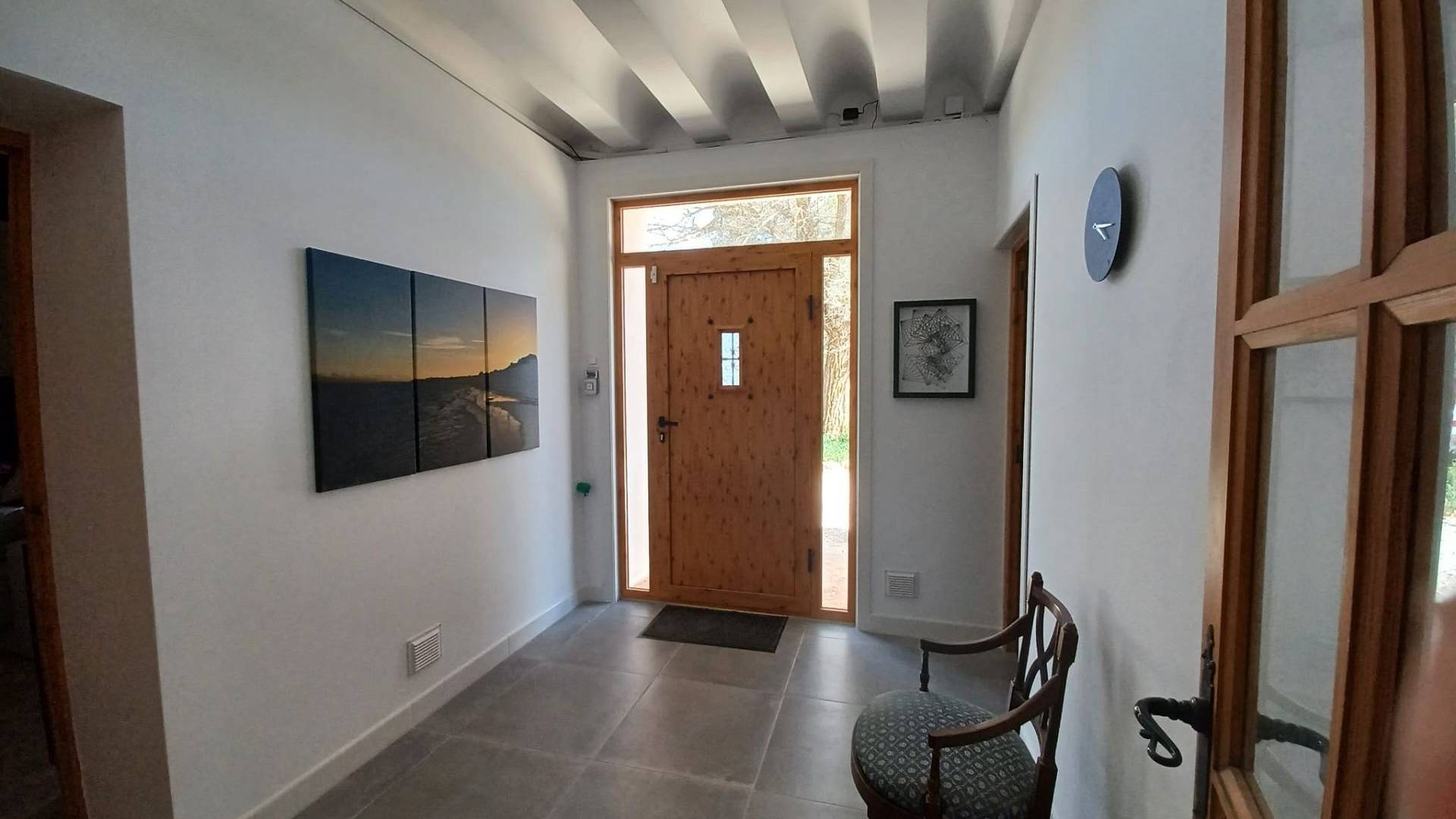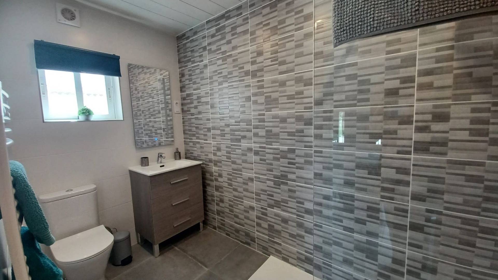 Terug in de hal is er nog een deur die leidt naar een grote L-vormige woon-/eetkamer, met een pelletkachel en een deur naar de voorzijde (die indien nodig een aparte ingang biedt). Vanuit deze kamer is er een deur naar de ruime slaapkamer met plafondventilator en airconditioning, plus een en-suite badkamer met toilet, wastafel, handdoekradiator en inloopdouche.