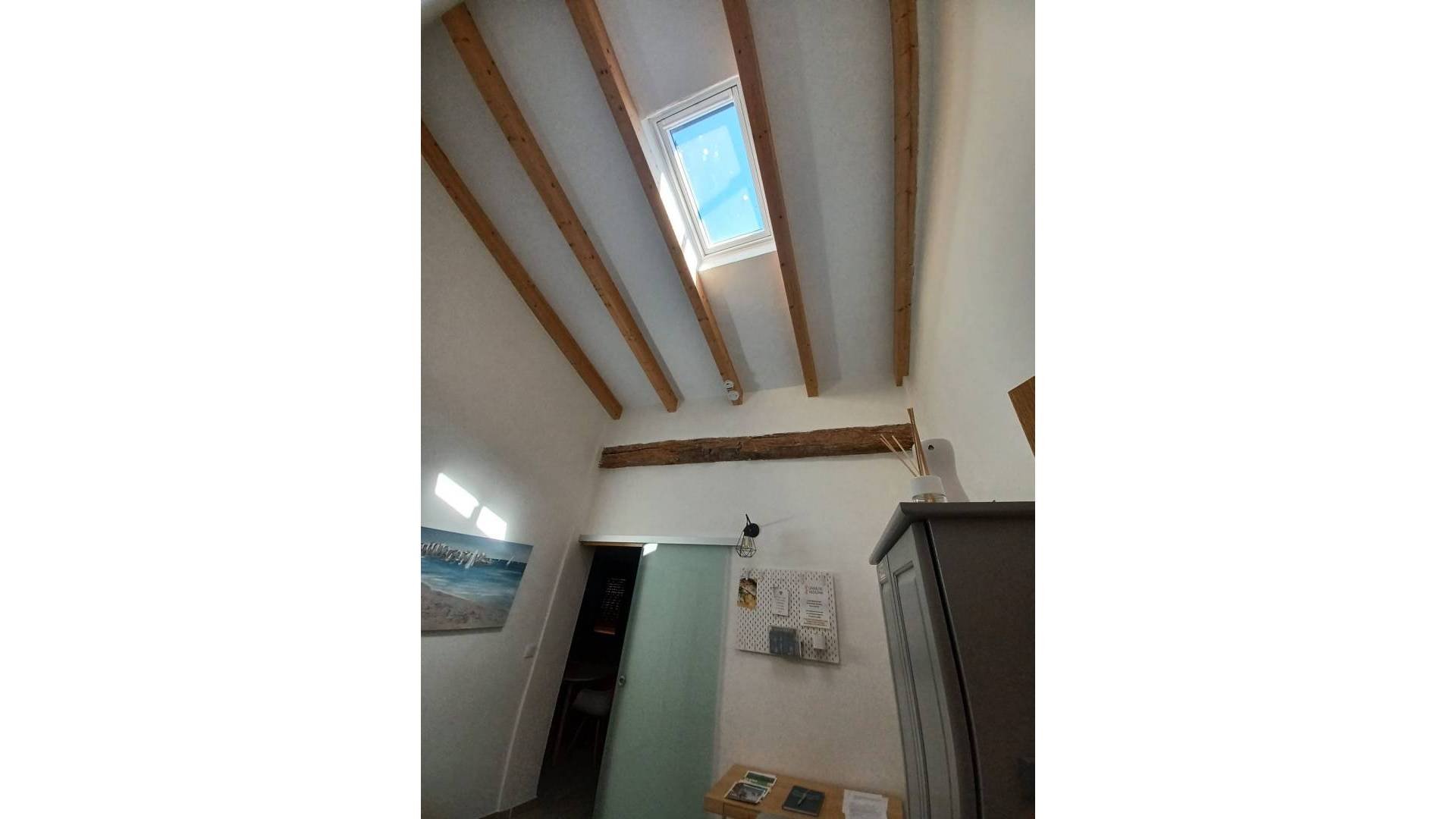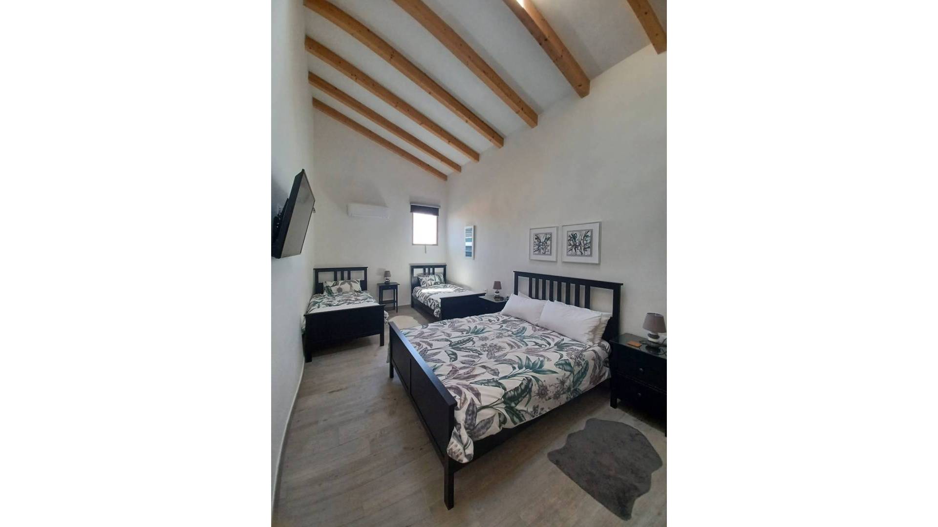 Vanuit de hal leidt de trap naar het appartement op de bovenverdieping. Daar komt u in een ruime hal met deuren naar alle kamers. Alle kamers hebben hoge plafonds en er zijn nieuwe balken geplaatst die passen bij de oorspronkelijke stijl van het huis. Er is een gezinsbadkamer met toilet, wastafel, een grote inloopdouche en een verwarmd handdoekenrek. Een andere deur vanuit de hal leidt naar een grote slaapkamer, momenteel voorzien van een tweepersoonsbed, twee eenpersoonsbedden en een kledingkast, dus voldoende ruimte. Vanuit de hal komt u in de open woon-eetkamer/keuken met een pelletkachel en airconditioning, en een recent vernieuwde, volledig uitgeruste keuken. Vanuit de hal is er ook een deur naar een tweepersoonsslaapkamer met airconditioning en plafondventilator, en een deur naar een en-suite badkamer met toilet, wastafel en douche.