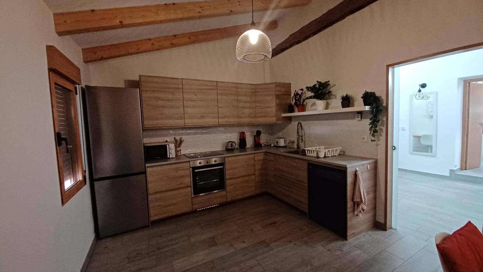 Een schuifdeur leidt vanuit de woonkamer naar de keuken, die volledig nieuw en uitgerust is, met ruimte voor een tafel en stoelen en een deur naar de binnenplaats.