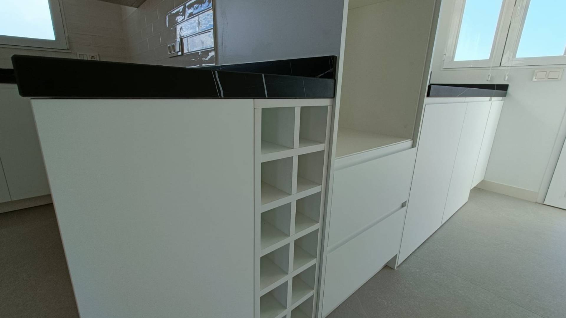 The kitchen comes equipped with high quality cabinetry and worktops (appliances not included), led lights in the interior of cabinets, ready for you to prepare your favourite dishes while enjoying the stunning views through the large panoramic windows in the dining room.