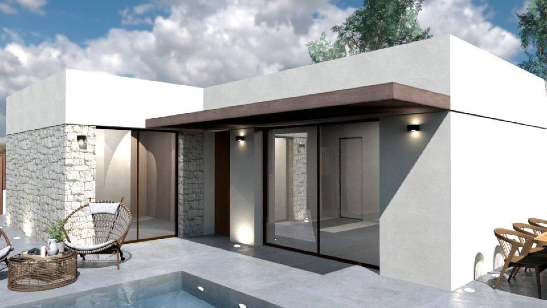 We present this superb new construction in las Kalendas, this modern house has a total living area of 70m2 very well distributed. Living and dining room, with furnished kitchen (no appliances); two bedrooms (+-14 and 10m2), two shower rooms (furniture and shower glass included); 15m2 chlorine pool; space for one car, 4m50 covered porch. The Las Kalendas urbanization is located – 5 minutes from the small town of Fortuna, where you’ll find all day-to-day facilities (supermarkets, restaurants, pharmacies, health center, markets…), 25 minutes from the center of Murcia, 45 minutes from Alicante, its beaches and airport. For more information, please contact us.