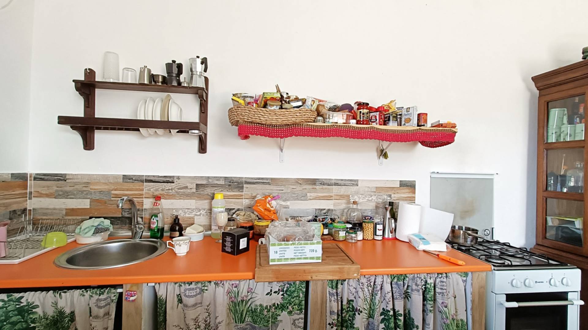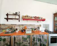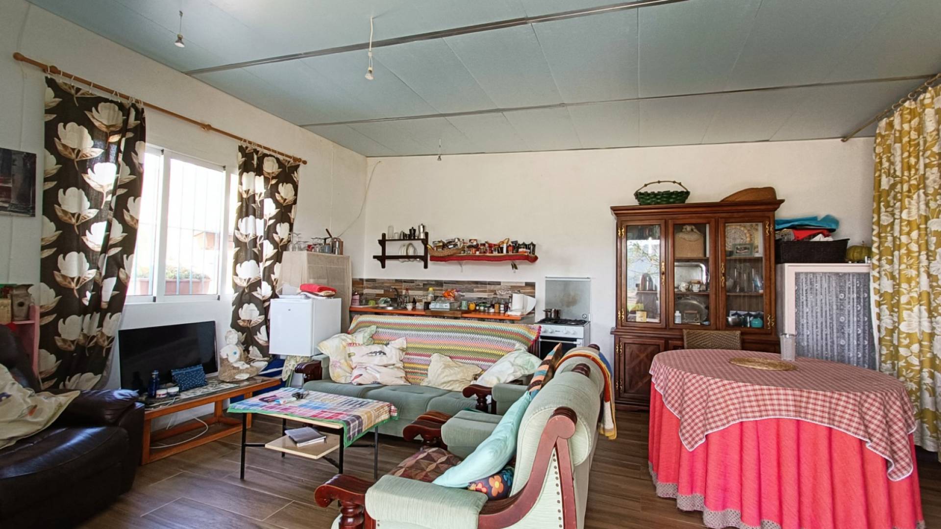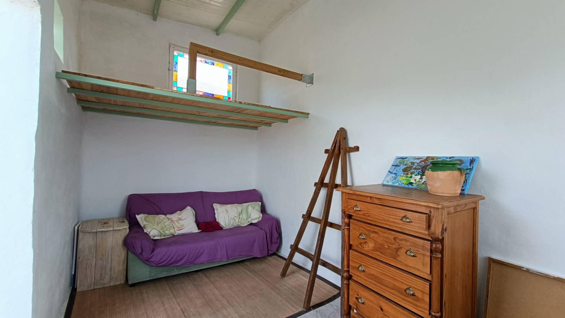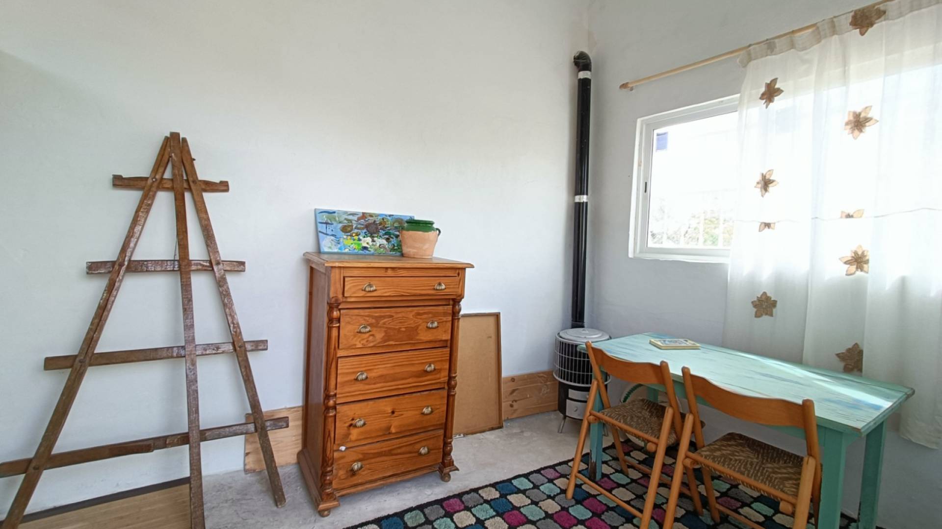 The plot is spread over various levels and planted with olive and fruit trees. At the top of the plot sits a cozy single-storey country house with an open-plan layout: kitchen open to the dining room, one bedroom, and one bathroom.