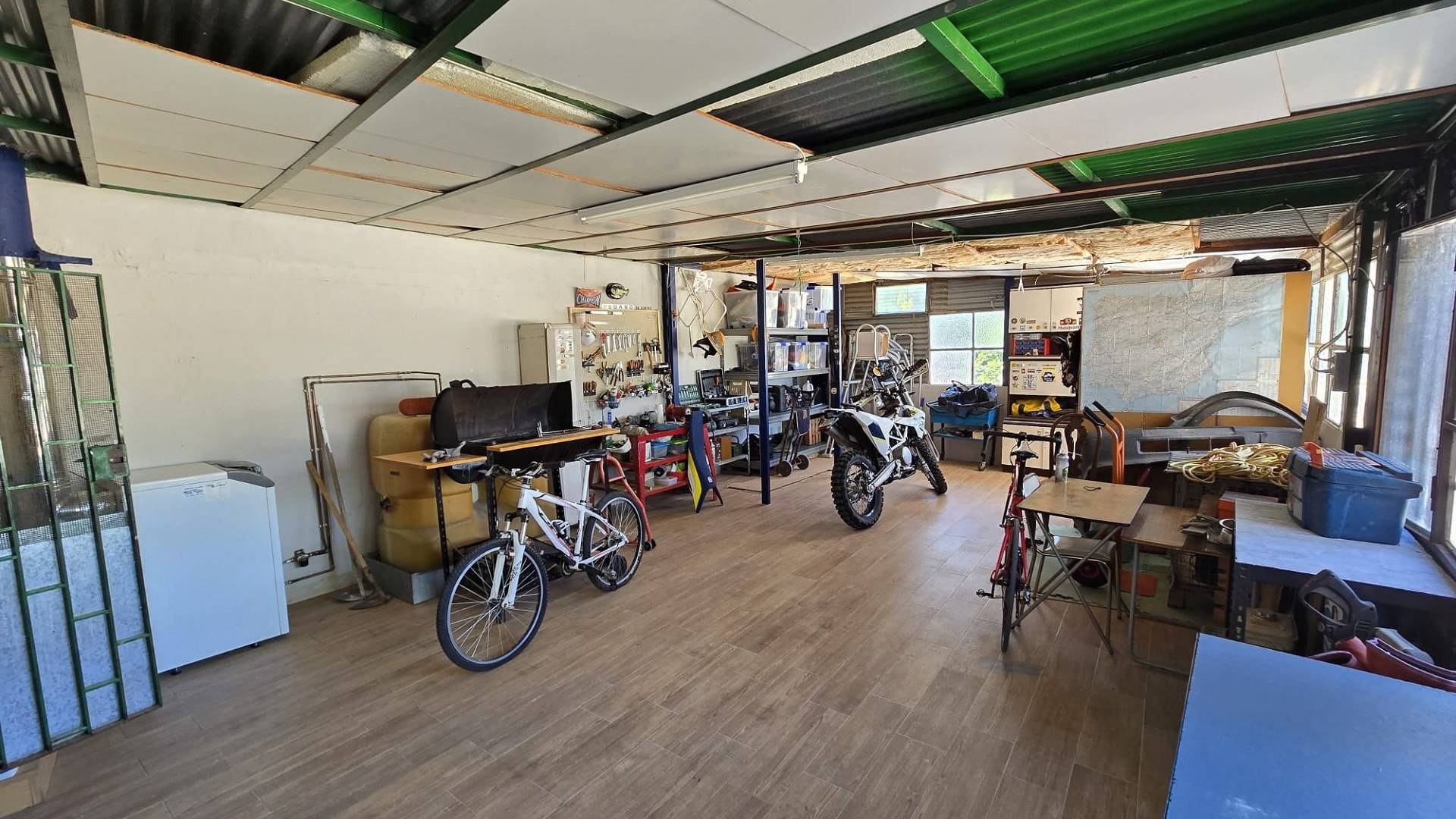 The ground floor features two comfortable double bedrooms, along with two generous lounges—one of which could easily be converted into a third bedroom if desired. The main kitchen is well-appointed and includes access to an internal staircase leading to the upper floor. There's also a second, smaller kitchen ideal for entertaining or serving outdoor gatherings. In addition to these living spaces, the ground floor also includes a spacious garage/workshop, a tiled utility or storage room, and several additional storage areas, offering ample functionality throughout.