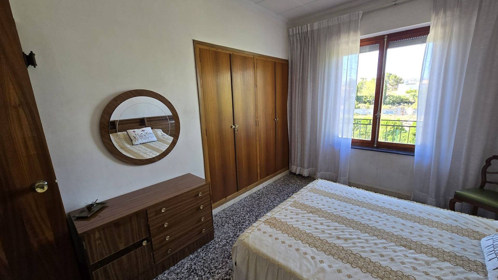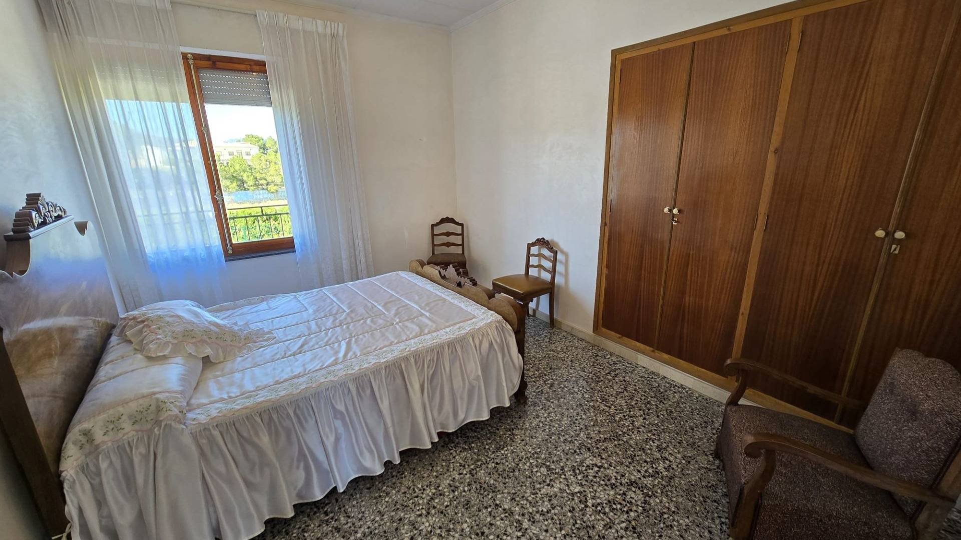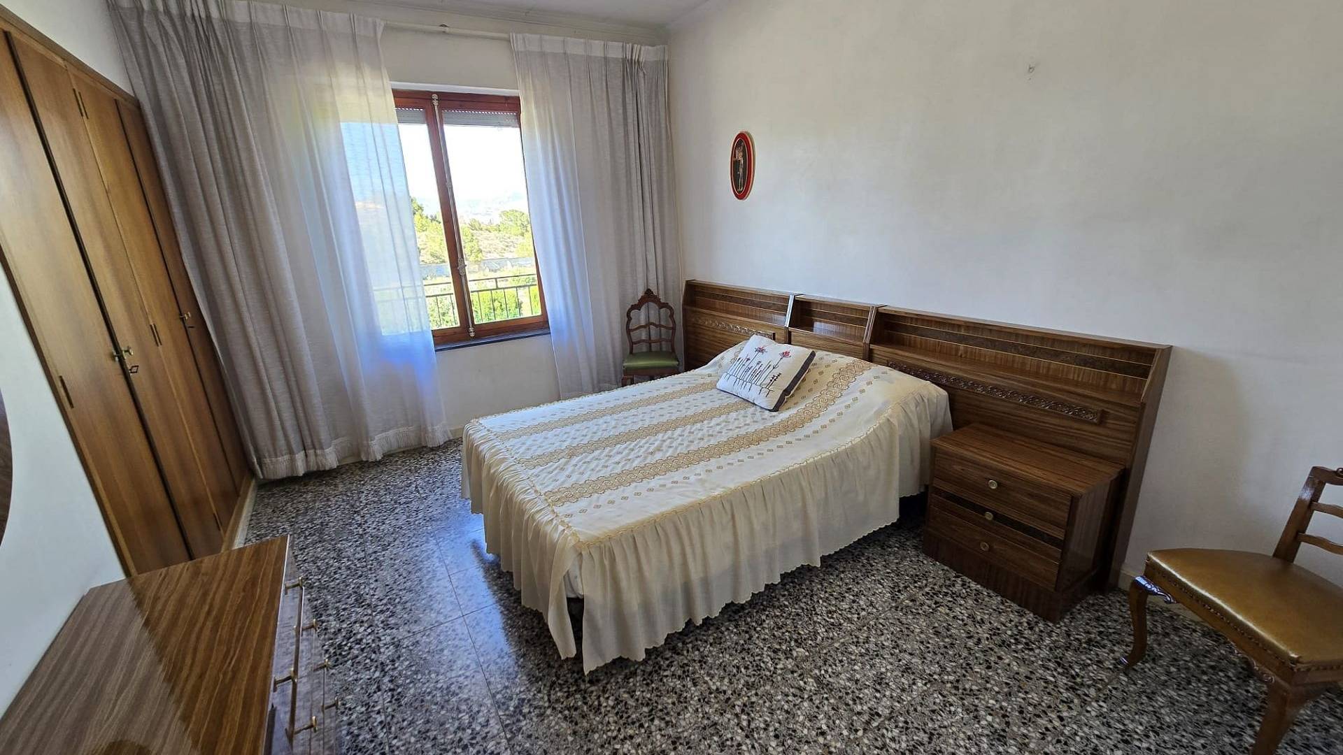 Upstairs, the home offers four further bedrooms, a family bathroom that would benefit from some modernisation, and a particularly large lounge currently housing a pool table. This floor also enjoys access via an external staircase and is surrounded by terraces that take full advantage of the beautiful views. With the simple addition of a door lock at the staircase, the two levels can easily be separated into two independent apartments—ideal for family members, guests, or tenants.