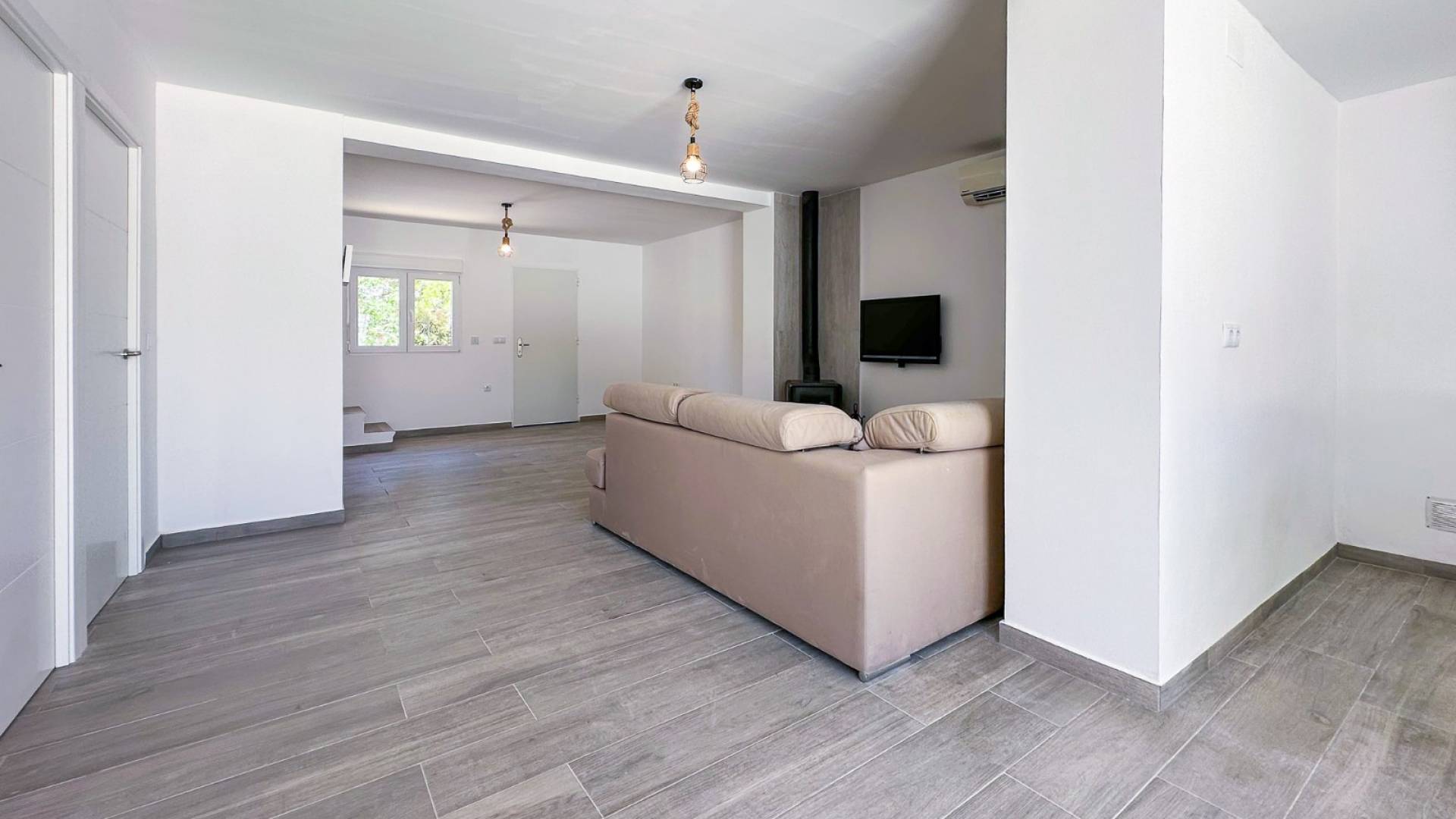 Windows and doors are high-spec uPVC with double glazing, and every shutter is electric and compatible with Wi-Fi and smart systems such as Alexa. Air conditioning is already installed on the ground floor, and a wood-burning stove adds comfort and warmth in cooler months.