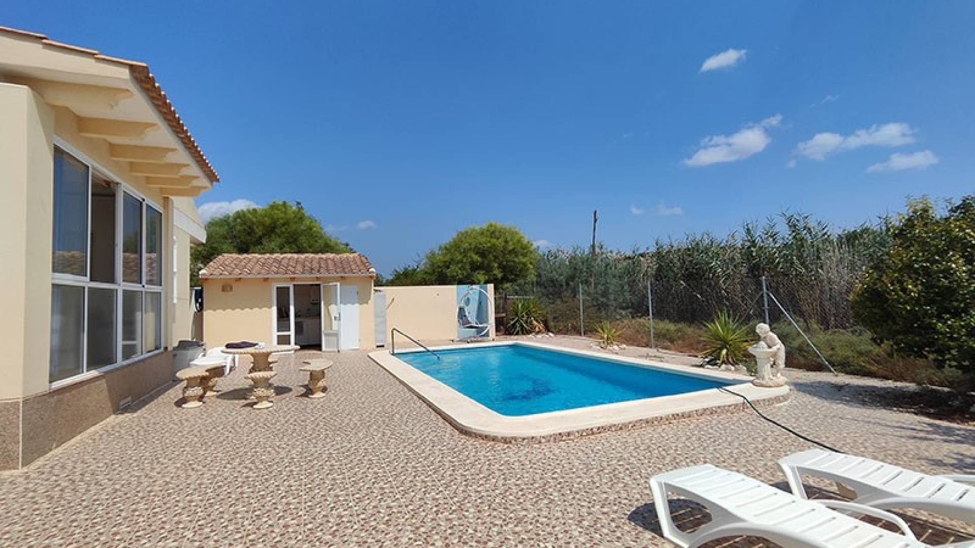 The villa has an enclosed veranda for the few cool days of the short Murcian winter, a beautiful living/dining room with air conditioning, a fireplace, a separate fully equipped kitchen, 3 bedrooms and 3 bathrooms (the master bedroom has its own private shower room).