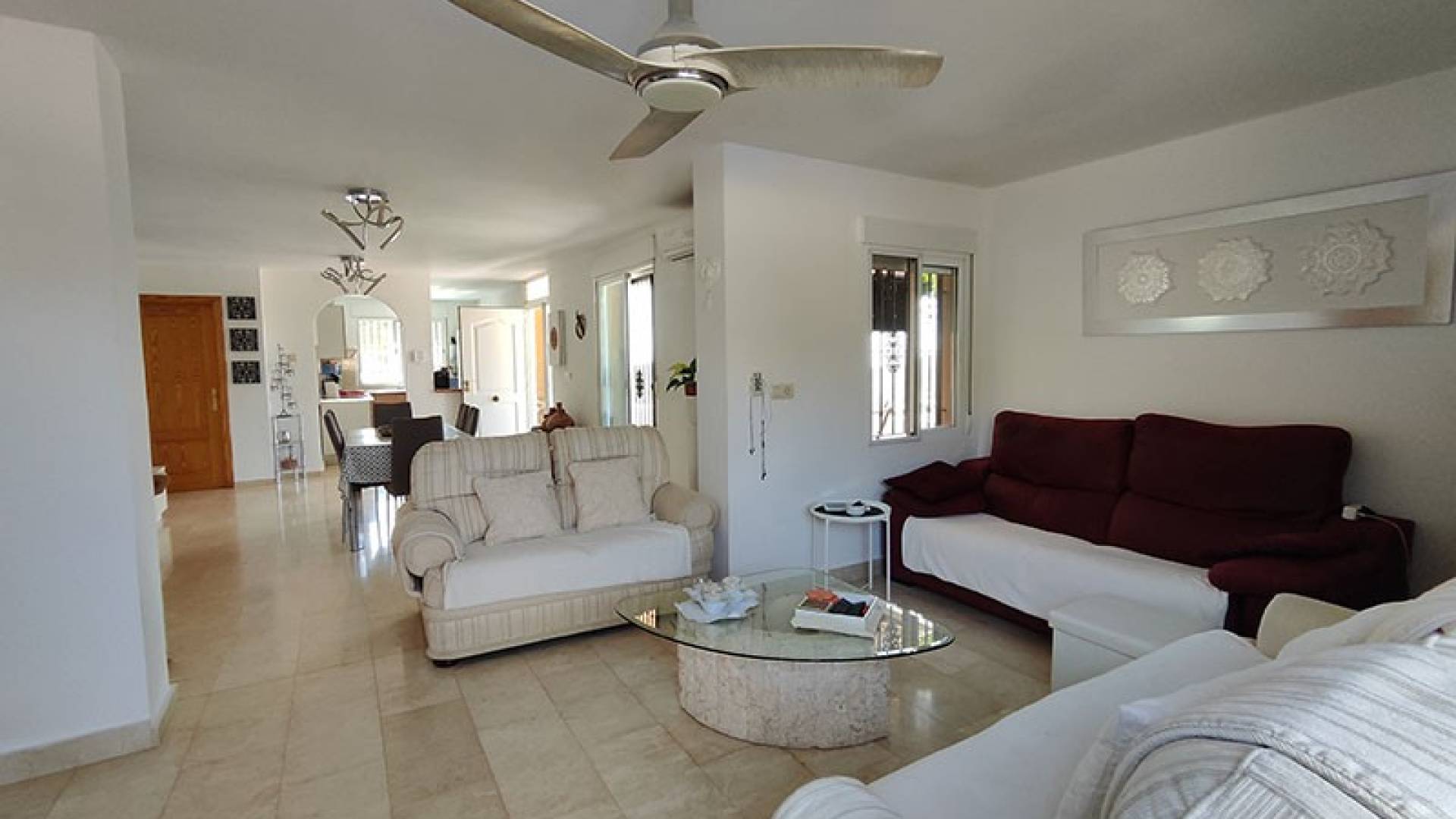 The living room and dining room are two beautiful rooms. The kitchen is fully equipped and in excellent condition, with storage space and a laundry area. The villa offers approximately 140m² of floor space.