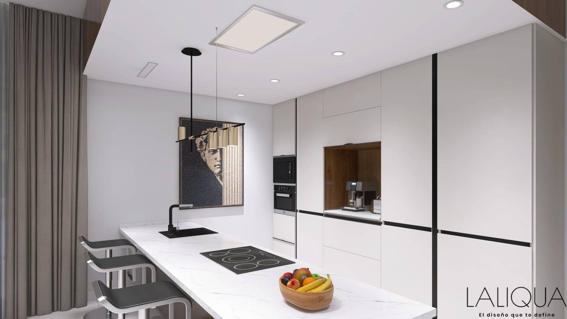 Fully equipped kitchen with cabinets and Silestone or similar countertop.