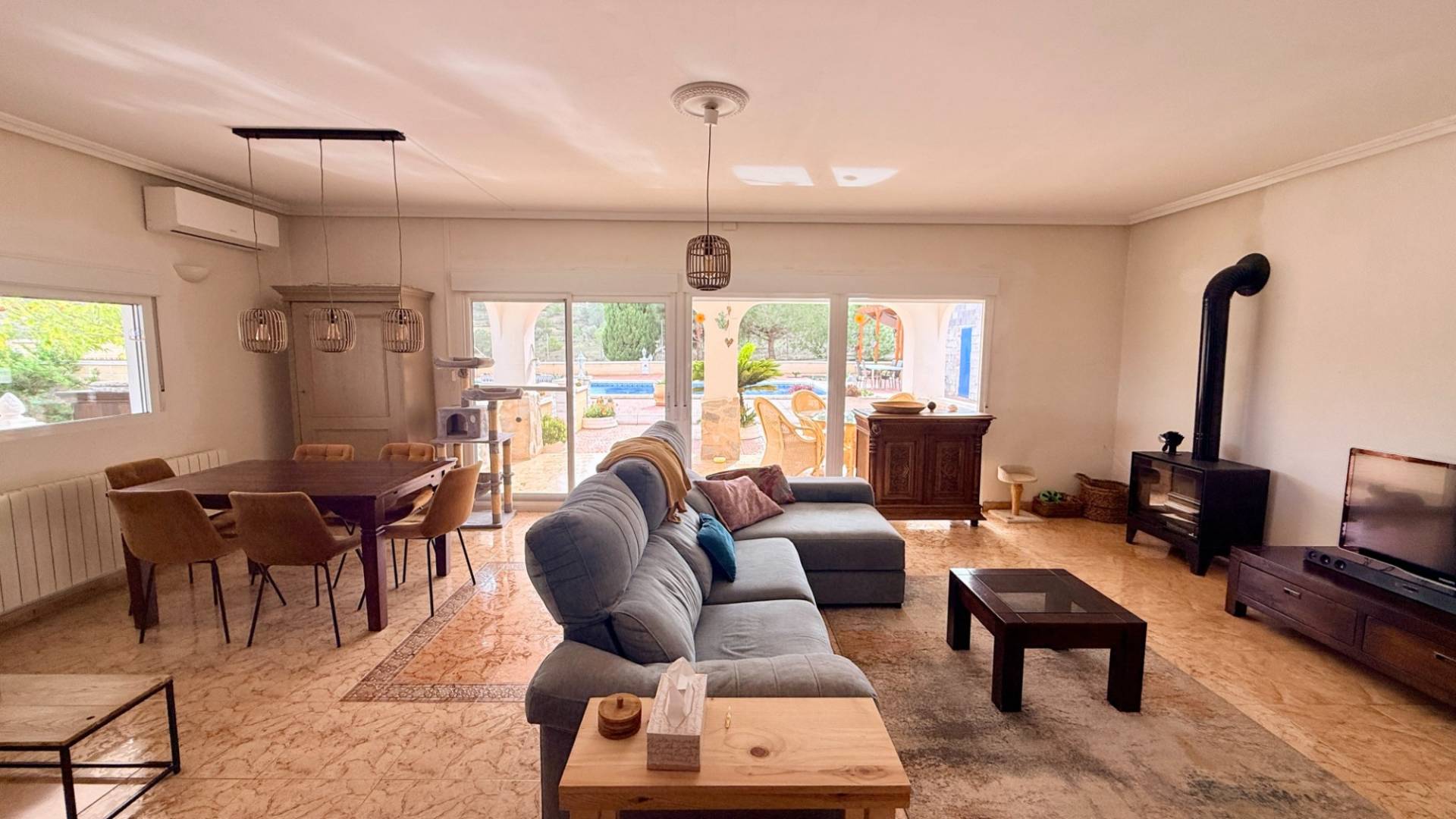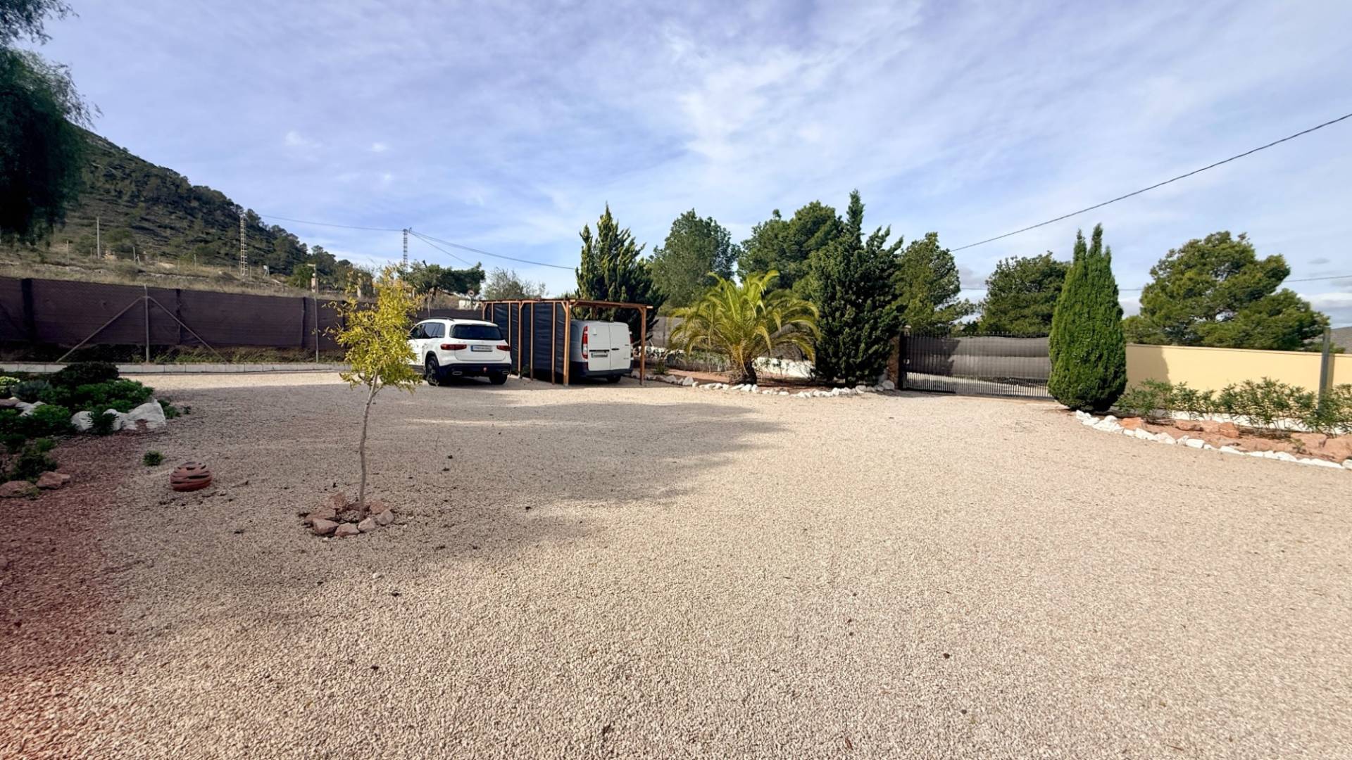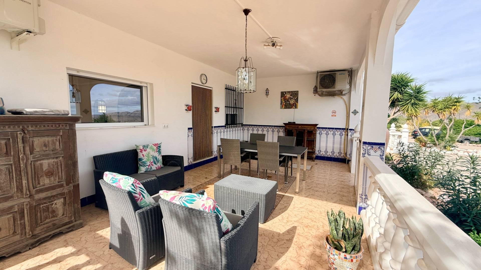 Perched in an elevated position overlooking the stunning Hondón Valley, this charming traditional Spanish finca offers panoramic views stretching from Murcia in the west to the mountains behind Alicante in the east. If you’ve ever dreamed of owning a spacious country home with character, modern comforts, and breathtaking views — this could be the one. Built in 1996, the villa blends classic Spanish architecture with contemporary features such as central heating, mains water, and a solar system. The fully fenced and gated plot spans nearly 5,000m² across two levels — the upper level with landscaped gardens and the villa itself, and a lower orchard with fruit trees. The Main Villa:Spread over two levels, the main house welcomes you with a bright entrance porch — ideal for dining or relaxing while admiring sweeping valley views. A second porch faces the pool terrace, perfect for summer evenings. Inside, a spacious open-plan lounge and dining room are filled with natural light thanks to floor-to-ceiling windows that open completely, blending indoor and outdoor living. You’ll find: Central heating, air conditioning, and high-speed internetA cosy log burner for winter nightsA galley-style kitchen with plenty of storageAn external summer kitchen and BBQ for outdoor cooking Through a wide hallway are three bedrooms — the master with en-suite shower room and direct garden access, a second double with fitted wardrobes, and a smaller third room perfect for an office or single bedroom. There’s also a guest bathroom with a bath and a storage room. The Guest Apartment:Accessible via an external staircase, the first-floor guest studio apartment offers independent accommodation with a kitchenette, dining and sleeping area, a separate shower room, and a private balcony with magnificent views — ideal for visiting guests, teenagers, or use as a creative workspace. The Gardens and Pool:The centrepiece of this property is one of the largest pools in the Hondón Valley — an impressive 14m x 6m, offering nearly 90m² of water. The vast surrounding terrace provides plenty of space for entertaining or sunbathing. Behind the pool is a summer kitchen with shaded dining, a poolside shower and toilet, plus several storage areas, including one housing the inverter for the solar system. The landscaped gardens feature mature plants and trees, and a shaded parking area completes the setting. With total privacy and 320 days of sunshine each year, this finca offers the best of Mediterranean living. Connected to mains water and electricity, the property includes 14 solar panels generating 4.6kW and a 5.6kW inverter. Heating is provided by an oil-fired central system. Just five minutes from Hondón de las Nieves, where you’ll find bars, restaurants, shops, and local markets, and around 35 minutes from the coast and airport, this is a home where countryside tranquillity meets modern convenience. Would you like to know more about the property, the Hondón Valley, or the buying process in Spain? We’re happy to help every step of the way.