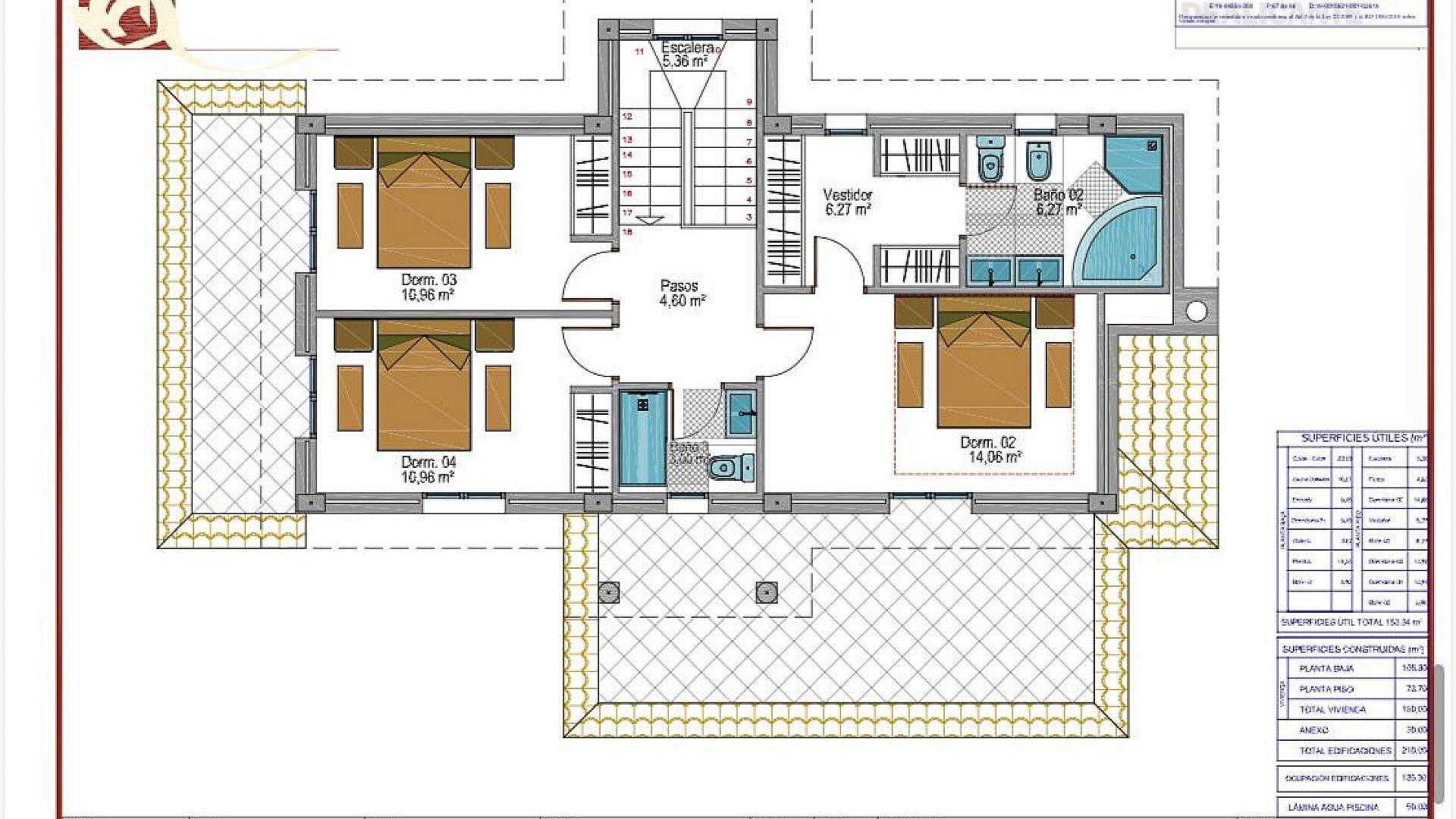 The house is 180 m2 with 3 or 4 bedrooms and 3 bathrooms, also you have a one bedroom annex-guest house of 32m2 with bedroom , bath room and small living room-kitchen.