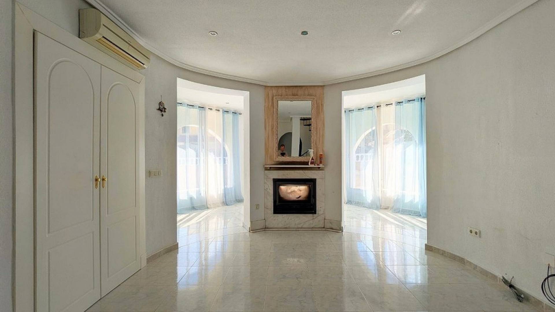 Spacious living areas : The bright, open-plan living room features a central fireplace, creating a cozy atmosphere. Adjacent is a generously sized dining area, perfect for entertaining family or guests.