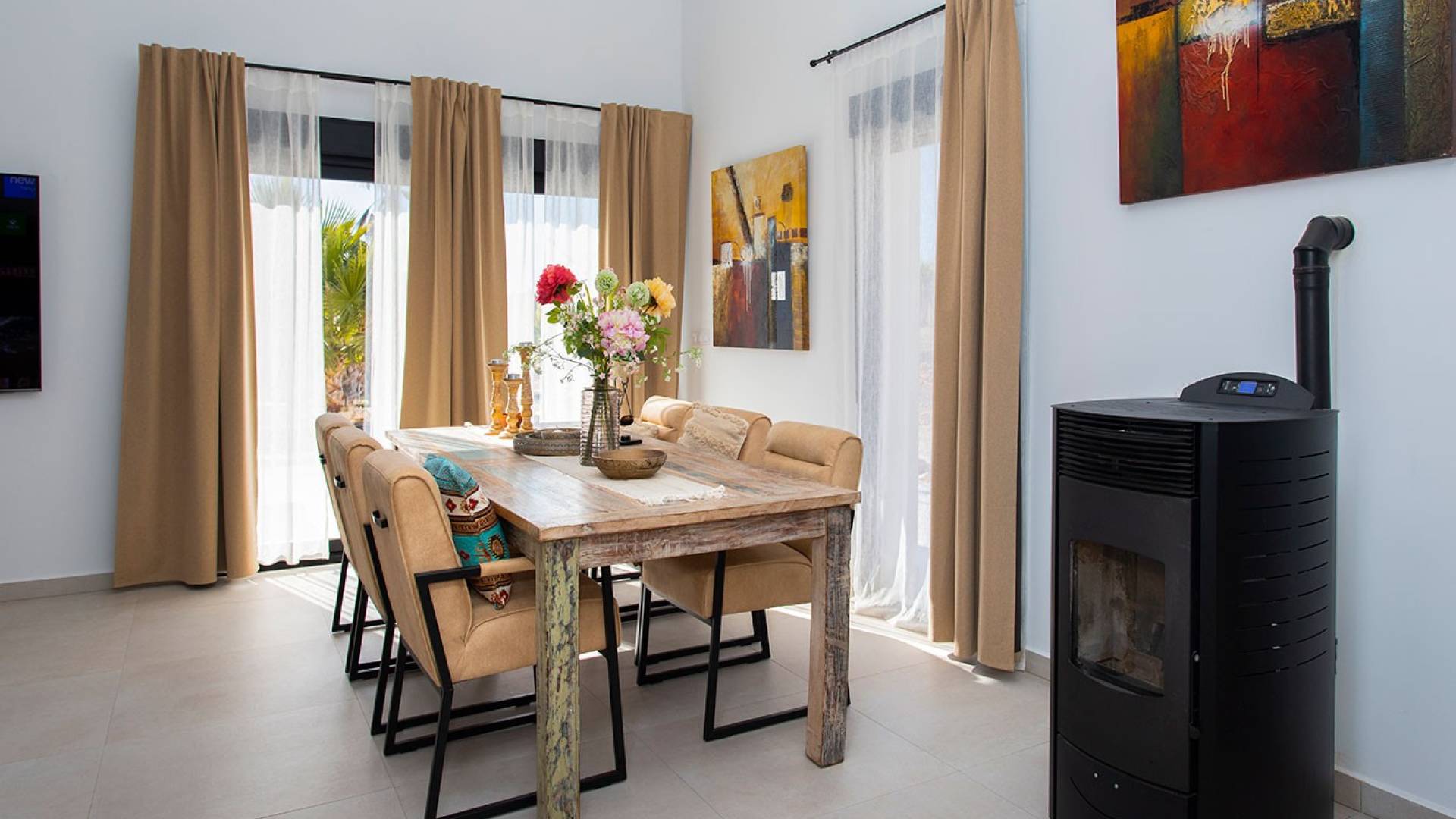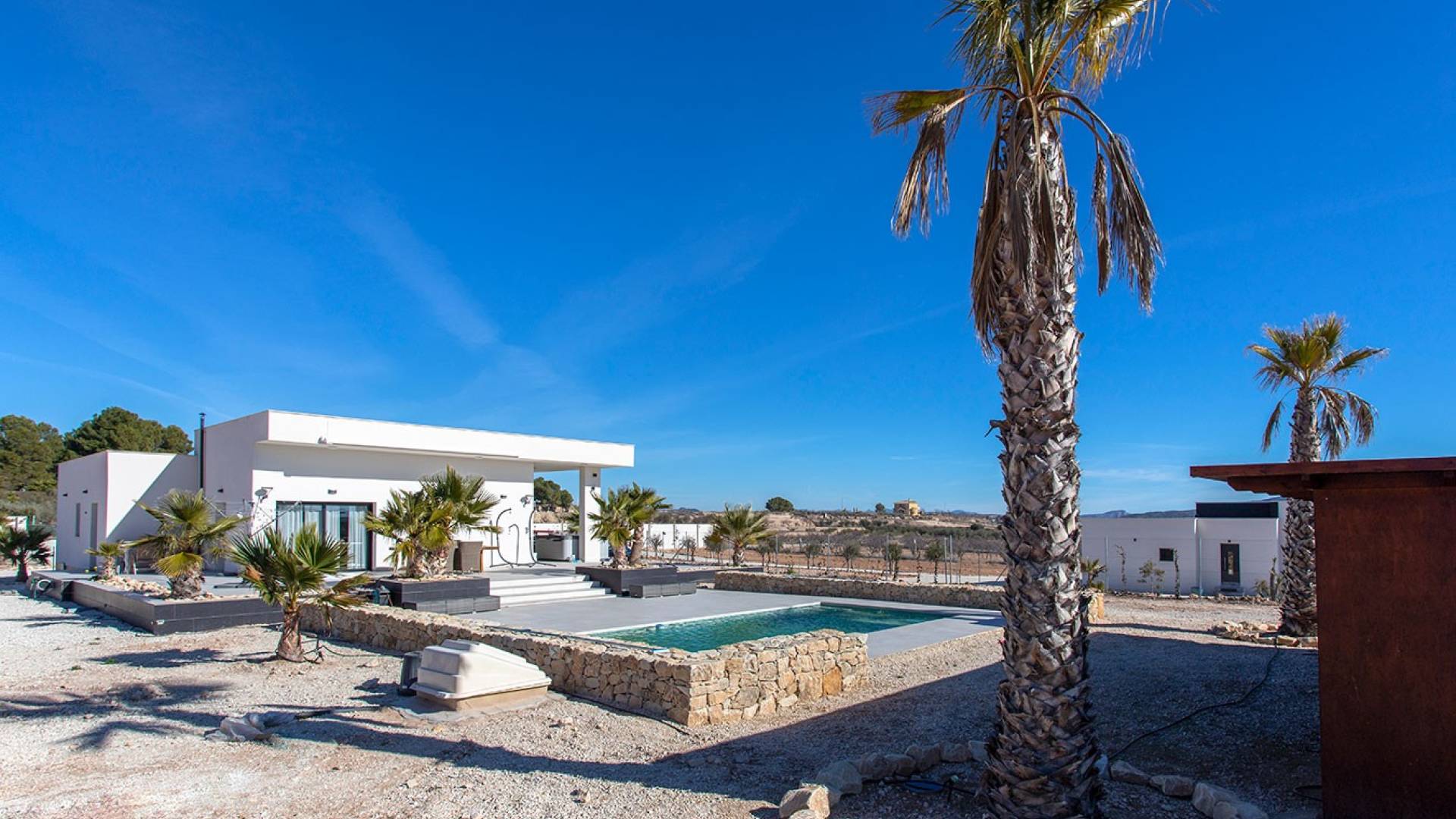 Modern Luxury Villa for Sale in Pinoso This stunning detached villa is located in the highly sought-after area of Pinoso and offers the perfect combination of modern comfort, privacy and breathtaking natural surroundings. Set on the campo yet fully connected, this property is ideal as a permanent residence or a luxurious holiday home. The villa features 4 spacious bedrooms and 2 modern bathrooms, all finished to a high standard. The interior is contemporary and stylish, with a bright and open layout that creates a comfortable and welcoming atmosphere throughout the home. Outside, the property truly shines. A private swimming pool, jacuzzi on the terrace and a wooden covered terrace located next to the swimming pool provide the perfect setting for relaxation and entertaining. The garden is currently being landscaped and will be finished with palm trees, Mediterranean planting, elegant tiling and natural stone, creating a beautiful and harmonious outdoor space. The views from the property are simply phenomenal, offering uninterrupted panoramas of the surrounding countryside and mountains — a rare sense of peace and space. Access to the villa is via an electric gate and a long private driveway, ensuring privacy and a grand entrance. For added peace of mind, the property is fully connected to mains water and electricity, and includes a septic tank with a valid license, making it a worry-free choice for campo living. In summary: a modern and well-equipped villa with luxurious outdoor features, spectacular views and all essential utilities in place. A unique opportunity for those seeking quality, comfort and tranquility in one of the most popular inland locations. Highly recommended viewing. Don’t miss this opportunity.
