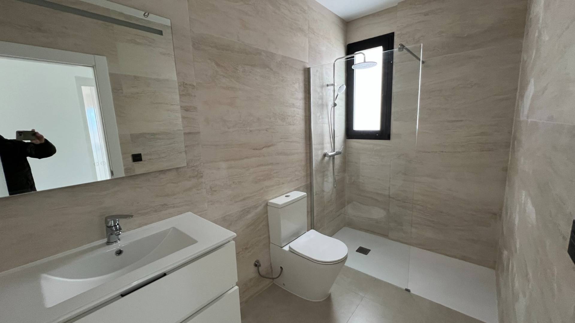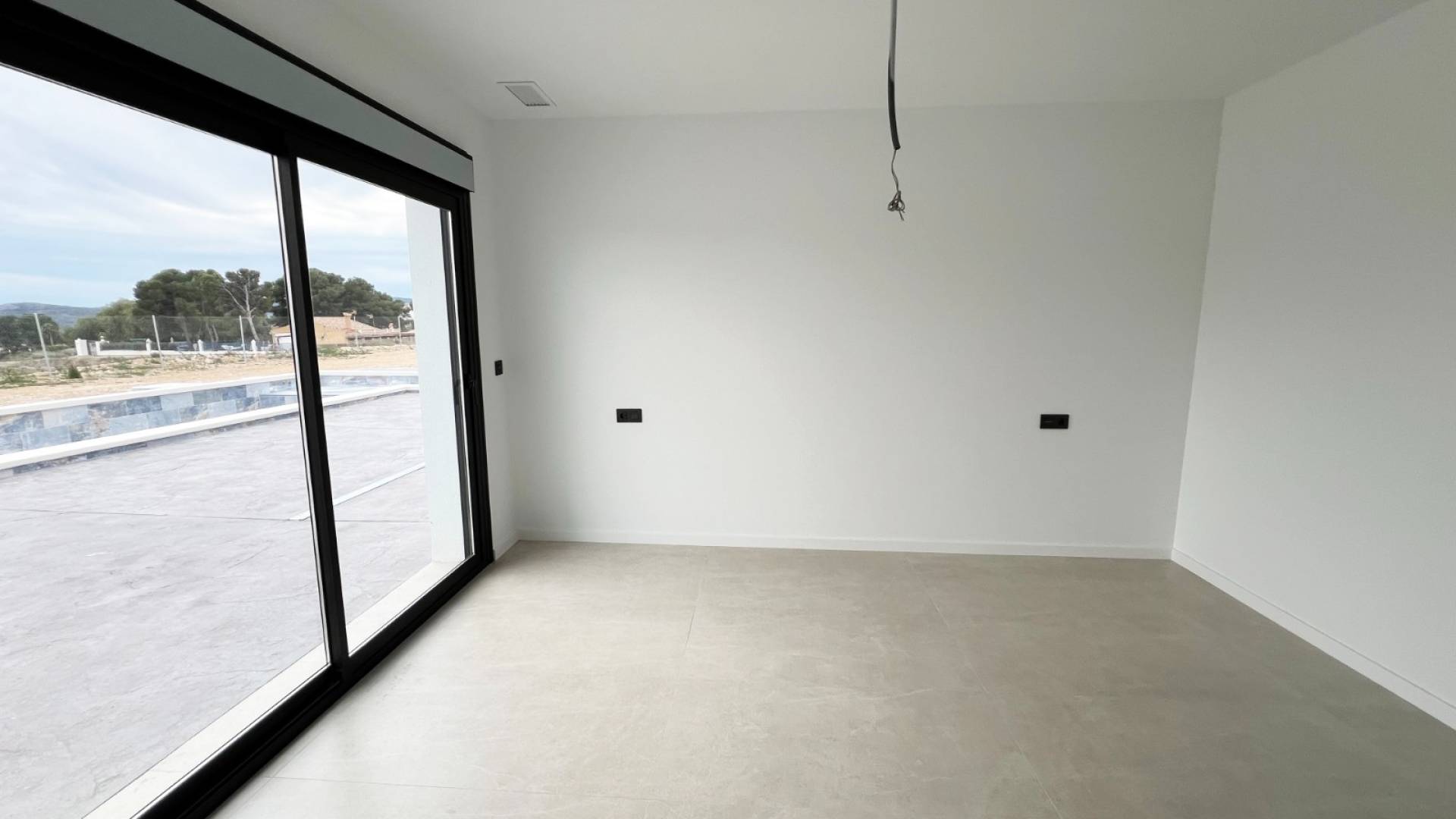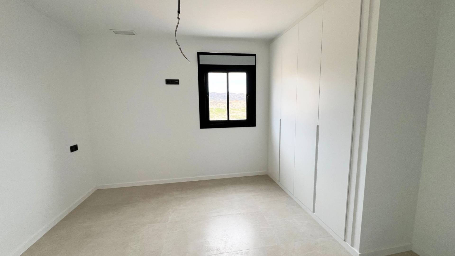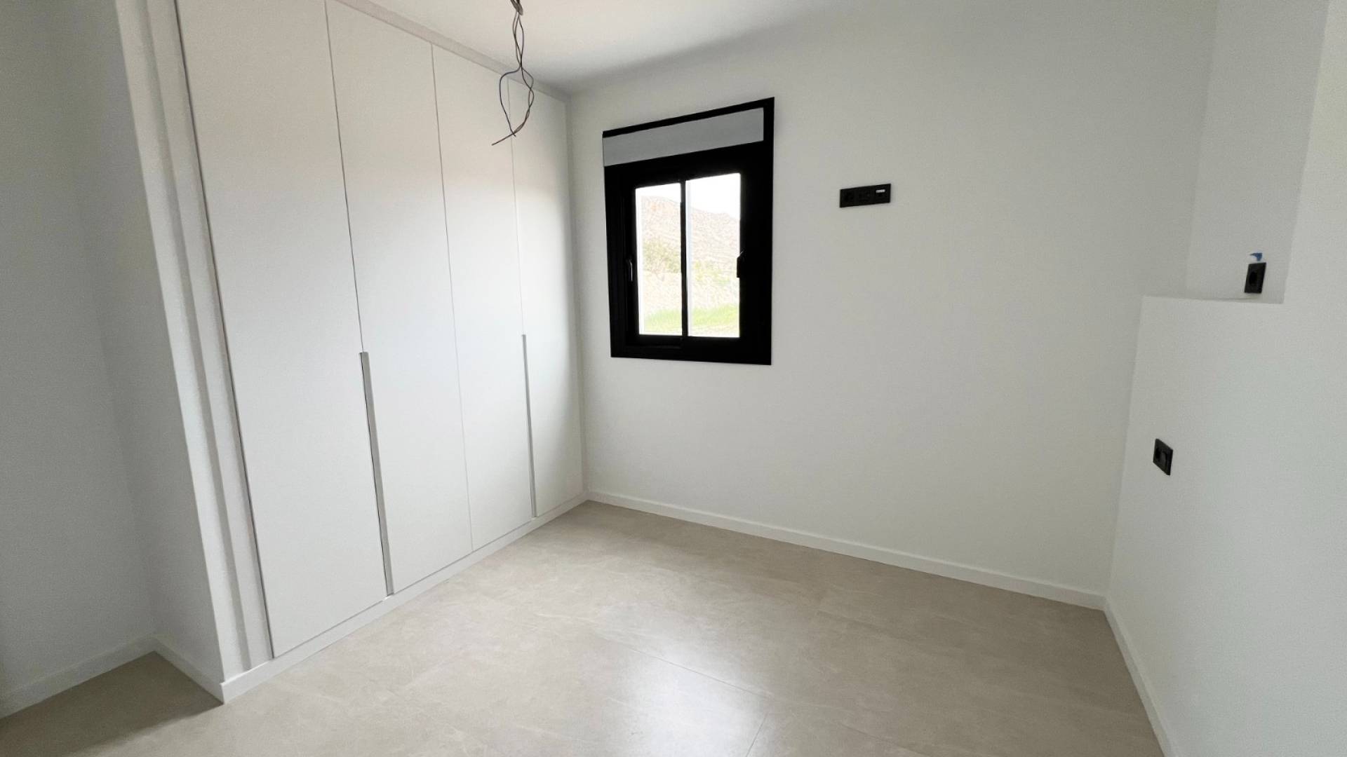 Premium interior and exterior design: Black aluminum carpentry with motorized blinds, Caliza Capri window sills, and Climalit double glazing.