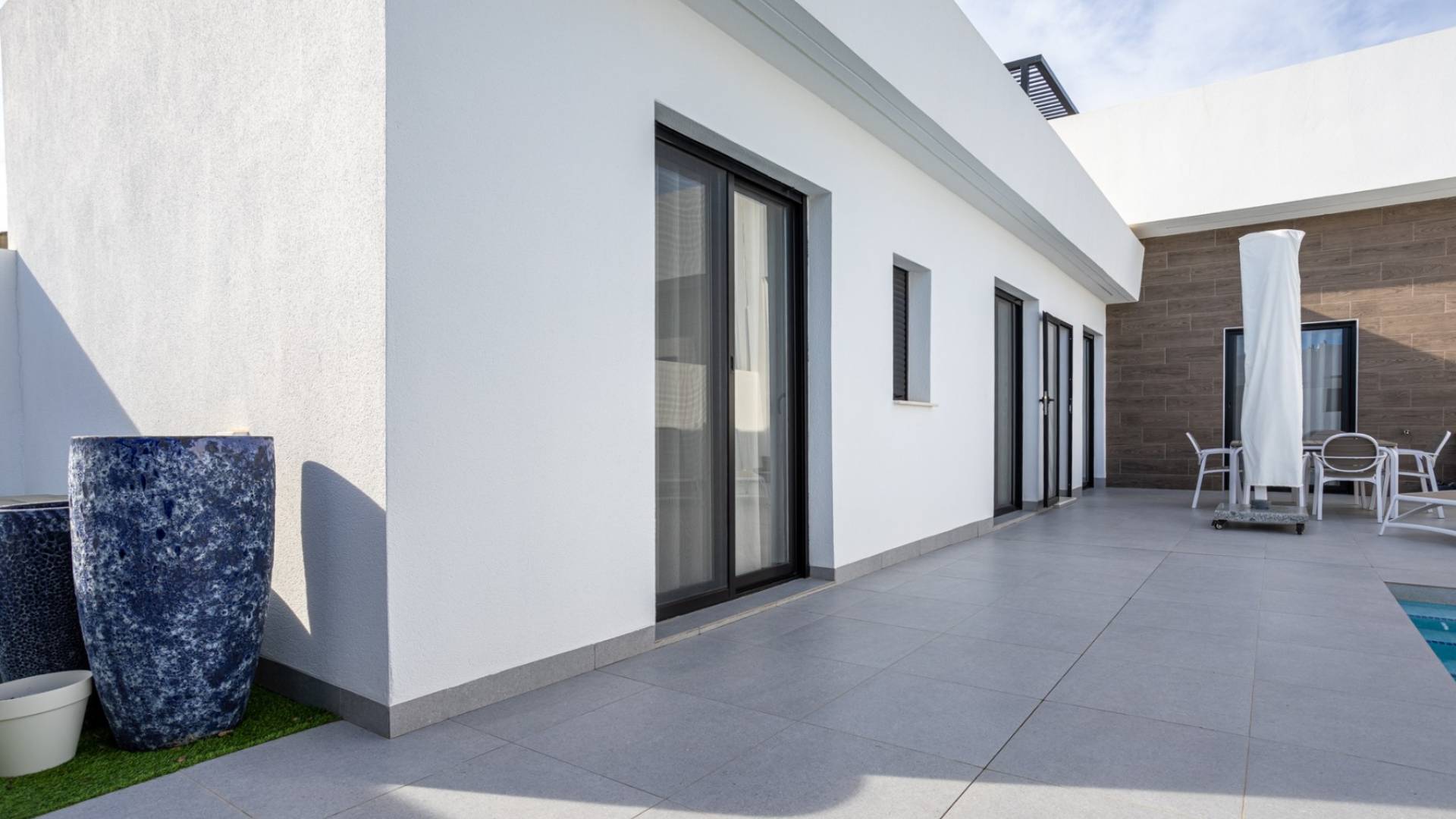 This charming detached villa offers the perfect balance of comfort, privacy, and Mediterranean living, situated in a quiet residential area of Torre-Pacheco, just minutes from all amenities. Built on a private plot of 151.71 m², the property has a built area of 85 m², all on one level. This makes the villa practical, accessible, and easy to maintain. Thanks to its east-facing orientation, the villa benefits from optimal natural light, making the interior bright throughout the day. Interiors, the property boasts three spacious bedrooms, all with fitted wardrobes, and two modern bathrooms, one of which is en-suite to the master bedroom. There is also a small laundry cupboard, both practical and discreet. The open-plan kitchen flows seamlessly into the living and dining area, creating a welcoming and functional space, ideal for both daily living and entertaining. The property is in excellent condition, ready to move into, and is sold fully furnished, including appliances and air conditioning for year-round comfort. Outdoors, this villa truly shines. The property boasts a private swimming pool surrounded by a well-proportioned garden, perfect for relaxing, sunbathing, or al fresco dining. A covered porch provides a shaded seating area, while the terrace and solarium offer additional space to soak up the sun, entertain, or simply unwind with unobstructed views and privacy. There is a shaded area on the upper level of the solarium, along with an outdoor kitchen, ideal for barbecues. The property also includes a private parking space on the plot and an intercom system for added security. Prime LocationBeaches: 20 minutesMurcia International Airport: 15 minutesLeisure areas, shops, and restaurants: 5 minutesGolf courses: 5 minutes This property is ideal as a permanent residence, holiday home, or investment property, thanks to its excellent location, outdoor space, and ready-to-move-in condition. A fantastic opportunity to enjoy the Costa Cálida lifestyle with comfort, sun and privacy.