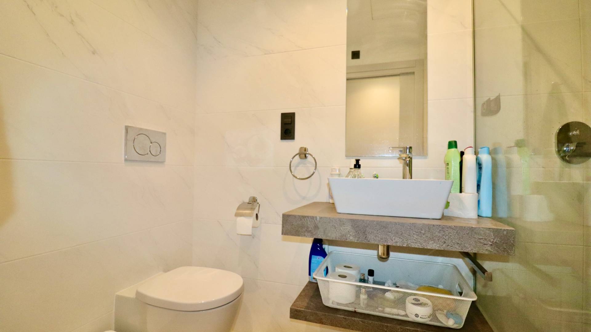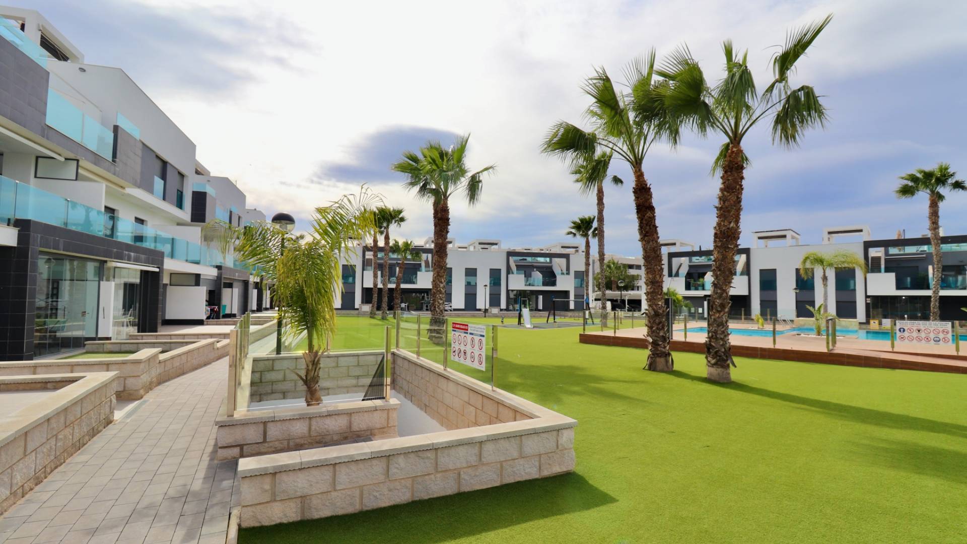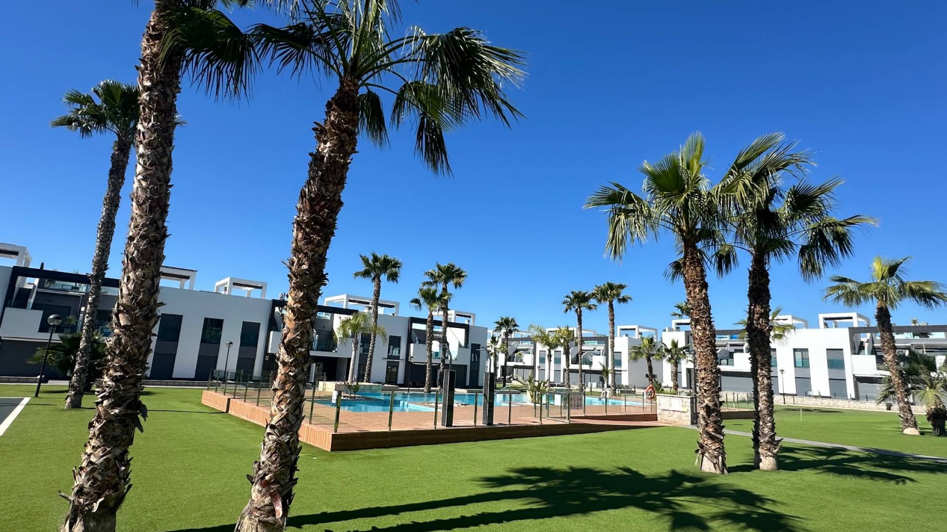 This modern apartment is located in a quiet, recently developed residential area near Guardamar del Segura, a popular seaside resort on the Costa Blanca. Nearby you will find all kinds of amenities such as cozy cafes, shops, restaurants, boutiques and a beautiful nature reserve with hiking trails towards the charming harbor. The wide sandy beach of Guardamar is easily accessible and ideal for relaxing. The central location ensures that you can quickly reach other nice places, and golf courses and large shopping centres are also easily accessible. This makes this location perfect for a wonderful holiday or to live permanently. The apartment complex was recently built and offers plenty of peace and comfort. Residents can make use of various luxury facilities, including a large outdoor pool with landscaped gardens, and a wellness with a lovely jacuzzi. There is also a private parking space at the apartment. The apartment itself is located on the ground floor 105 m2 and is easy accessible, there is also an elevator in the complex. You enter a bright living room with open kitchen. From the living room you step onto the spacious terrace, with a view of the beautifully landscaped, communal garden and one of the 2 large pools. The layout further consists of a master bedroom with en-suite bathroom and access to the terrace, 2 bedroom2, a separate bathroom and a practical storage/laundry room. Extras include air conditioning (hot/cold), electric shutters, video intercom, electric sun blinds, camera surveillance throughout the complex and full furnished delivery. Guardamar del Segura is known for its vast sandy beaches and pleasant boulevard. The centre offers many amenities and a relaxed atmosphere. Alicante airport is only a 30-minute drive away.