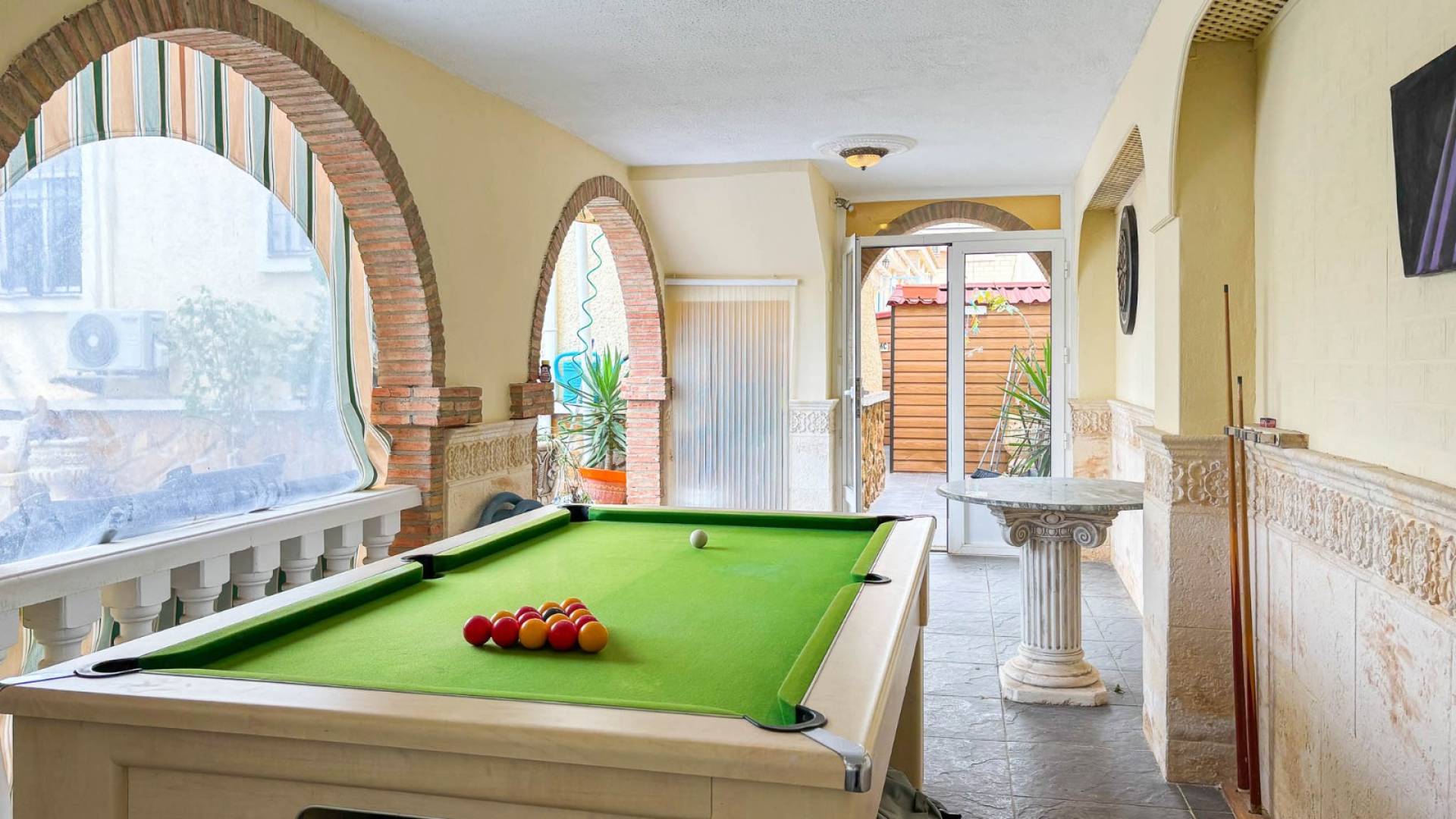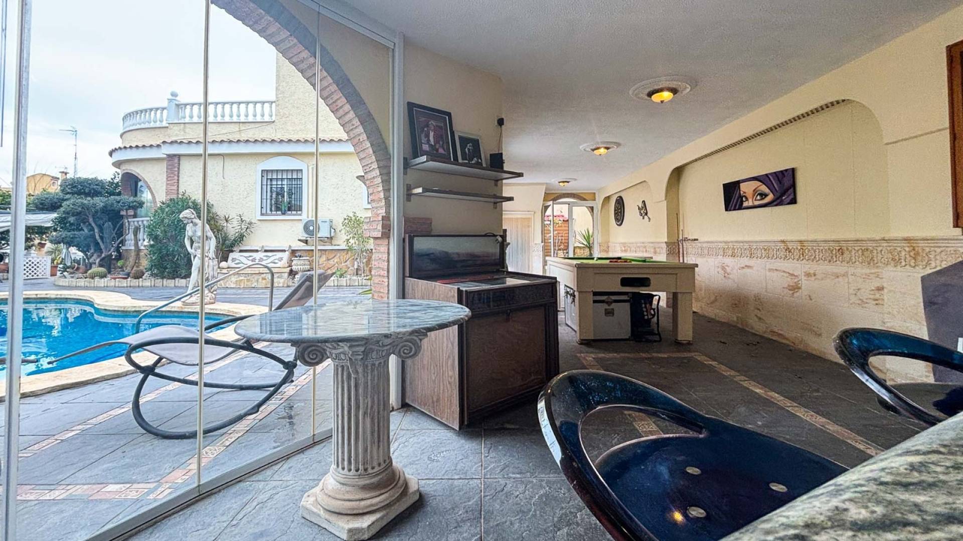This impressive villa is distributed over two floors. The ground floor comprises a spacious lounge-diner, a well-proportioned separate kitchen, utility room, two bedrooms, one en-suite bathroom and one WC. At the front of the property there is a glazed entrance terrace, while to the rear you will find a large partially glazed terrace, currently used as a games and entertaining area with a pool table and bar, overlooking the swimming pool.