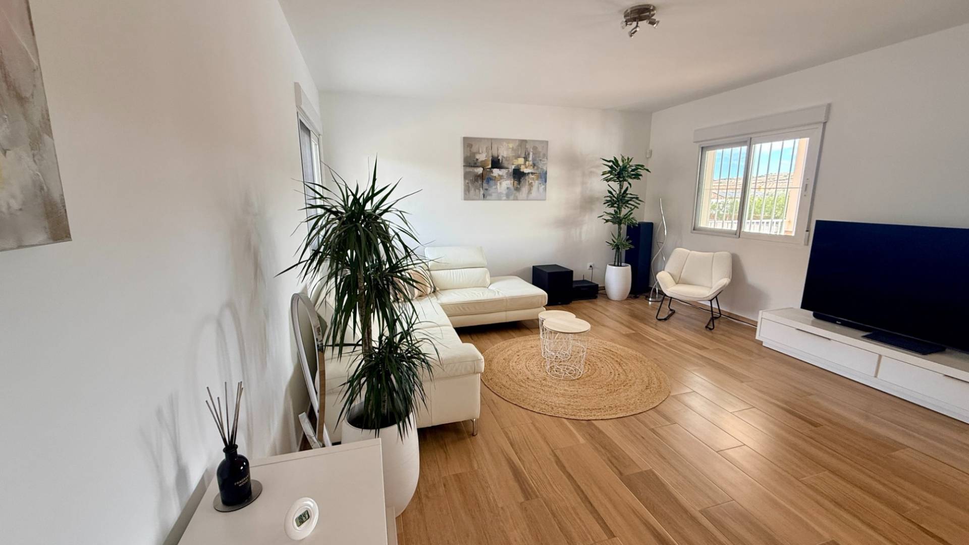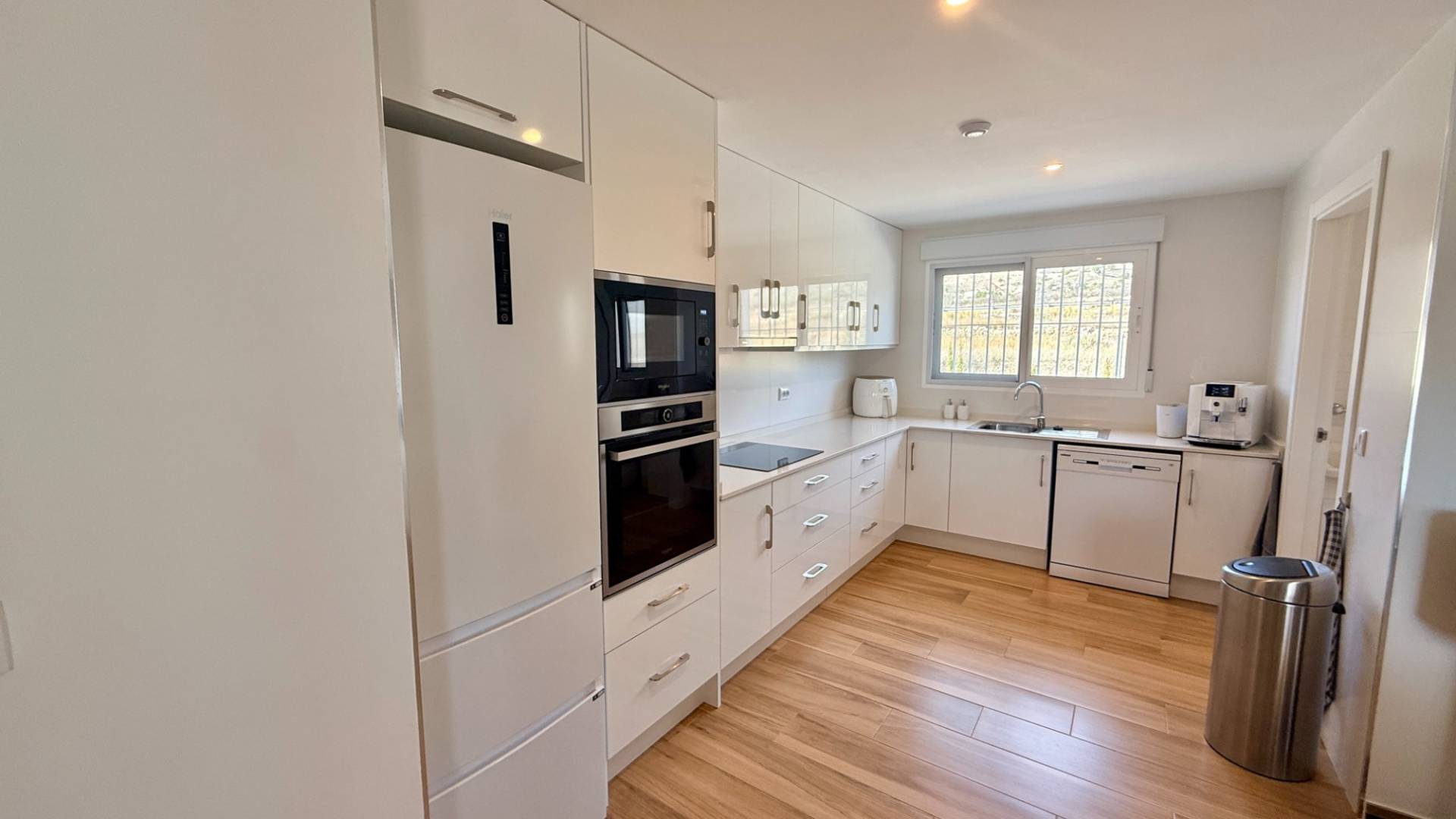 How would you use a villa like this? Long summer days by the pool, working remotely with super-fast internet, or simply enjoying peace, space and views from your own south-facing terrace? Built in 2022 and presented in as-new condition, this modern villa sits on a fully fenced 5,500m² plot, overlooking terraced almond groves and the rolling, forested hills of Murcia. Privacy, light and comfort are the defining features here. Inside, the home is bright and welcoming, with an open-plan lounge and dining area that flows effortlessly out to a large covered south-facing porch overlooking the pool. The contemporary kitchen is fully fitted with built-in appliances, generous work surfaces and excellent storage, while a separate utility/laundry room adds everyday practicality with direct access outside. The accommodation is flexible and well thought out: Three double bedrooms, all with fitted wardrobesMaster bedroom with en-suite bathroomGuest bathroom with modern walk-in showerIdeal setup for guests, home office or family living Outside is where this villa really shines. Accessed via a remote-controlled sliding gate, a long gravel driveway lined with olive trees leads you through the plot, which is home to around 120 olive trees. The focal point is the 10m x 5m private saltwater swimming pool, surrounded by a generous sun terrace and a pergola providing welcome shade on the hottest days. Can you picture relaxed afternoons poolside, evening swims at sunset, or hosting friends under the pergola with the hills as your backdrop? Key external features include: Fully fenced 5,500m² plotSaltwater pool (kinder on skin and eyes, lower chemical use)Large sunbathing terrace and shaded pergolaDouble garage with two electric up-and-over doorsPotential space for workshop, storage or future conversion The villa is well equipped for year-round living, with upgraded mains electricity (7 kW), mains irrigation water, a 12,000-litre drinking water deposit, ducted hot and cold air conditioning throughout, solar hot water heating and super-fast fibre optic internet at 1,000 Mbps. The entire plot is fully irrigated, making maintenance straightforward. If you’re looking for a modern, low-maintenance villa with space, privacy and open views already in place, how would this property fit into your lifestyle?