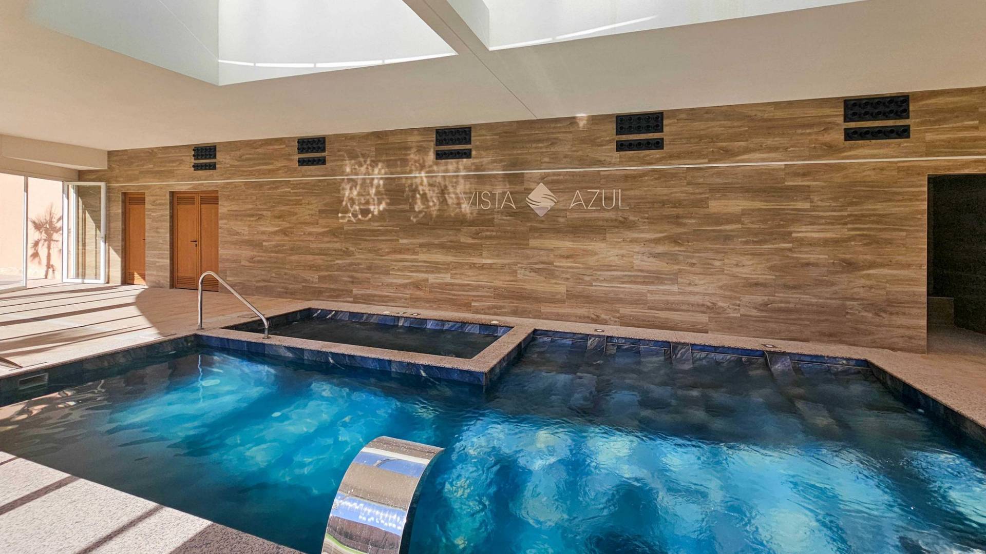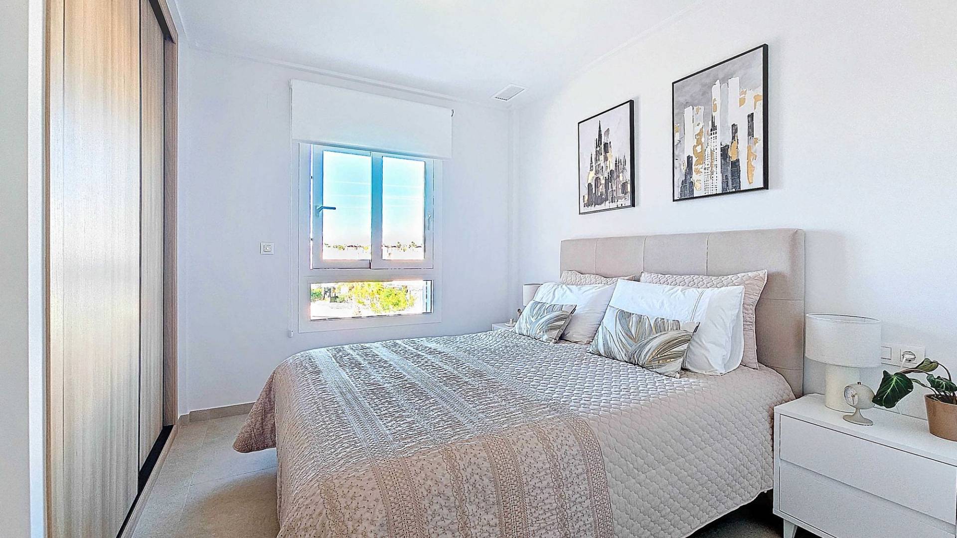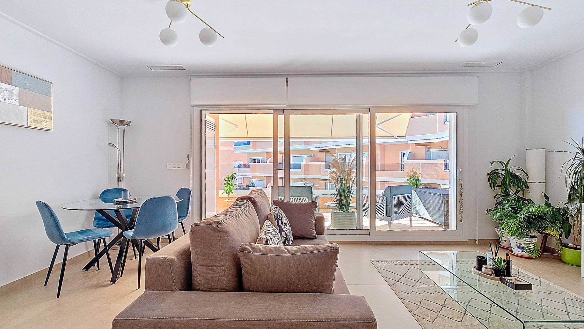 Living in a beautiful new apartment in ‘Vista Azul XXXVII Spa Nature’ in the El Raso urbanization, with spectacular views of the lagoons and close to the beaches of Guardamar del Segura. Guardamar del Segura is just a 25-minute drive from Alicante airport and is known for having the warmest waters of the Spanish Mediterranean Sea, as well as mild winters. The surrounding area of the residential complex offers a wide range of amenities, including shops, supermarkets, bars, restaurants, golf courses, and beaches. The nearby protected nature reserve is perfect for walking and cycling, and it’s a well-known spot where thousands of migratory birds pass through every year. Outdoor Features The residential complex is still partially under development, but the building in which the apartment is located is fully completed. There are or will be several shared facilities such as a large outdoor pool with a children’s pool and Jacuzzi, a spa area with an indoor heated pool and sauna section, an outdoor area specially designed for children, an outdoor gym, pétanque courts, and a putting green. The complex is located on a gated plot and is only accessible to residents. In addition to all the mentioned facilities, there are several well-maintained green zones, providing plenty of space for everyone to relax and enjoy. Indoor Features The property has been in the possession of the current owners for a very short time, so it is essentially like new. The apartment is fully ready for use as a vacation home, but it is also ideal for permanent living. The apartment is south-west facing, located on the second floor, and has a lift. Through the hallway (with storage space) and corridor, you access the open modern kitchen, which is fully equipped and features a cozy breakfast bar. It connects to the spacious living room. The sliding door to the adjoining large terrace provides plenty of natural light. The three bedrooms also benefit from great natural light and feature large windows and built-in wardrobes. There are also two modern bathrooms, one of which is en-suite. The separate bathroom has additional storage space. Facilities - The apartment has its own spacious parking space in the garage (included in the price). - There is a storage unit on the terrace with the boiler and washing machine. - The entire property is fitted with electrically operated shutters. - The apartment has central air conditioning (hot and cold). - The terrace is equipped with an automatic sunshade. - The finishes throughout the property are of high quality. A large part of the new furniture can be taken over, making the property ready to enjoy life under the Spanish sun. Don’t miss this opportunity and schedule a viewing today! This property is listed exclusively, which means all documents have been checked in advance and everything is either in order or can be arranged.